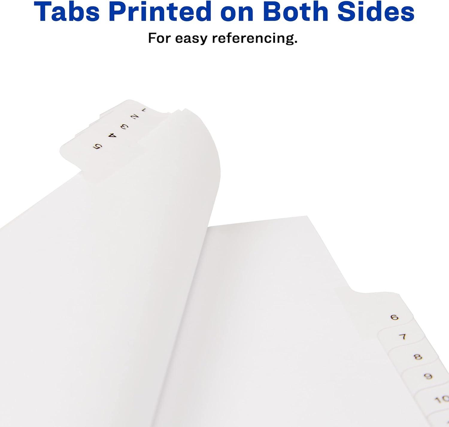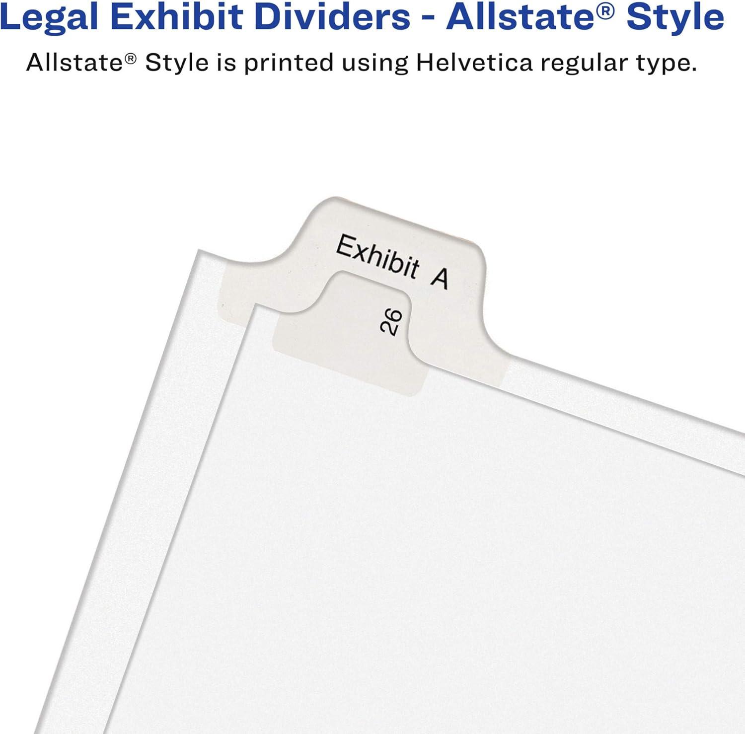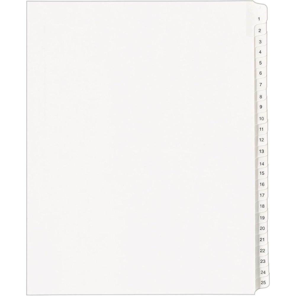 Quickly sort piles of legal documents and notes alphabetically with Avery 01701 1-25 legal exhibit dividers with Allstate-style design. Printed in numerical order with one number per tab, each tab is also printed on both sides for better visibility as you flip through your documents. The font of each tab is printed to match the Allstate style with Helvetica regular type. Avery dividers feature tabs reinforced with clear Rip Proof technology that ensures that the tabs can survive everyday wear and tear. Unpunched for universal compatibility, the binding edge is left intact so that they can be hole-punched to fit with any binding system. 1 set of 25 dividers is included. Whether you are an office admin maintaining a system of records, an attorney keeping track of notes or a paralegal organizing vital documents, Avery dividers are the perfect way to organize your life in style.