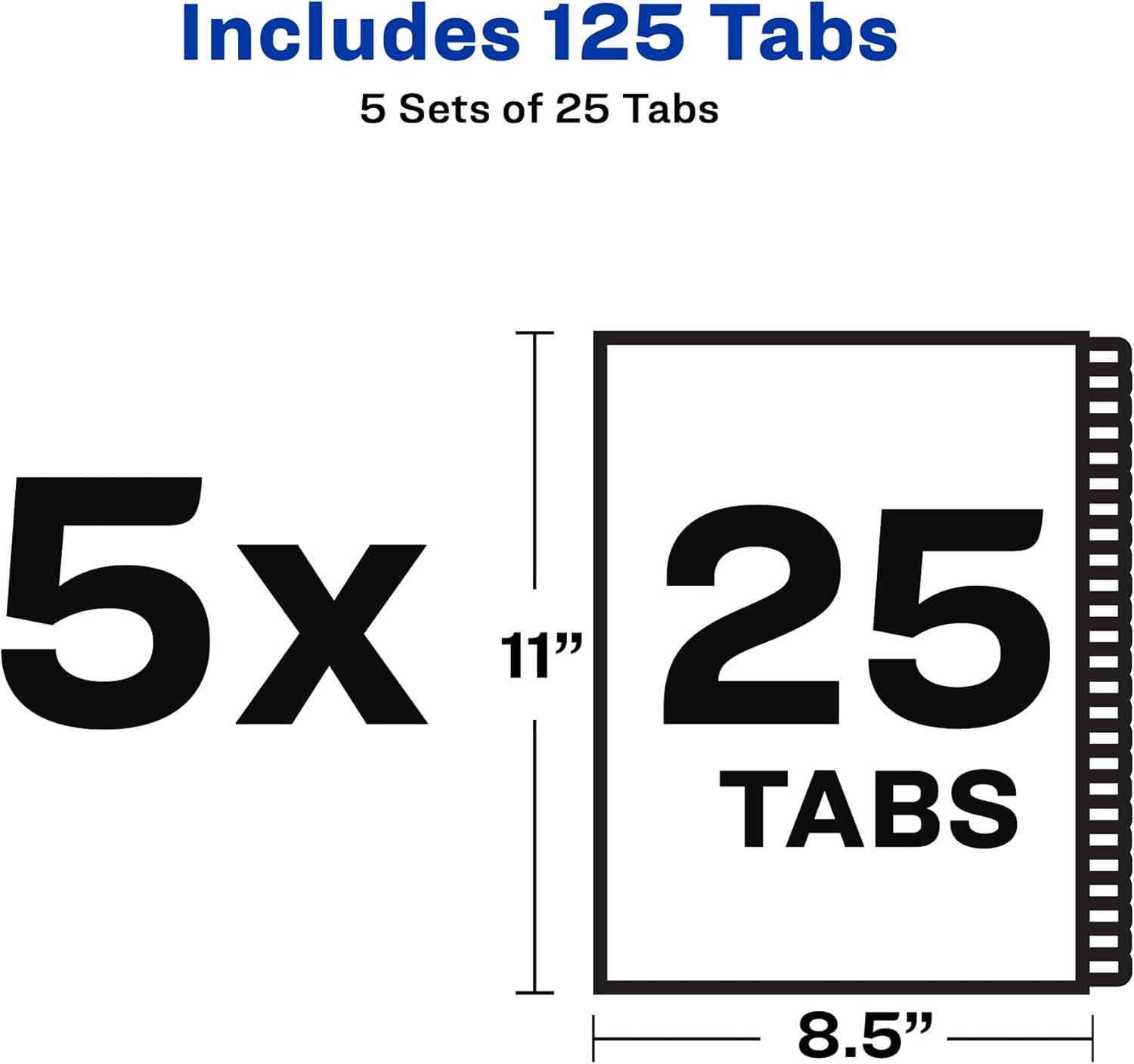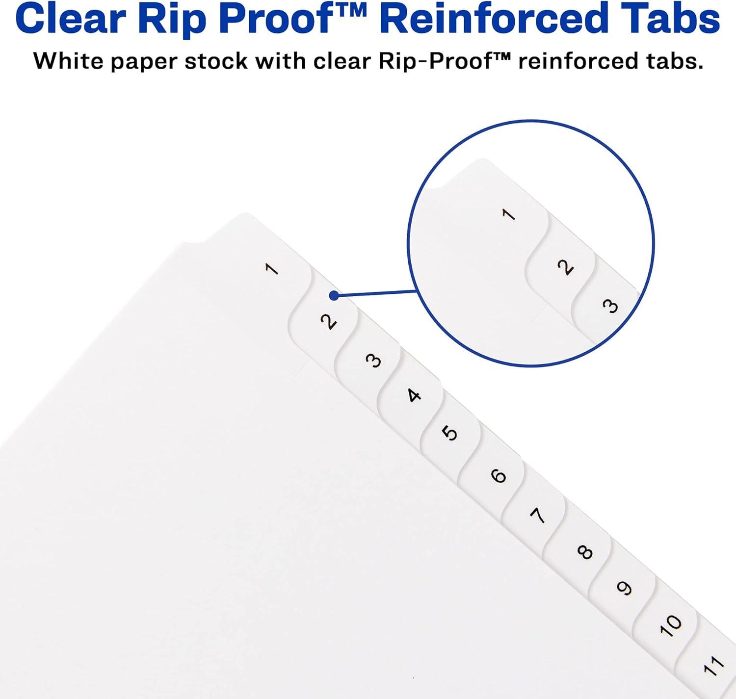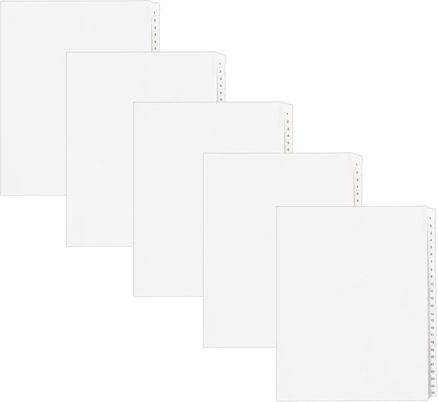 Quickly sort piles of legal documents and notes alphabetically with Avery 01701 1-25 legal exhibit dividers with Allstate-style design. Printed in numerical order with one number per tab, each tab is also printed on both sides for better visibility as you flip through your documents. The font of each tab is printed to match the Allstate style with Helvetica regular type. Avery dividers feature tabs reinforced with clear Rip Proof technology that ensures that the tabs can survive everyday wear and tear. Unpunched for universal compatibility, the binding edge is left intact so that they can be hole-punched to fit with any binding system. 1 set of 25 dividers is included. Whether you are an office admin maintaining a system of records, an attorney keeping track of notes or a paralegal organizing vital documents, Avery dividers are the perfect way to organize your life in style.