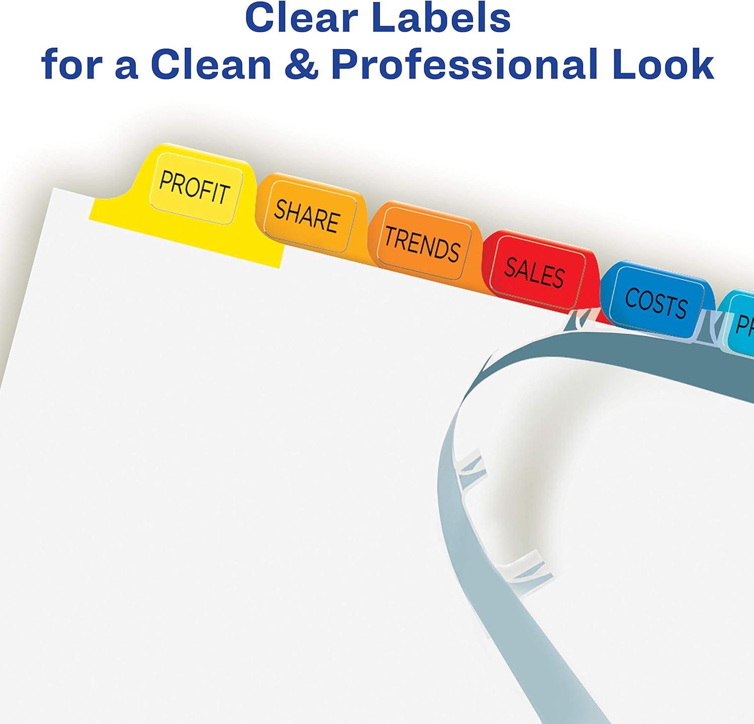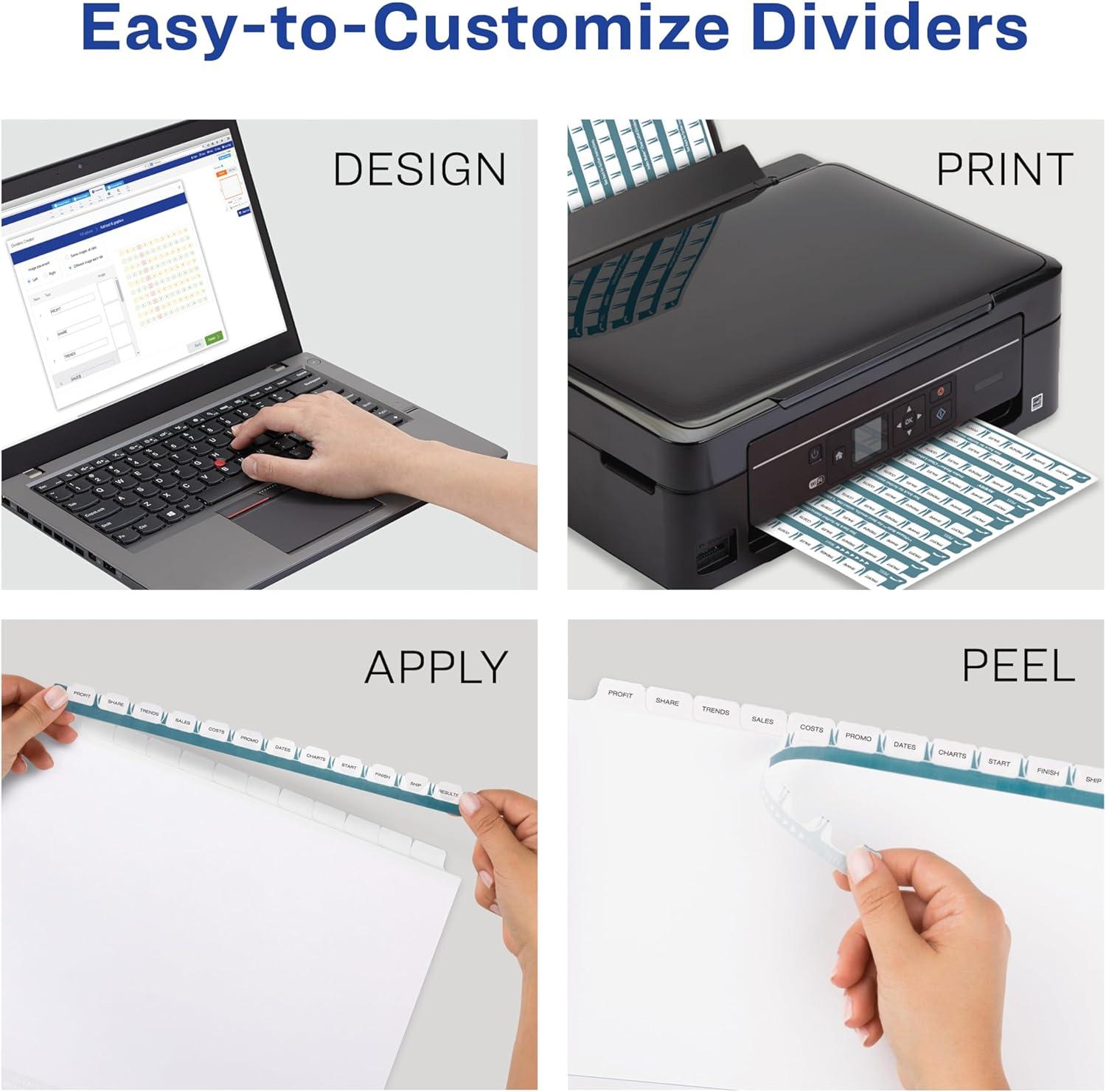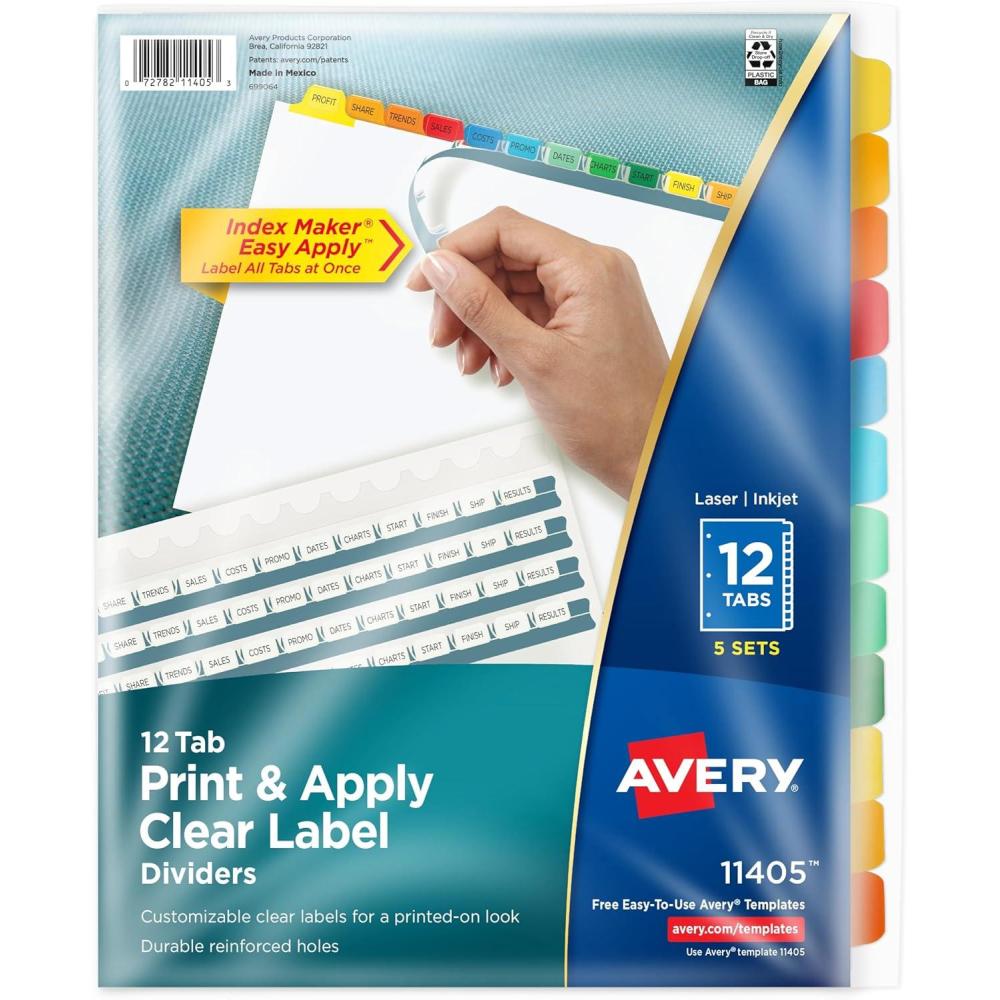 Easily create print shop quality personalized binder dividers with tabs with Avery Index Maker Clear Label Dividers. Customize the title tabs for your dividers quickly and easily using the free templates on the Avery website and print with your inkjet or laser printer for clean, professional looking results in minutes. This pack comes with 5 sets of 12-tab dividers, and the Easy Apply clear label strips make it simple to apply all 12 labels of each set at once. Just print, align labels against tabs, smooth down labels and peel up strip. The white binder dividers feature an assortment of brightly colored tabs for eye-catching convenience when you're looking for the right section. Each 3-hole punched durable divider also features doubled-sided, reinforced tabs and edges to help resist tearing for long-lasting, everyday use. These 3 ring binder dividers with tabs are a great addition to your medical office supplies, school binders, personal organizers, tax office supplies, presentation reports and more. Print, peel, and press your way to a perfect, precise project.