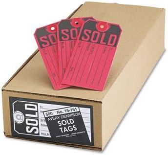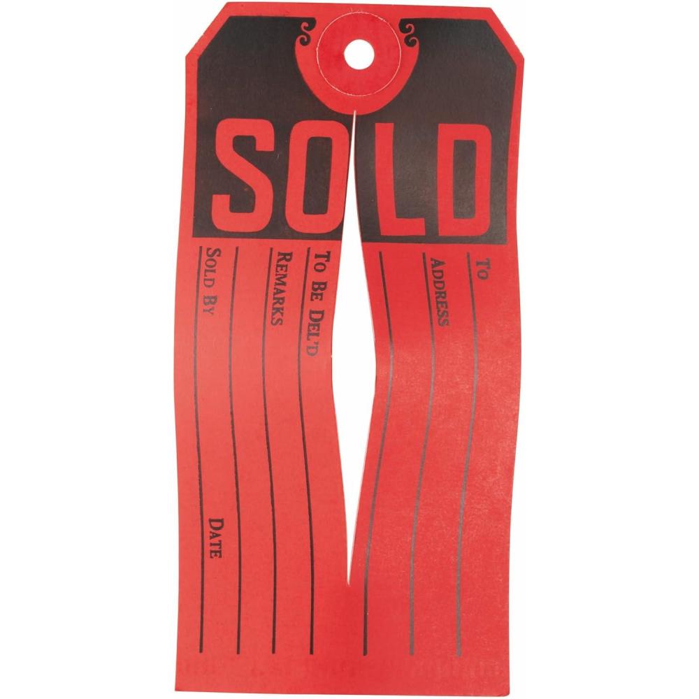 Update the status of your items for sale quickly with these easy-to-use Sold Tags. Each tag is printed with black ink on eye-catching red cardstock so shoppers will immediately recognize which items are off the market. Preprinted lines let you fill out buyer, seller and delivery information for easy reference. Enjoy the ease of the knife-slit design, or thread a fastener through the tag's reinforced hole. You'll be sold on the convenience. Size: 4 3/4 x 2 3/8; Color(s): Red/Black; Depicted Text: “SOLD” with Identifying Information; Material(s): Paper Stock.