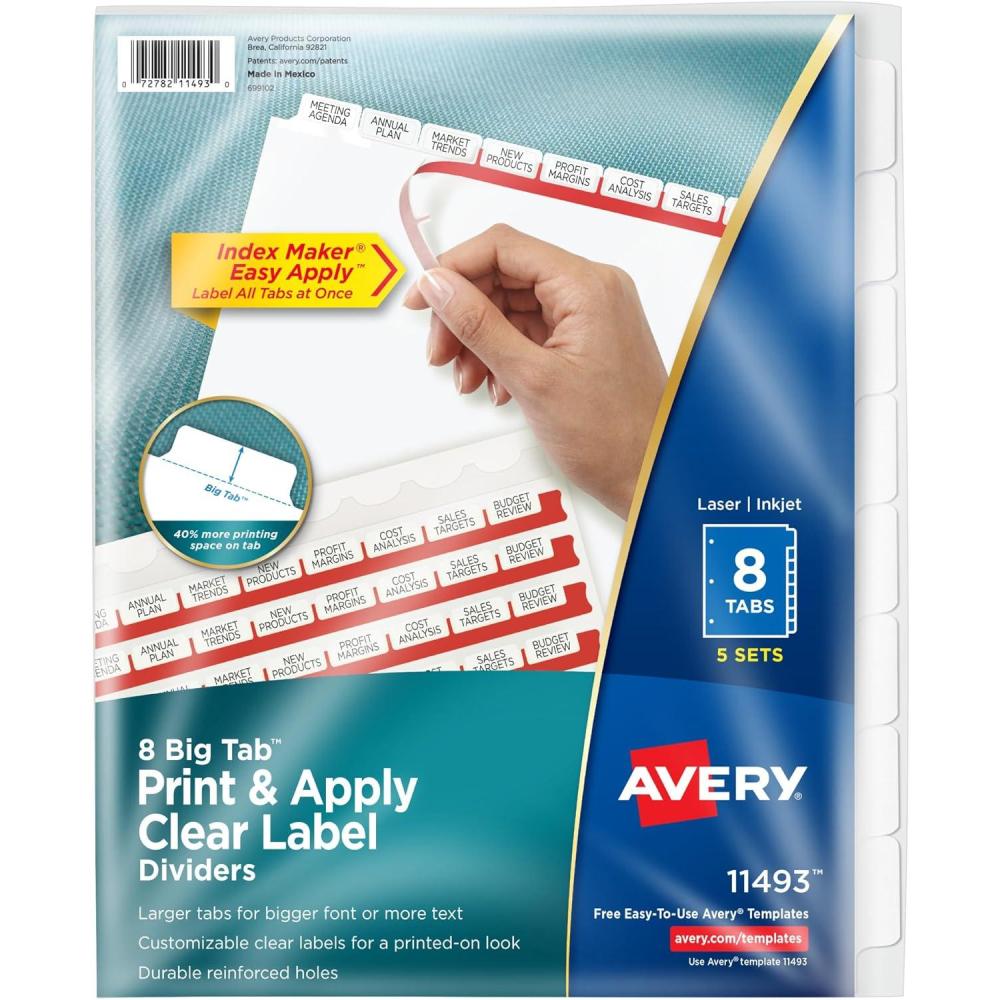 Don’t waste time and money ordering custom printed binder dividers with tabs when you can easily create and print your own personalized dividers with Avery Index Maker Clear Label Big Tab Dividers. Our larger Big Tab design offers more room for bigger fonts, more text and even logos or images. Customize your title tabs quickly and easily using the free templates on the Avery website and print with your inkjet or laser printer for clean, professional looking results in minutes. This pack comes with 5 sets of 5-tab dividers, and the Easy Apply clear label strips make it simple to apply all 5 labels of each set at once. Just print, align labels against tabs, smooth down labels and peel up strip. Each 3-hole punched durable divider also features doubled-sided, reinforced tabs and edges to help resist tearing for long-lasting, everyday use. These 3 ring binder dividers with tabs are a great addition to your medical office supplies, school binders, personal organizers, tax office supplies, presentation reports and more. Print, peel, and press your way to a perfect, precise project.