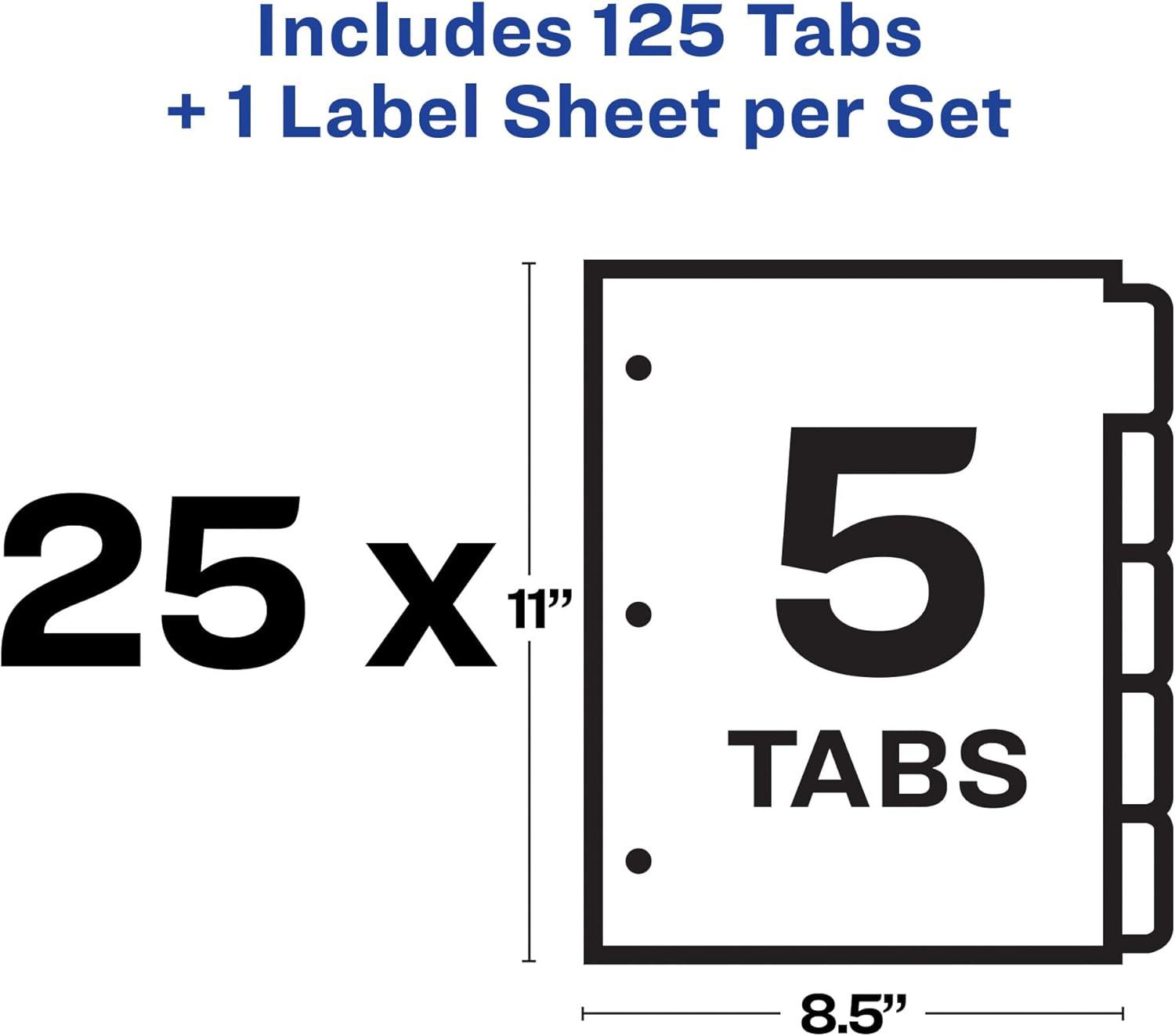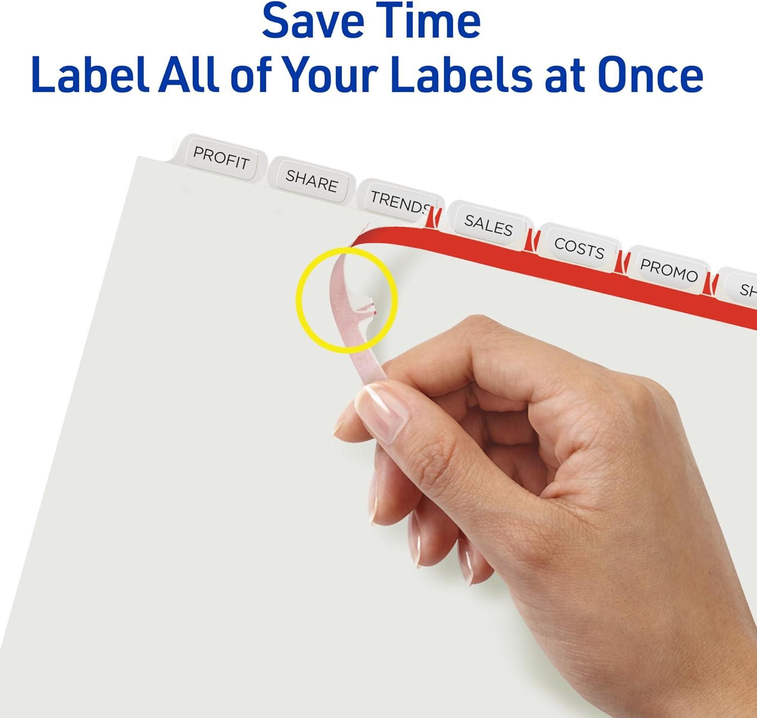 Easily create print shop quality personalized binder dividers with tabs with Avery Index Maker Clear Label Dividers. Customize the title tabs for your dividers quickly and easily using the free templates on the Avery website and print with your inkjet or laser printer for clean, professional looking results in minutes. This pack comes with five sets of 5-tab dividers, and the Easy Apply clear label strips make it simple to apply all 5 labels of each set at once. Just print, align labels against tabs, smooth down labels and peel up strip. Each 3-hole punched durable divider also features doubled-sided, reinforced tabs and edges to help resist tearing for long-lasting, everyday use. These 3 ring binder dividers with tabs are a great addition to your medical office supplies, school binders, personal organizers, tax office supplies, presentation reports and more. Print, peel, and press your way to a perfect, precise project.