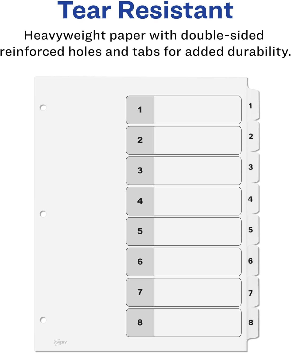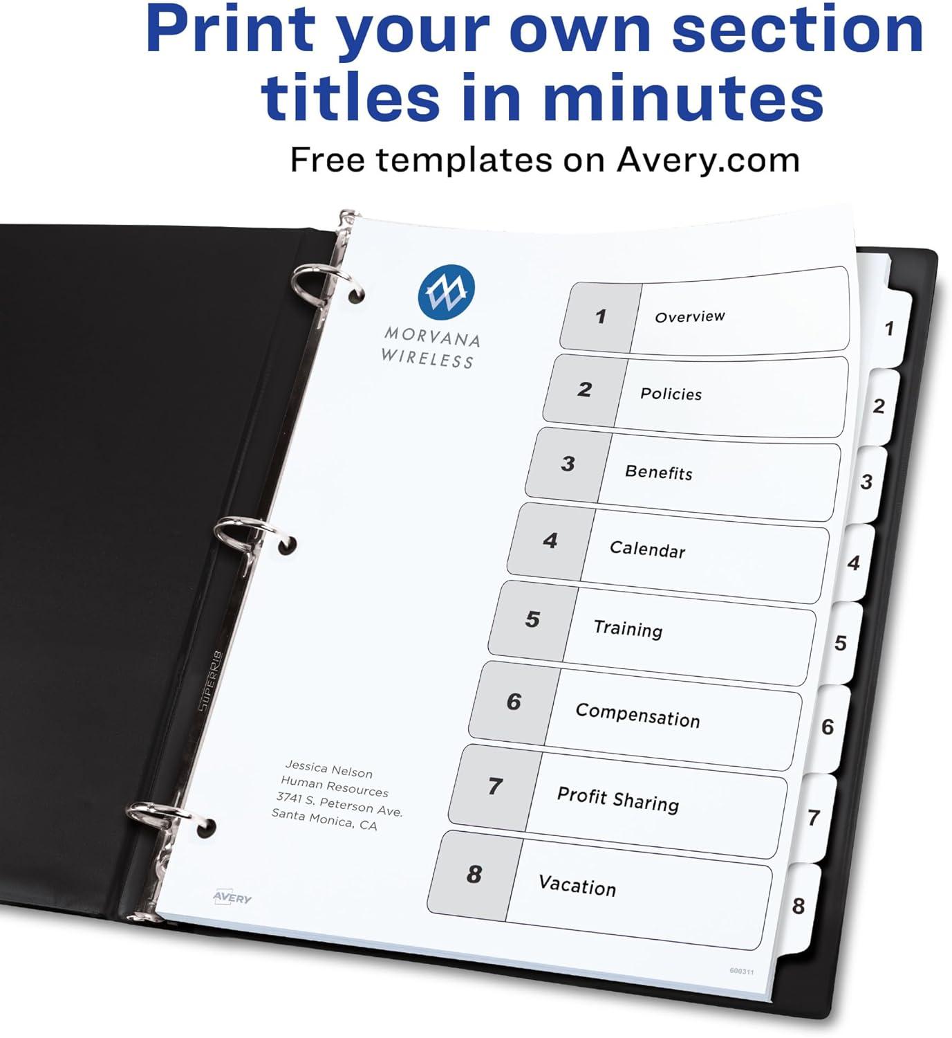 Avery 8 Tab Dividers for 3 Ring Binders, Customizable Table of Contents, Classic White Tabs, 6 Sets (11822)(8 Tab (Pack of 10))