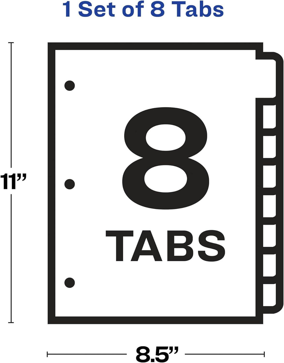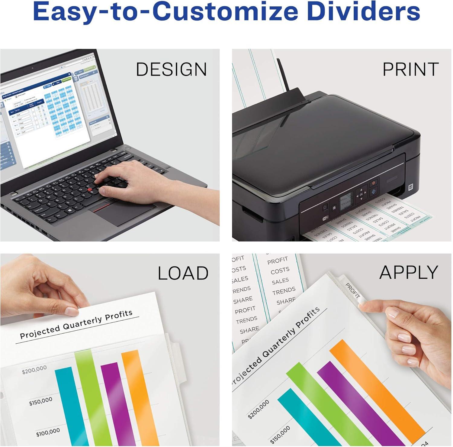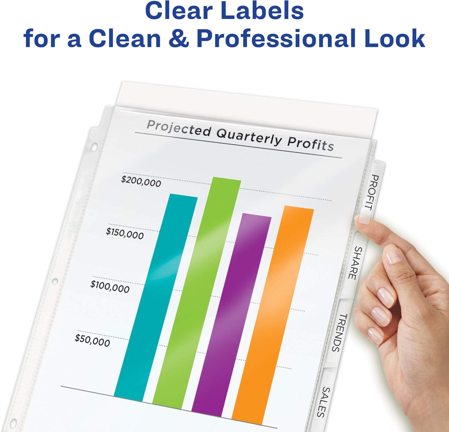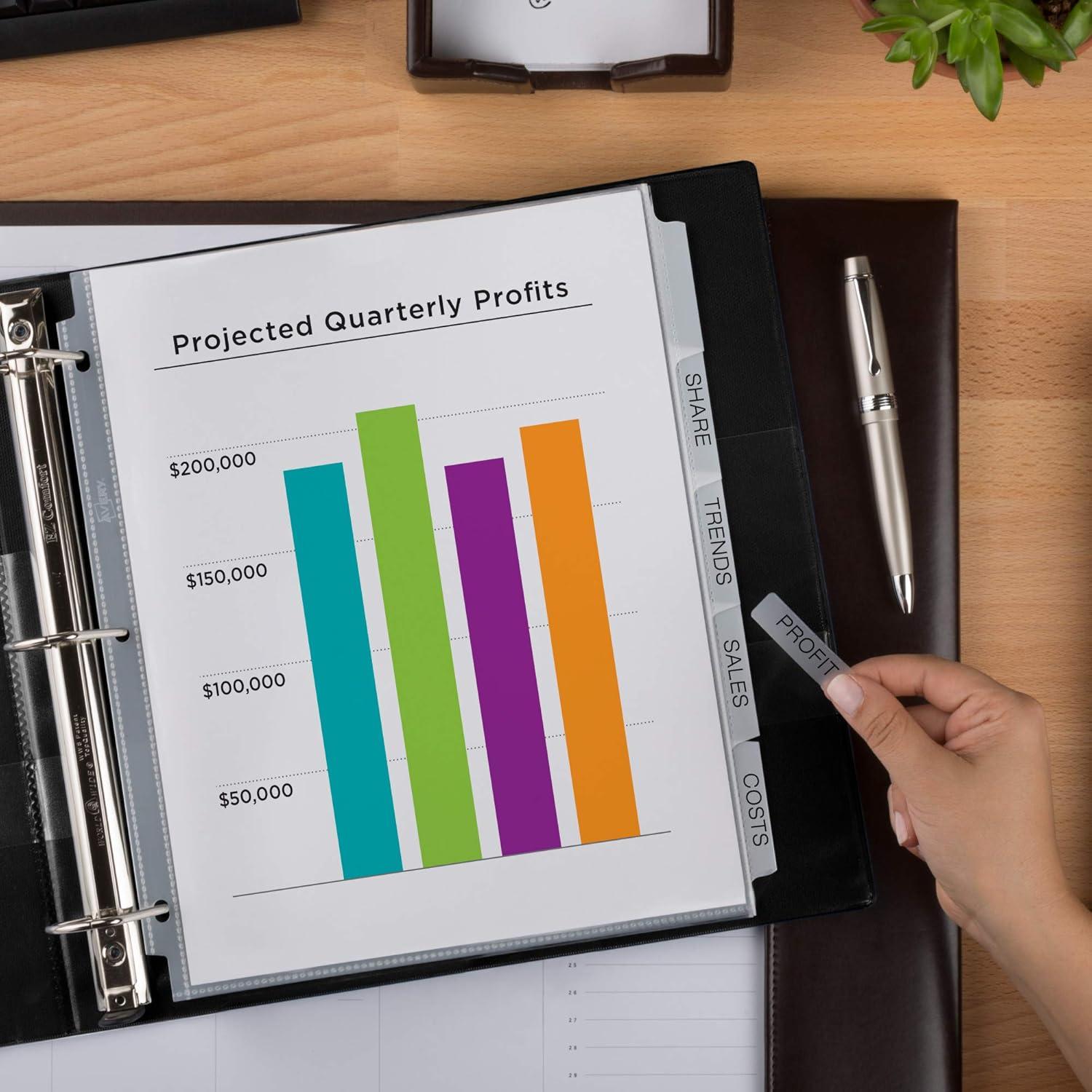 For those busy professionals looking for sheet protectors that are optimized to create professional-looking indexed projects, these easy-to-customize 8-tab plastic dividers are the perfect all-in-one solution. The clear top-loading tabbed index dividers feature contrasting white tabs and an Easy Peel sheet that lets you label your plastic divider tabs with ease and efficiency, saving you tons of time so you can organize your projects quickly. Whether you’re working on one project or need multiple sets, these binder dividers will help you pull it off with professional results. These tab dividers are perfect for organizing loose, un-punched papers. Use your tabbed plastic divider for customizing your presentation book, training guides, proposals, employee handbooks, project binders and more. The clear labels virtually vanish on the tabs, lending a clean, printed-on look to your dividers. Each tabbed plastic divider is easy-to-use with 3 ring binders and features a resilient construction ideal for frequent use while letting you easily preview your documents for quick referencing. These 8-tab dividers for 3 ring binders are excellent assets for helping you stay on top of things at the office, home or classroom. Customize your 3-ring binder dividers for home, school, work and more using the free templates and designs on the Avery sites and print your tab labels. You'll have professional quality custom dividers to use within minutes. With these tabbed dividers at your disposal, you'll be able to finish projects faster and with more professional results.
