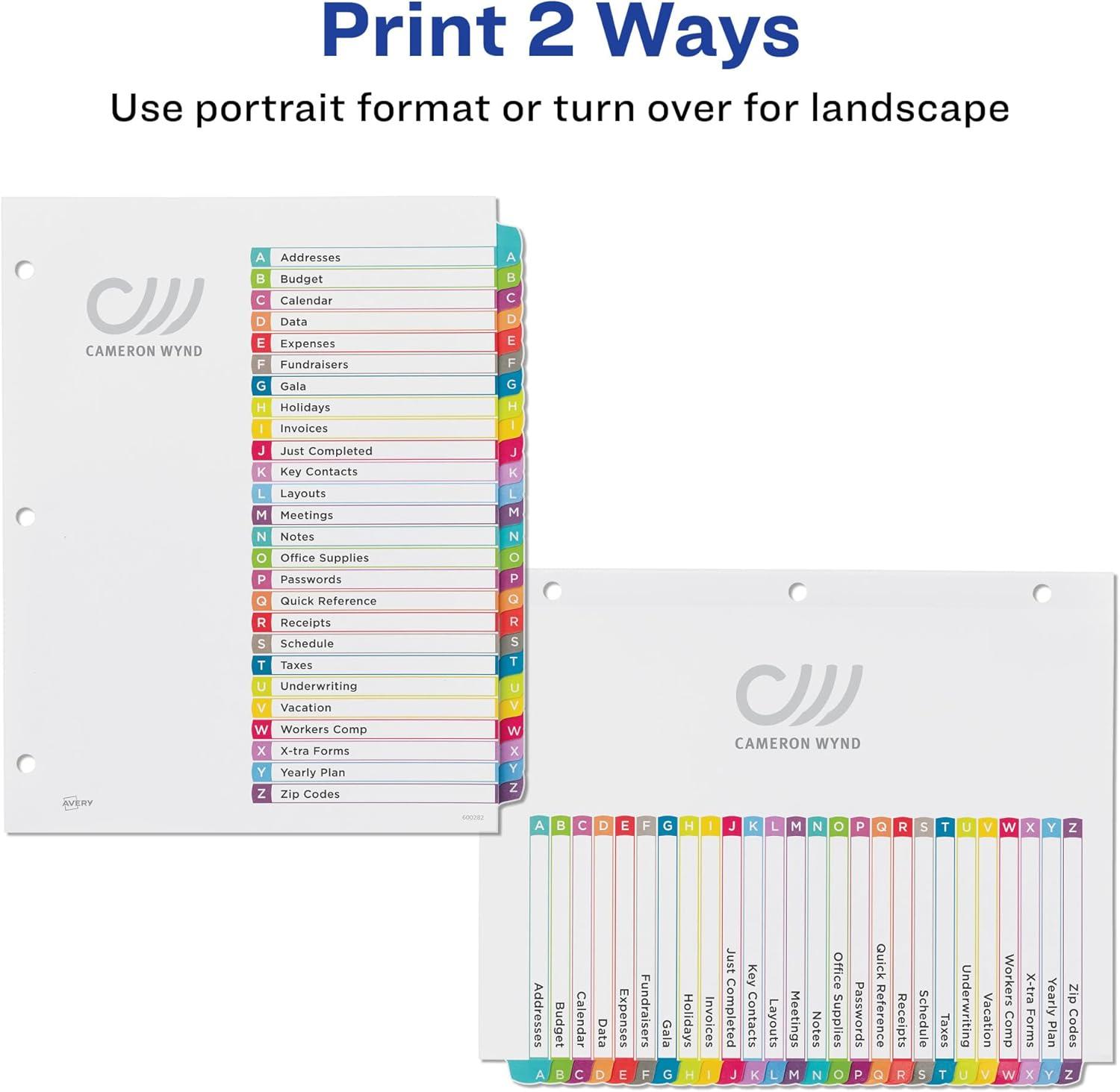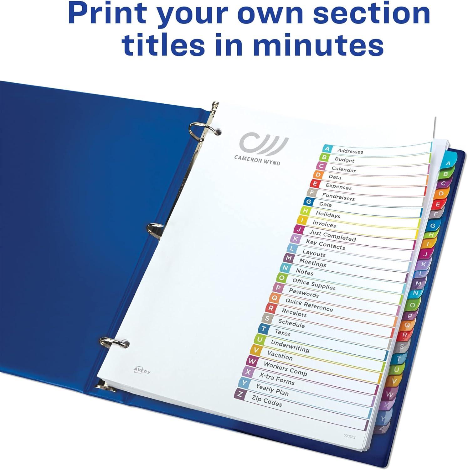 Give your binders a fresh new look with Avery Ready Index Dividers. Each binder divider features a contemporary and bright color scheme with a larger arched tab. Print customized section titles and images onto the table of contents sheet without worrying about inserts or labels. Whether you're hosting a meeting or creating binders for classes, these dividers are perfect for getting things sorted. 26 alphabet dividers are included with each sheet measuring 8-1/2?x11?. The heavyweight sheets feature durable, reinforced 3 ring binder holes to help prevent tearing. Each tabbed divider also includes additional reinforcement along the edge of the sheet to distribute stress and resist creasing. The table of contents sheet is also compatible with both laser and inkjet printers. Check out Avery Design & Print software today and use the available Avery templates to easily personalize your binder dividers.