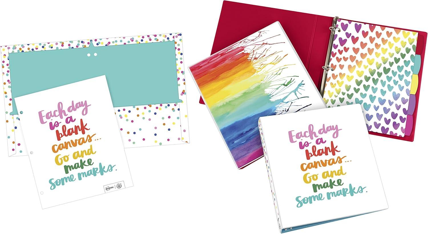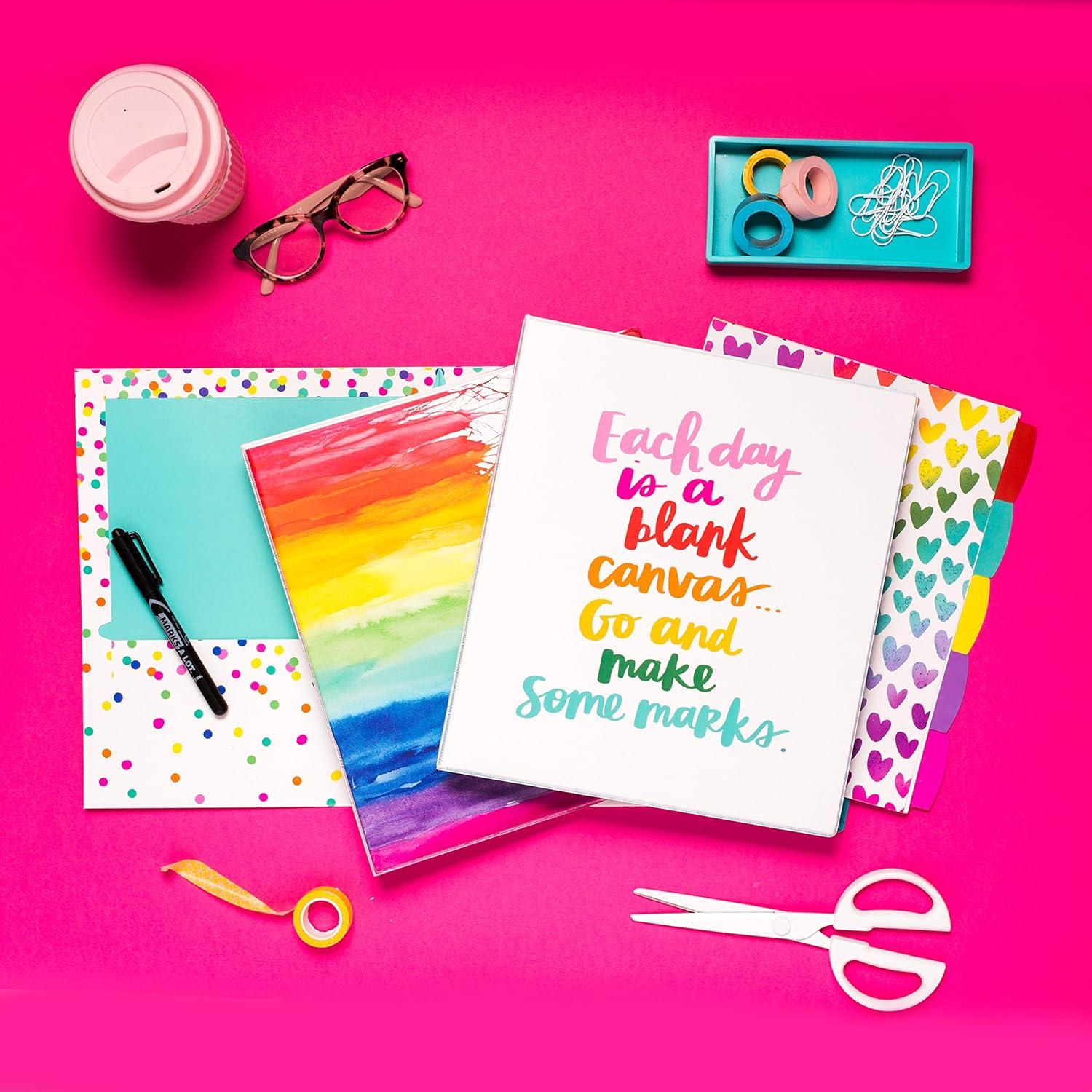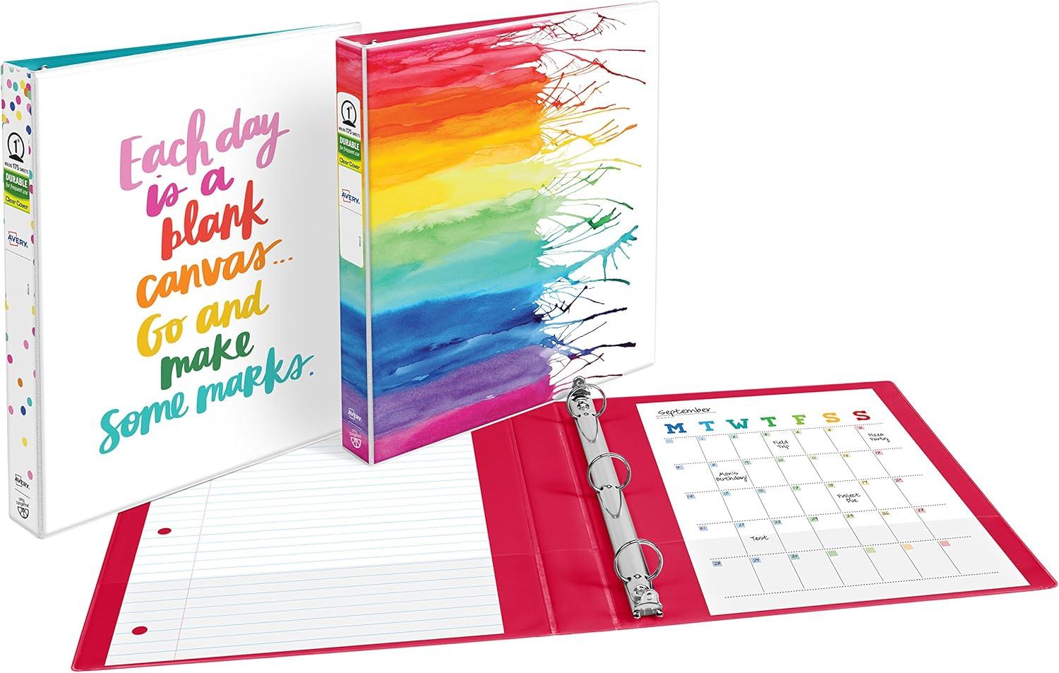 Today is a new day. Follow your heart with this Amy Tangerine Designer Collection Durable View Fashion 3 ring binder two-pack; preprinted with the Watercolor Rainbow and Each Day is a Blank Canvas designs. The binder's durable construction is ideal for frequent referencing, and the clear cover and spine allow for easy personalization. The sturdy 1†round rings hold 175 pages and the back-mounted rings enable pages to lay flat. Two interior pockets are ideal for storing loose and unpunched papers. Built to last, these Avery durable binders will stand up to everyday use in your backpack and at home; backed by a hassle-free product guarantee. Your Amy Tangerine binder organizer is ideal for school, home and everyday use.