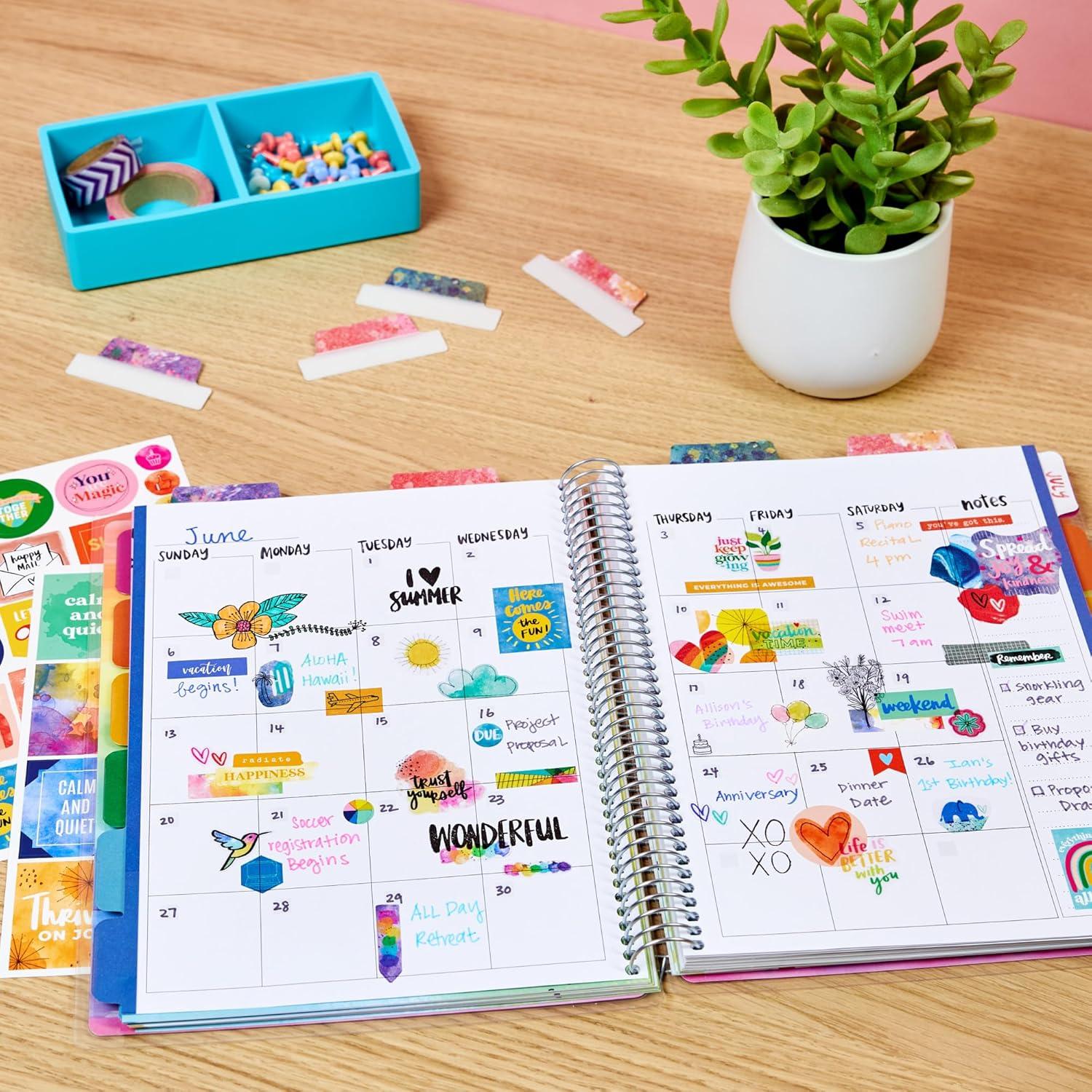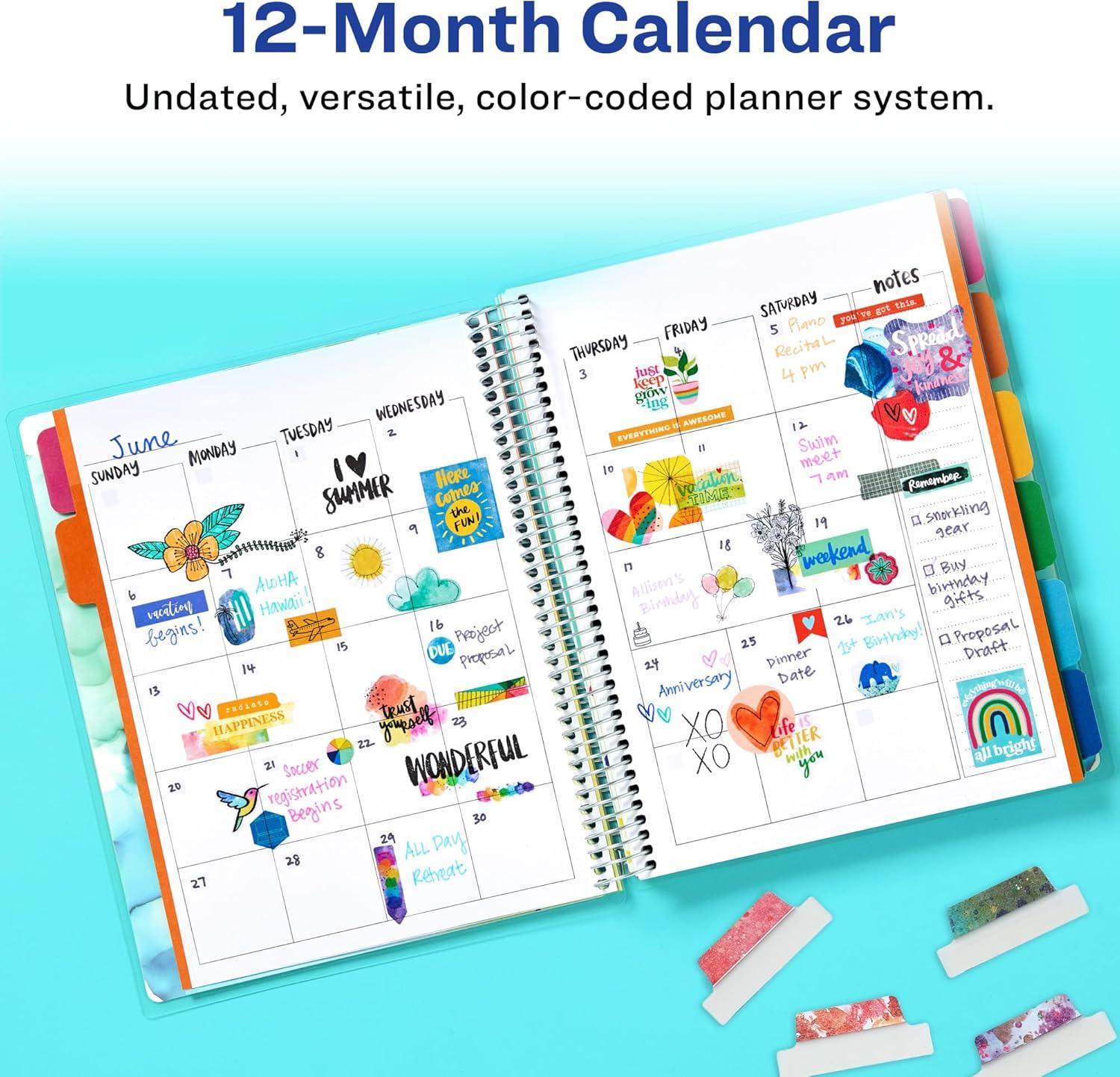 Avery + Amy Tangerine Designer Collection Planner, Undated 12-Month Planner with Stickers, 8.25" x 9.75", Rainbow Paint Design (29880)(Rainbow Paint)
