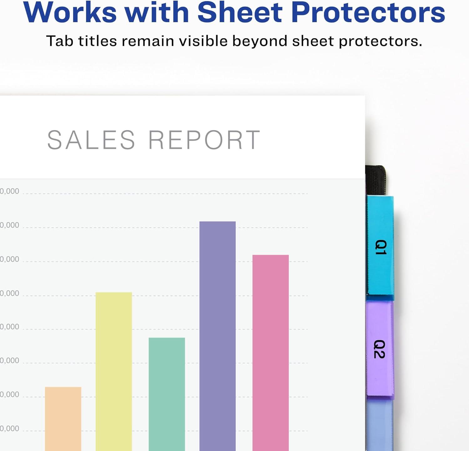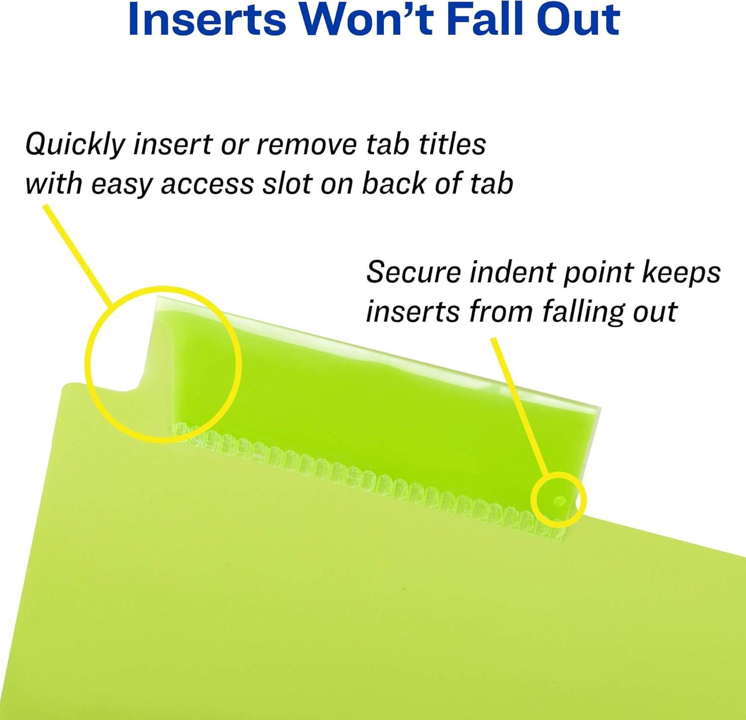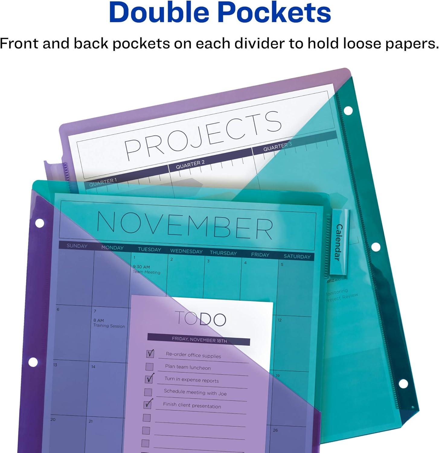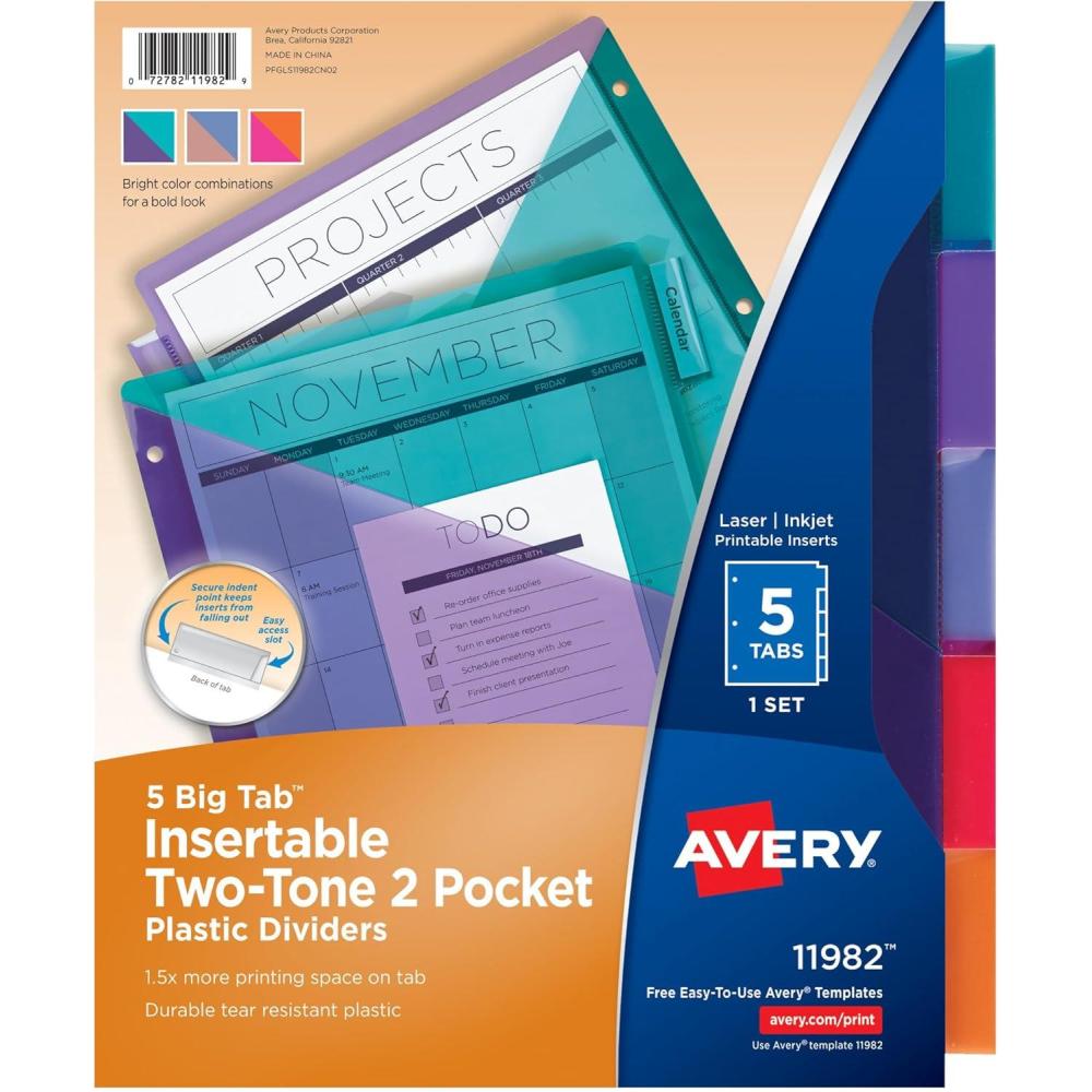 Keep your binder organized and in style with these Big Tab Insertable Pocket Dividers. The wide design works perfectly with sheet protectors so that you can still view your tabs at a glance. Enjoy two-toned, multicolored tabbed dividers with pockets that are perfect for quick content identification and organization. Each 3 ring page divider features front and back pockets made of durable plastic to accommodate loose papers up to 8.5″ x 11″. The Big Tab design offers 1.5 times more printing space on the tab inserts than on standard plastic dividers, so you can use larger fonts or more lines of text for easier reading and referencing. The 5-tab divider set includes a secure indent point on each tab that keeps inserts from falling out. Write directly on insert labels or use the free templates and fonts on the Avery site to customize the inserts for your tab dividers for 3 ring binders and print them in minutes on your laser of inkjet printer. Ideal for schoolwork, personal finances, reports, recipes and more. This item comes with a set of 5-tab binder dividers for a total of 5 multicolor binder dividers with pockets.