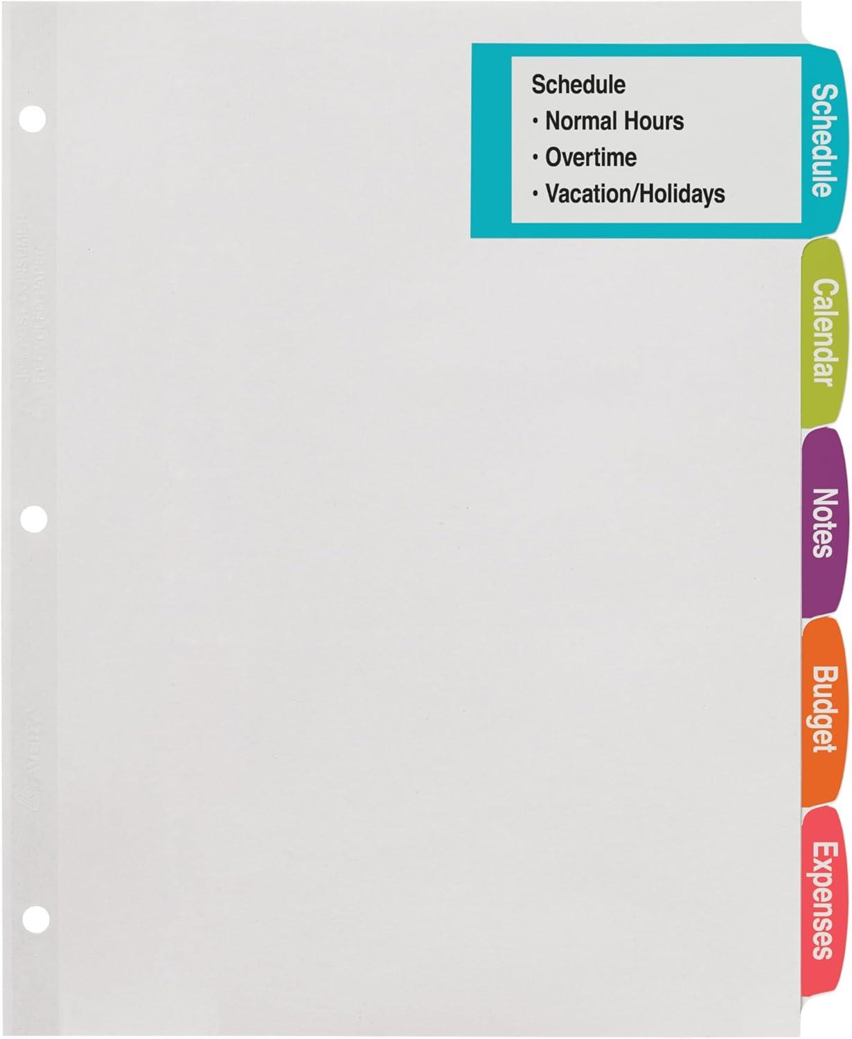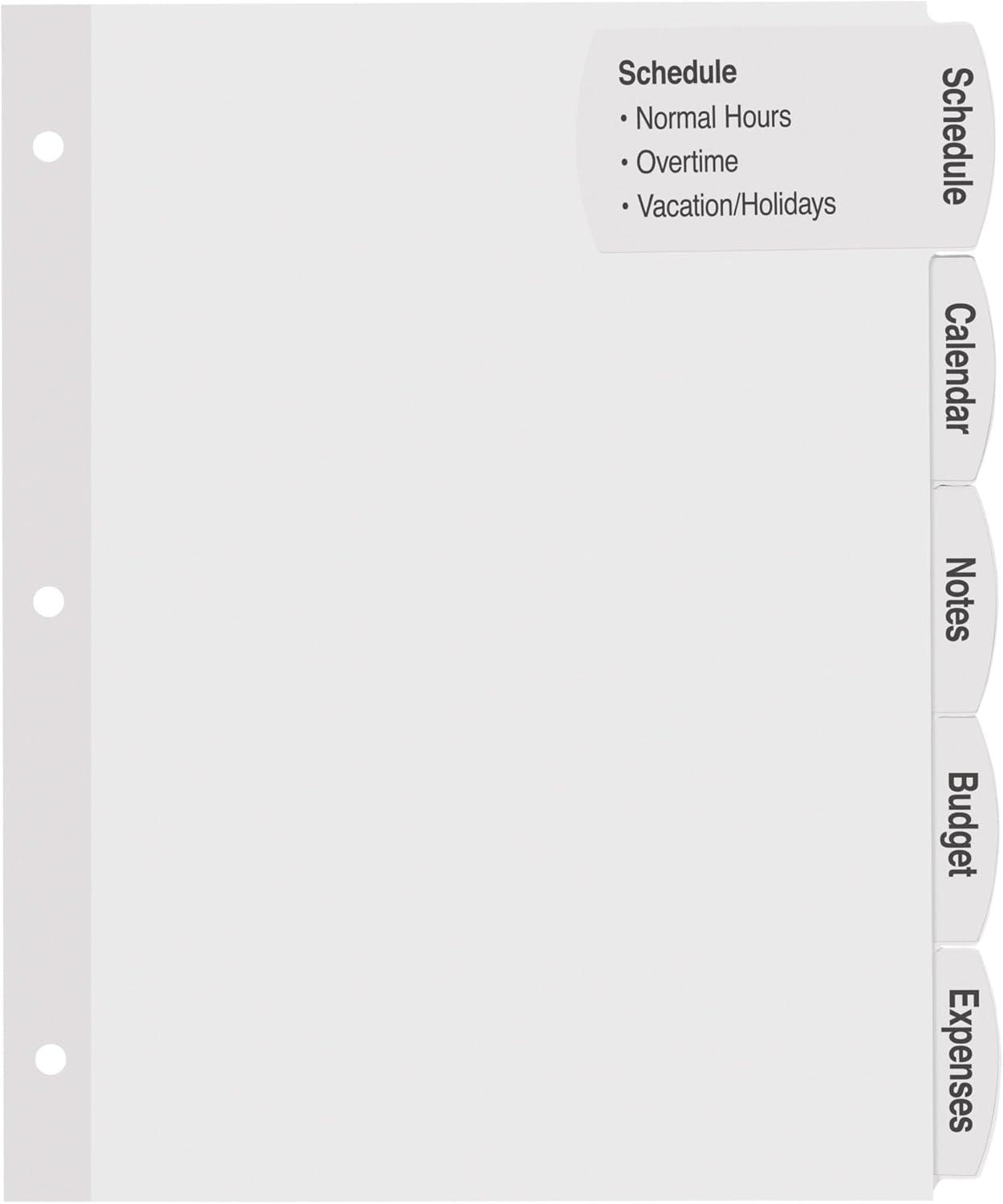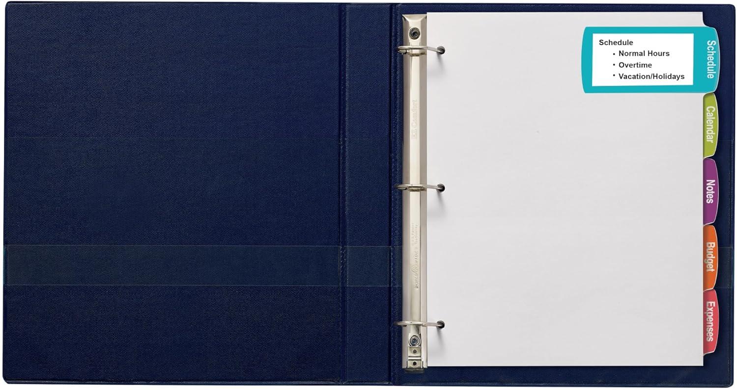 Create customized dividers with all the information you need, using these Avery 14440 Printable Large White Label Tab Dividers. The large labels extend from the arched-shaped tabs onto the divider bodies, giving ample room to add section contents, logos or designs. Simply personalize your tab labels using templates and designs on the Avery site. You can print your labels in black and white, or create a custom color set, using a laser or inkjet printer. The print-to-the-edge Easy Peel labels, featuring our Pop-up Edge, make it fast and simple to personalize your tabs, with no inserts required. You simply bend back the label sheet, peel your label and apply to the divider tabs. A bonus standard label sheet is included for the back of your tabs. Pack contains 20 sets of 5-tab dividers.