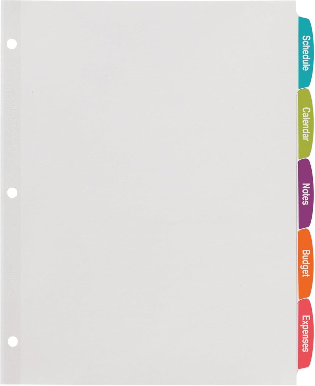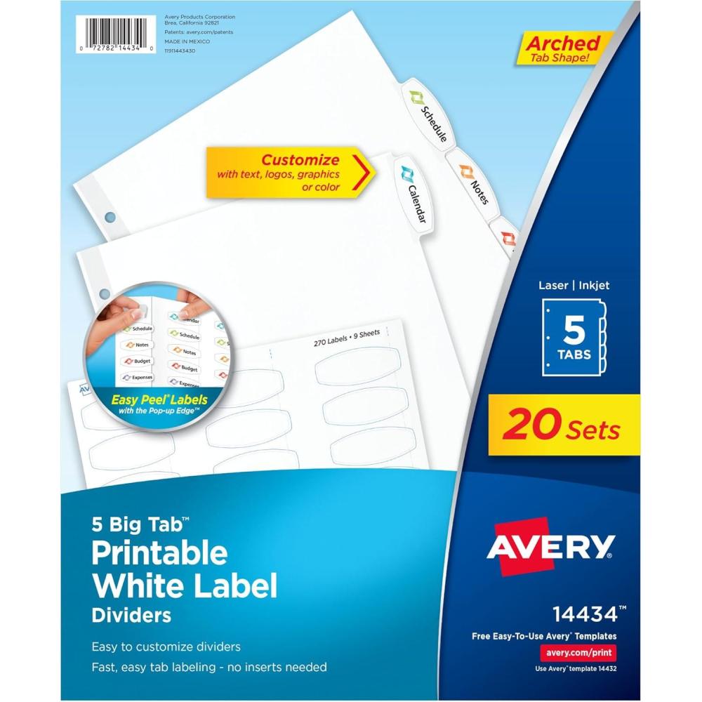 Create customized dividers quickly and easily with these Avery 14434 Big Tab Printable White Label Dividers. The arched-shaped tab labels are simple to personalize using the templates and designs on the Avery site. You can print your labels in black and white, or create a custom color set using a laser or inkjet printer. The print-to-the-edge Easy Peel labels, featuring our Pop-up Edge, make it fast and simple to personalize your tabs, with no inserts required. Simply bend back the label sheet, peel your label and apply to the divider tabs. Pack contains 20 sets of 5-tab dividers.