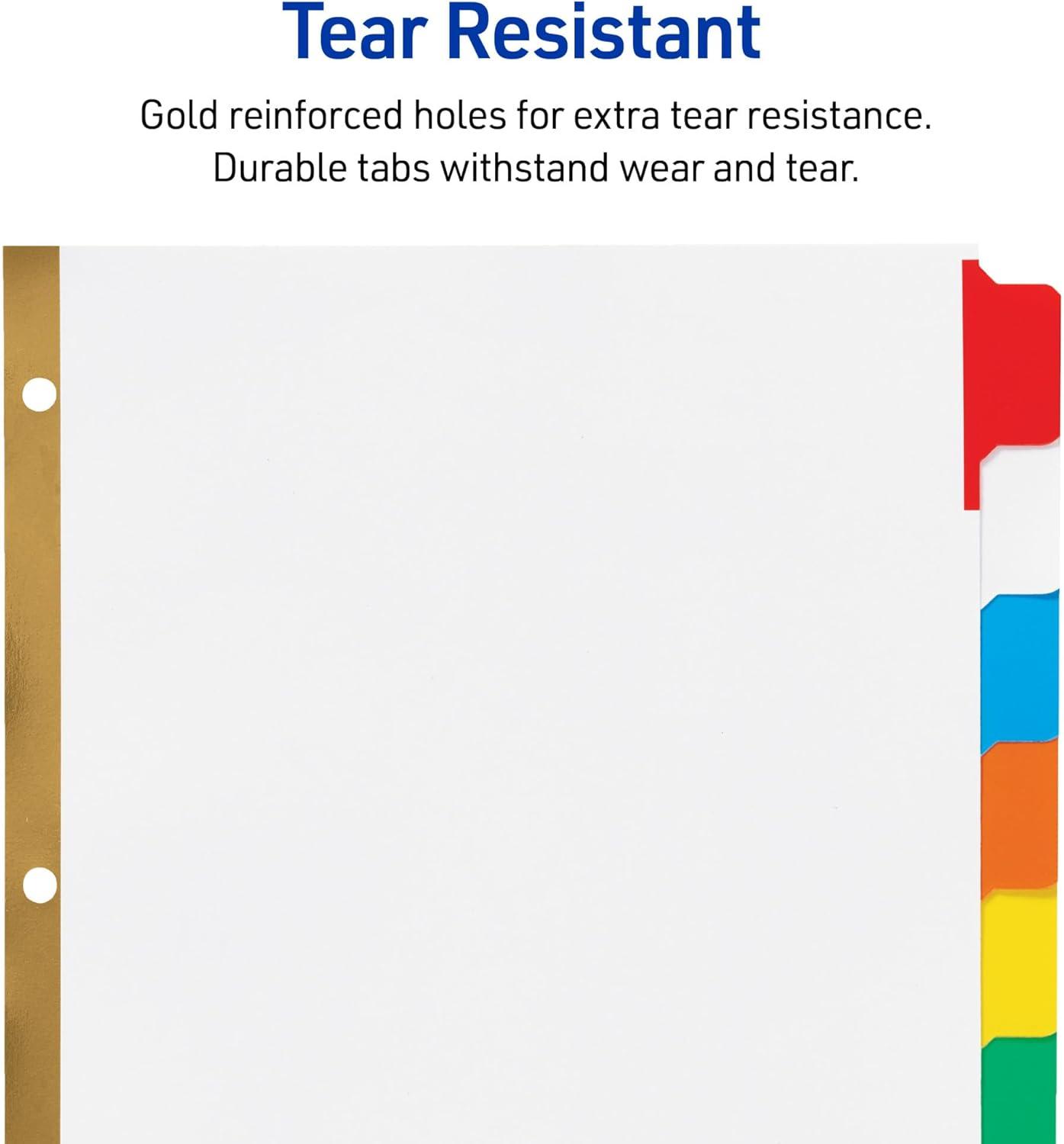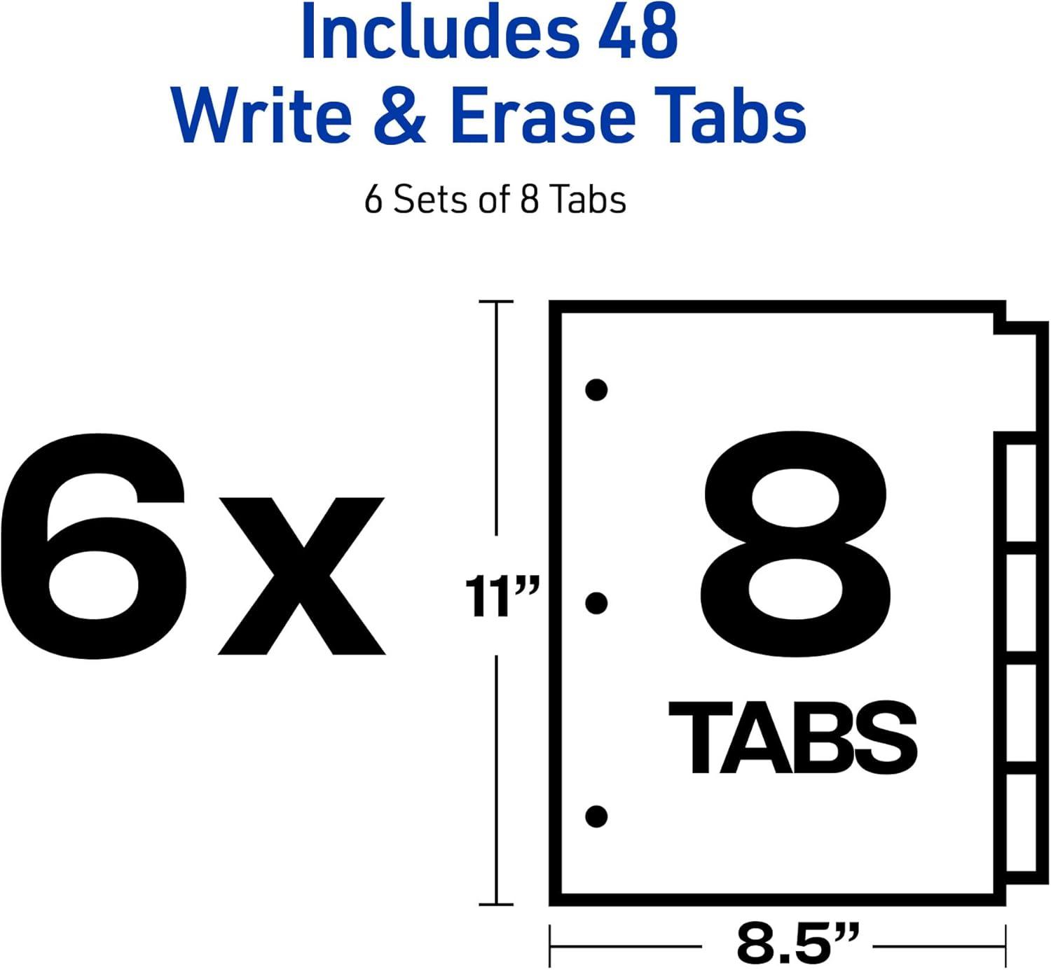 Stay organized with these Avery Big Tab Write & Erase Plastic Dividers for 3 ring binders, offering a flexible solution for organizing files, schoolwork, or finances. These binder separators with tabs are great for quick changes, allowing you to write directly on the divider tabs for 3 ring binder with a ballpoint pen or pencil and erase as needed. Designed with the innovative Big Tab format, these tab file folders provide 1.5 times more writing space than conventional dividers, so that your notes and titles are visible. The multicolored plastic divider tab system enhances your paper organizer's functionality by enabling efficient color-coding, making it simple to locate necessary sections. These dividers feature a gold-reinforced binding edge to prevent tearing, allowing for continued durability with your paper organizing needs. Ideal for organizing documents, schoolwork, or finances, the colored tabs add vibrancy and facilitate quick referencing. Each set includes six packs of Avery 23079 dividers, for a total of 48 dividers.