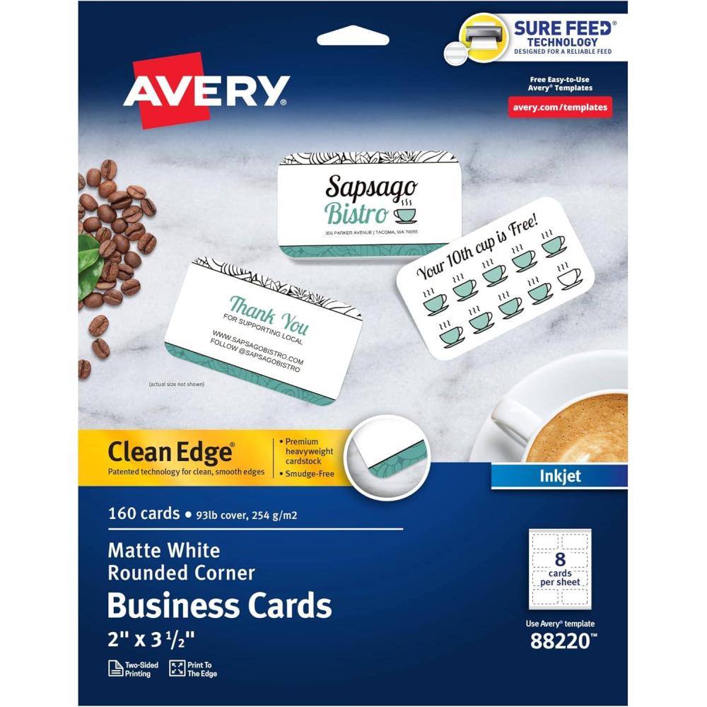 Avery Clean Edge Printable Business Cards with Sure Feed Technology, Rounded Corners, 2″ x 3.5″, White, 160 Blank Cards for Inkjet Printers (88220)(One Size)