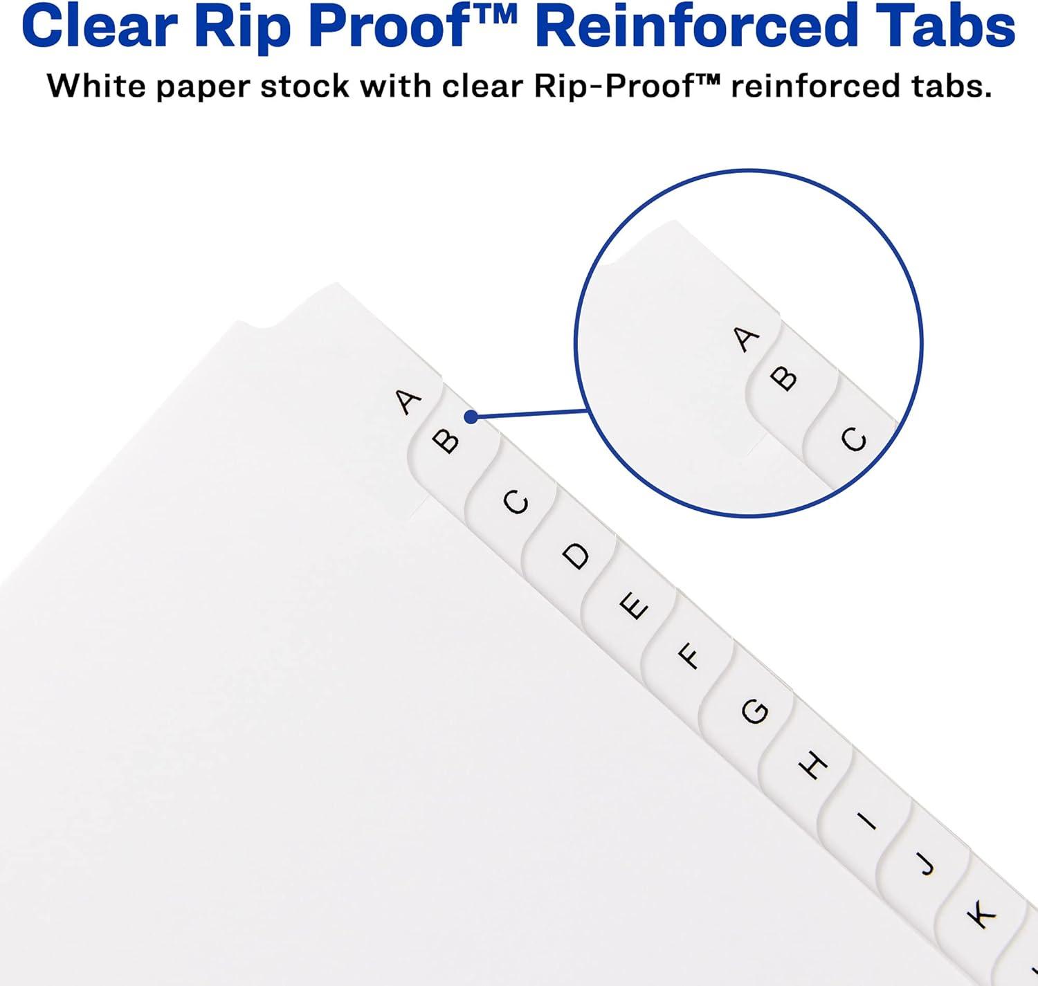 Quickly and easily sort legal documents and notes alphabetically with Avery 21874 A-Z legal exhibit dividers. Perfect for bringing order to your paperwork, these dividers are great for organizing files, presentation material, official records and other important documents in a neat and professional manner. Each set of tabbed dividers comes pre-printed in alphabetical order with one letter per tab. Letters are printed on both sides of the tab in the Allstate style with Helvetica regular type for better visibility and quick referencing. White paper dividers feature tabs reinforced with clear Rip Proof technology designed to survive everyday wear and tear. Unpunched for universal compatibility, the binding edge is left intact so it can be hole-punched to fit with any binding system. Whether you are an office administrator maintaining a system of records, an attorney keeping track of notes or a paralegal organizing vital documents, do your paperwork justice with Avery dividers. Included are 3 packs of 26 binder dividers with tabs.