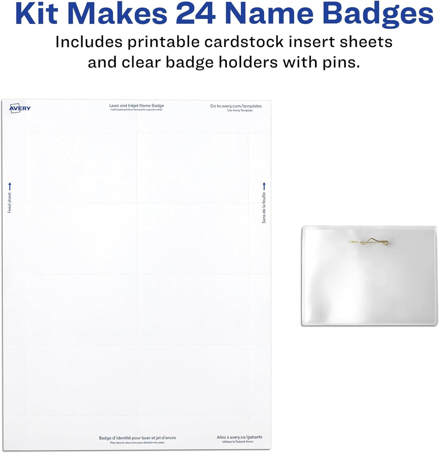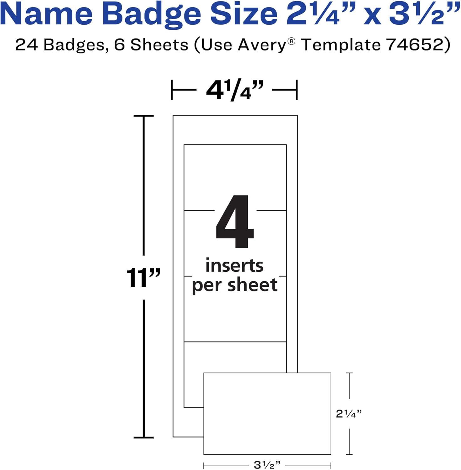 Create professional custom name tags quickly and easily with Avery 74652 name badges with pins. This 24-pack includes badge holders with no-snag pins that secure them in place, making them perfect for professional and social gatherings like meetings, trade shows, company mixers, reunions, meet-ups and more. The soft yet durable plastic name badge holders are reusable and feature a pocket-style design for easy loading and unloading. Effortlessly create custom name tags with company names, personal titles, logos, and more using templates and designs available at Avery Design & Print Online. Try it out on the Avery website and print with your laser or inkjet printer. Printable inserts come in 4.25″ x 11″ white cardstock sheets that feature ultra-fine perforations for smooth edges and a high-quality, professional look. Ideal for permanent or temporary identification, these customizable name badges can be used as staff ID badges, business meeting badges, networking event tags, conference name tags, kids ID cards, and more. This name badge kit comes with everything needed to make 24 name badges, including 3″ x 4″ printable inserts and horizontal badge holders with pins.