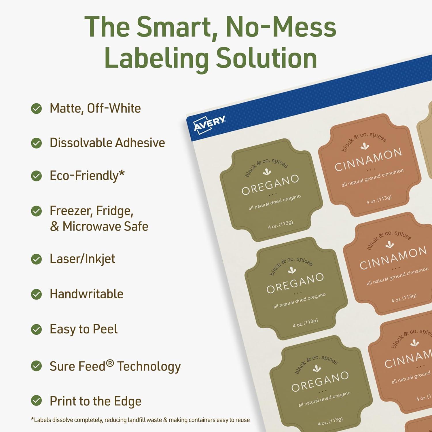 Add a personal touch to homemade jam labels, mason jar labels, container labels, and more with Avery Dissolvable Matte White 1-5/8″ x 1-5/8″ Square Scalloped Labels. Designed for easy cleanup, these printable labels dissolve completely in 30 seconds without leaving behind any sticky residue, making them perfect for reusable containers. Whether you're labeling products, food storage, or meal prep, these labels are freezer-, refrigerator-, and microwave-safe, ensuring they stay in place until you’re ready to wash them away. With an FDA-compliant adhesive for indirect food contact, these sticker labels are a safe, eco-friendly solution for food container labels, beverage labels, bottle labels, and more. They help reduce waste by making it easier to reuse containers while also supporting recycling since they dissolve without adhesive buildup. Sure Feed technology reduces jams or smudges by creating a more reliable feed through your printer. The print-to-the-edge layout lets you print beautiful, full-bleed designs that fill each blank sticker to the edge. Compatible with laser and inkjet printers, these printable labels allow you to create custom labels for home, business, or food service needs. Choose a smarter, more sustainable way to label with these dissolvable Avery labels that keep your kitchen, business, and storage organized without the mess.