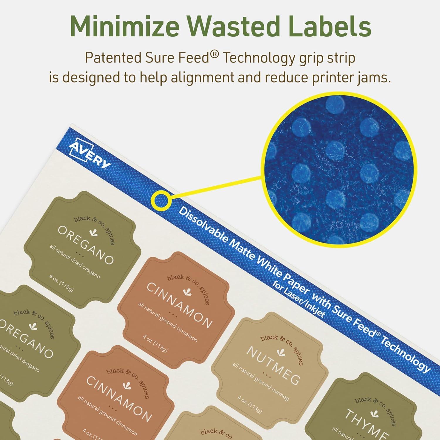 Avery labels featuring patented Sure Feed technology provide a more reliable feed through your printer, helping to reduce misalignments and paper jams