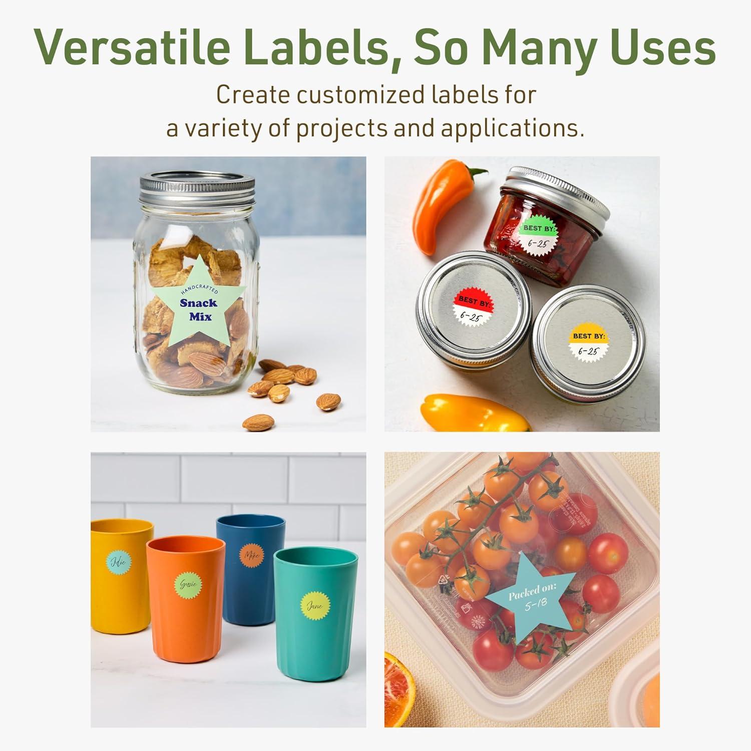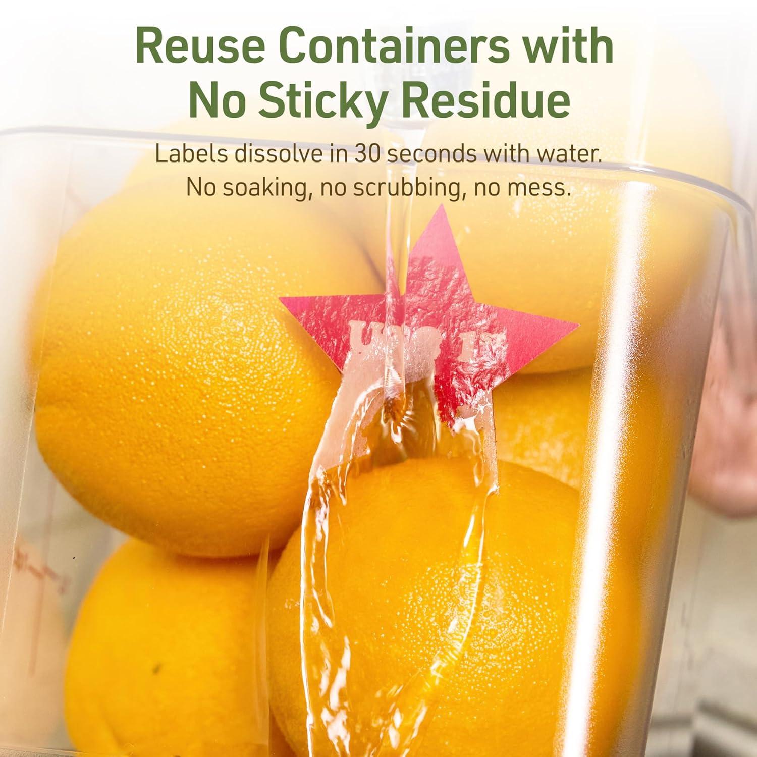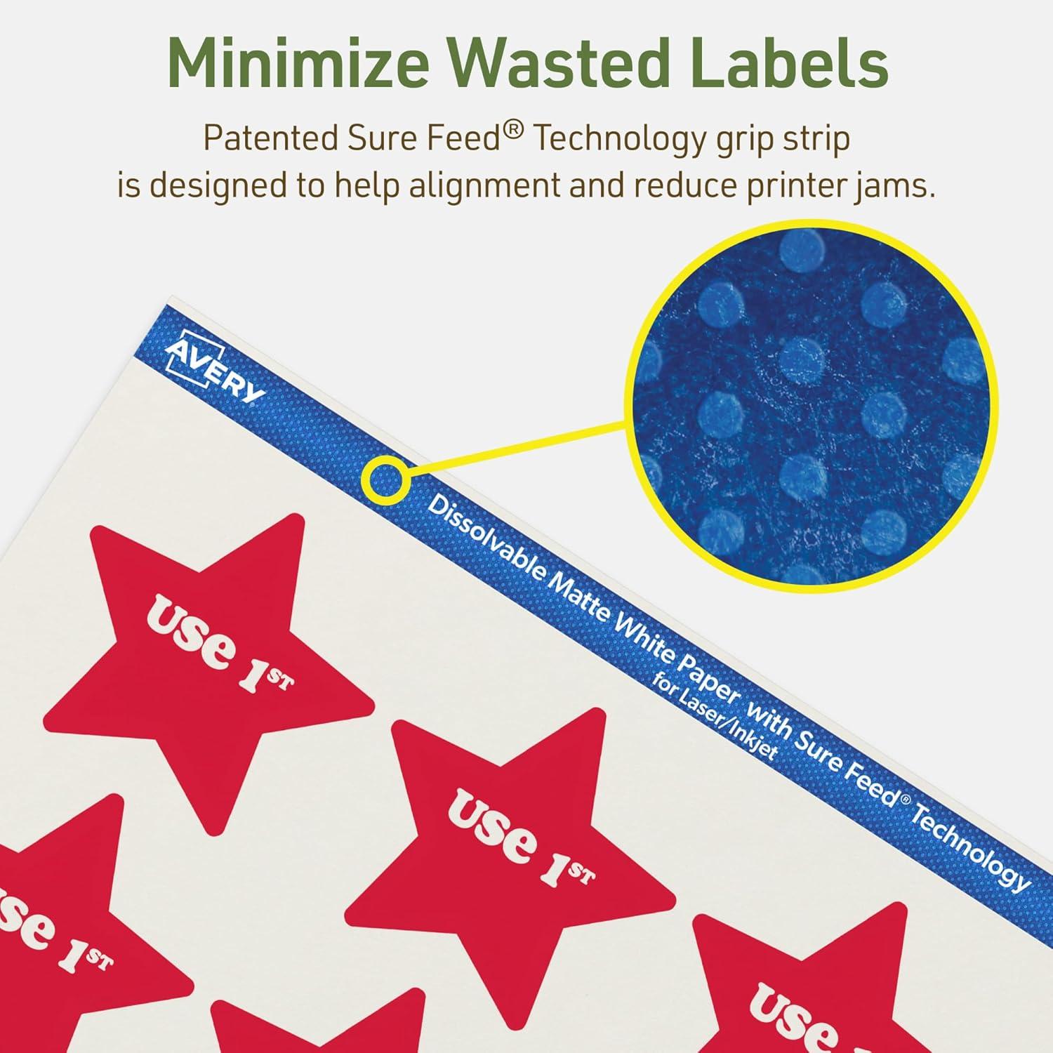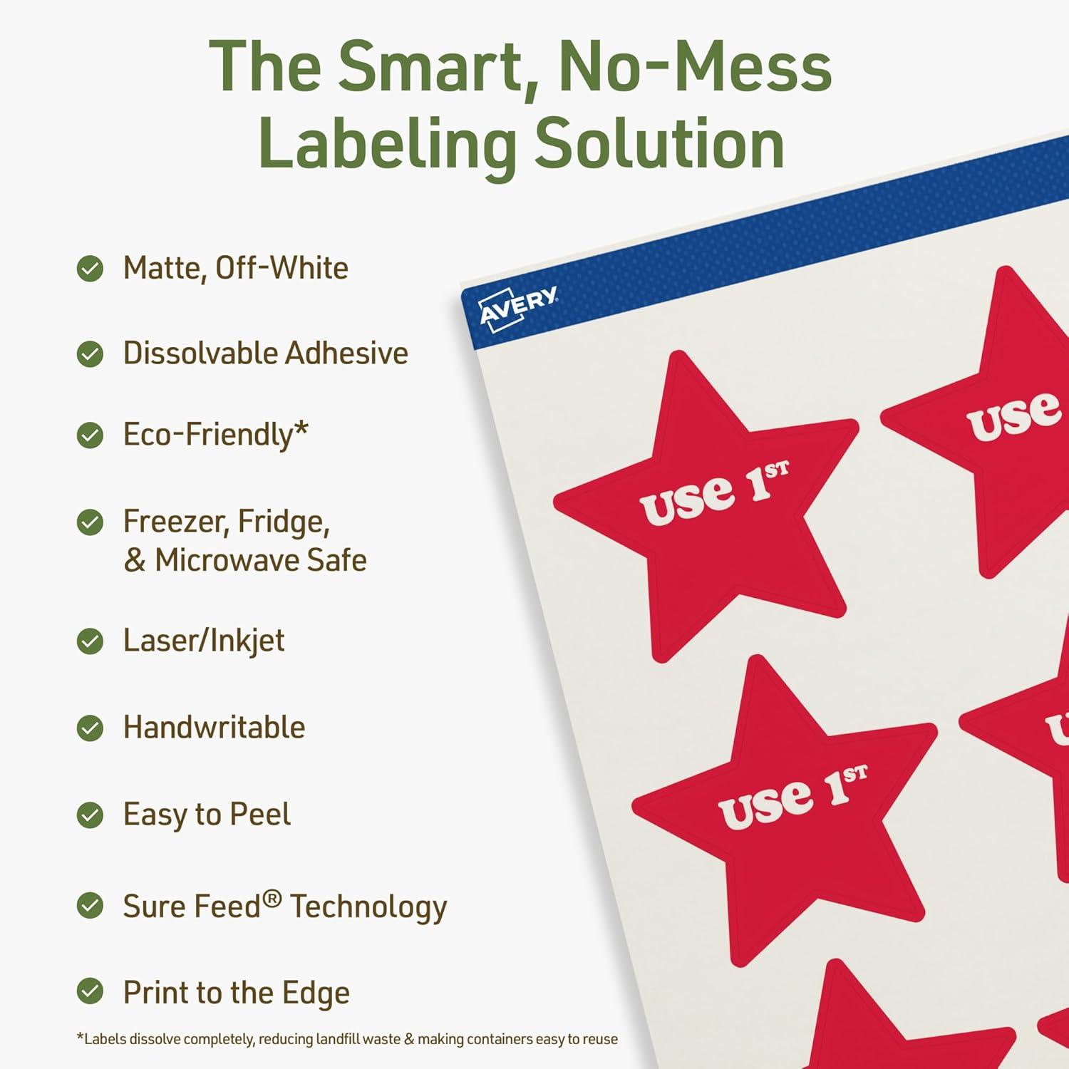 Add a personal touch to container labels, sauce bottle labels, jam labels, and more with Avery Dissolvable Matte White 2-1/4″ x 2-3/8″ Star Labels. Designed for easy cleanup, these printable labels dissolve completely in 30 seconds without leaving behind any sticky residue, making them perfect for reusable containers. Whether you're labeling products, food storage, or meal prep, these labels are freezer-, refrigerator-, and microwave-safe, ensuring they stay in place until you’re ready to wash them away. With an FDA-compliant adhesive for indirect food contact, these sticker labels are a safe, eco-friendly solution for food container labels, beverage labels, bottle labels, and more. They help reduce waste by making it easier to reuse containers while also supporting recycling since they dissolve without adhesive buildup. Sure Feed technology reduces jams or smudges by creating a more reliable feed through your printer. The print-to-the-edge layout lets you print beautiful, full-bleed designs that fill each blank sticker to the edge. Compatible with laser and inkjet printers, these printable labels allow you to create custom labels for home, business, or food service needs. Choose a smarter, more sustainable way to label with these dissolvable Avery labels that keep your kitchen, business, and storage organized without the mess.