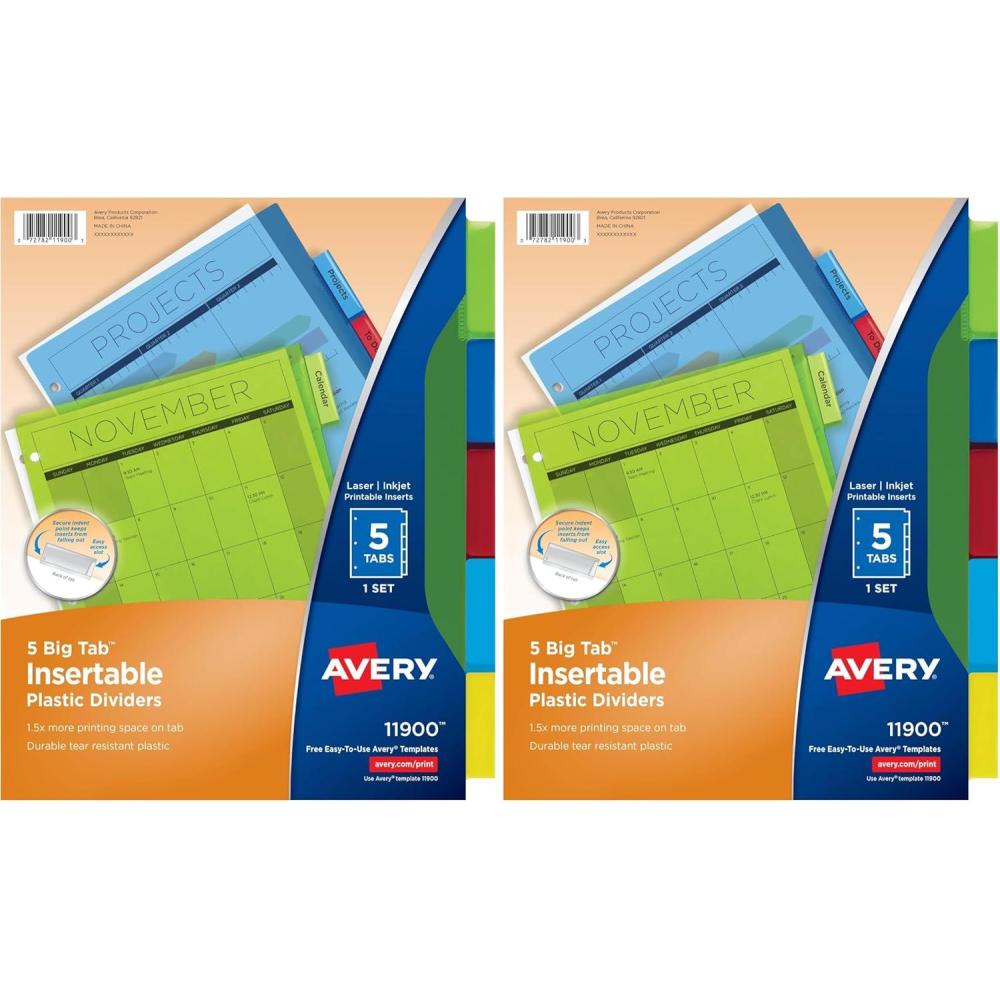 Easily organize school subject binders, recipe binders, office binders and more with Avery plastic page dividers for 3 ring binders. This pack includes 3 sets of 5-tab insertable dividers in a range of different colors for easy color coding at a glance. Each divider is made with a durable plastic material that will last longer than standard paper dividers and wipes clean with most non-abrasive household cleaners. The insertable Big Tab divider tabs are 50% larger than traditional divider tabs and provide extra space for text, logos and images. Each tab also includes an easy access slot to make it simpler to slide tab inserts in and out as well as an indented point to keep the inserts locked in place. A sheet of tab inserts are included that can be printed on with either a laser or inkjet printer and can be written on with pens, permanent markers and pencils. Visit the Avery site for free templates and tools to easily design and print custom tab inserts for any project whether it's for school, home or work.