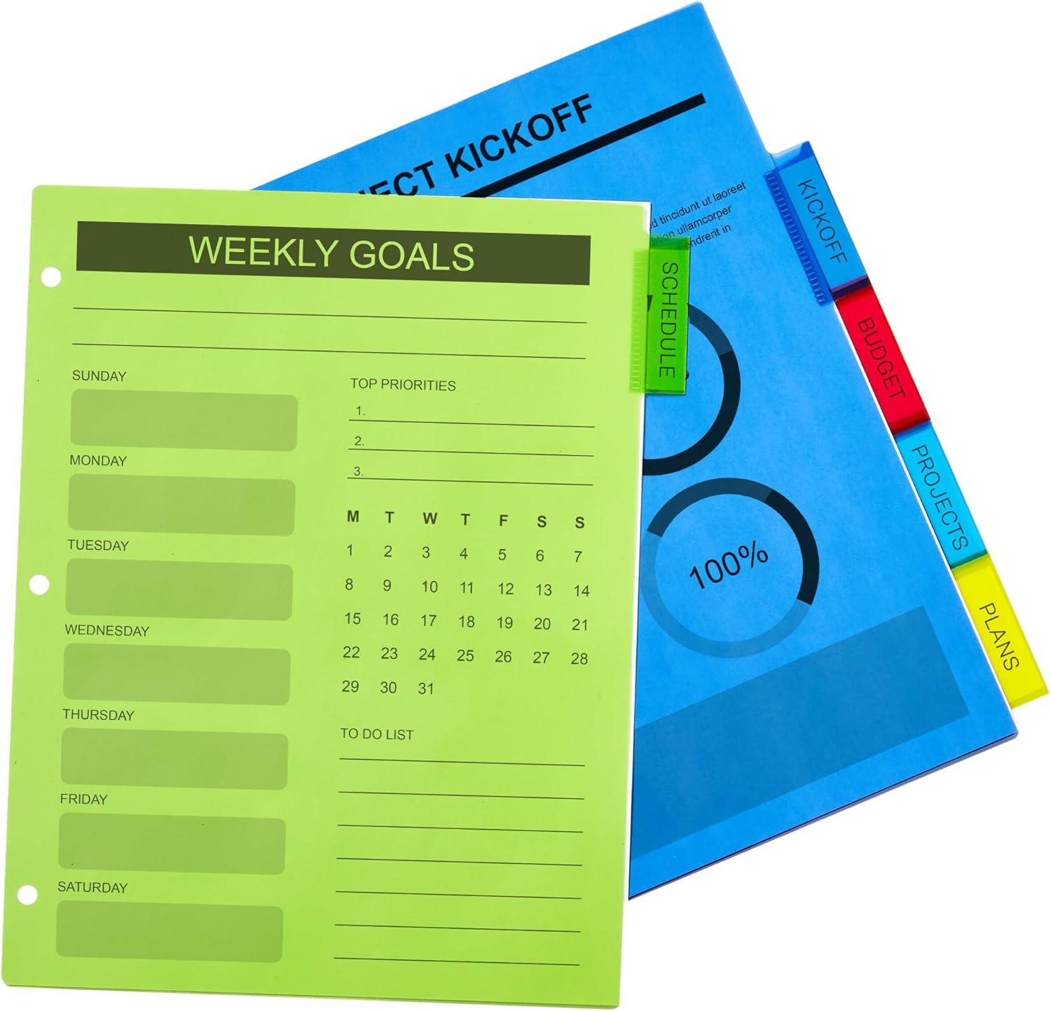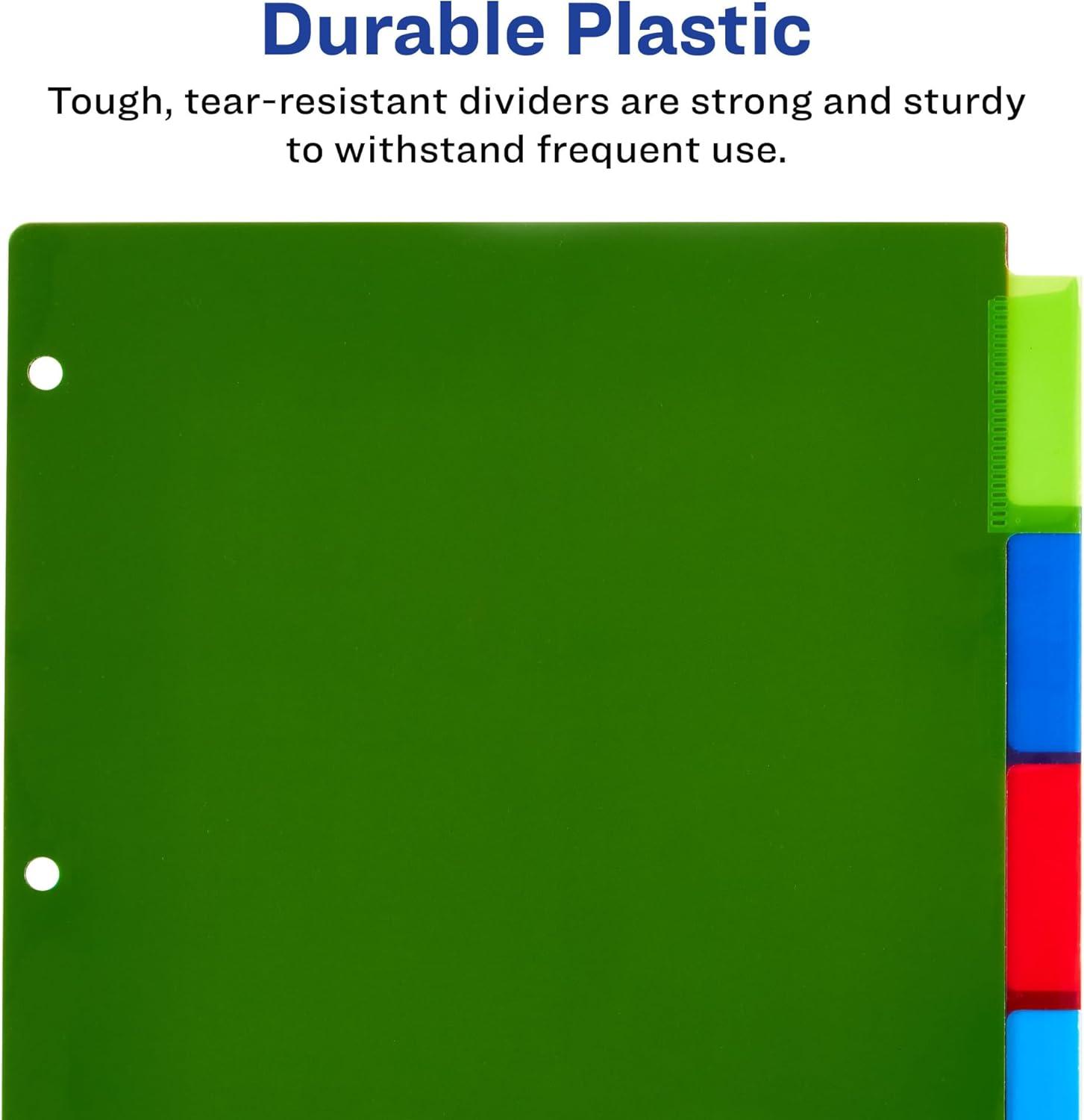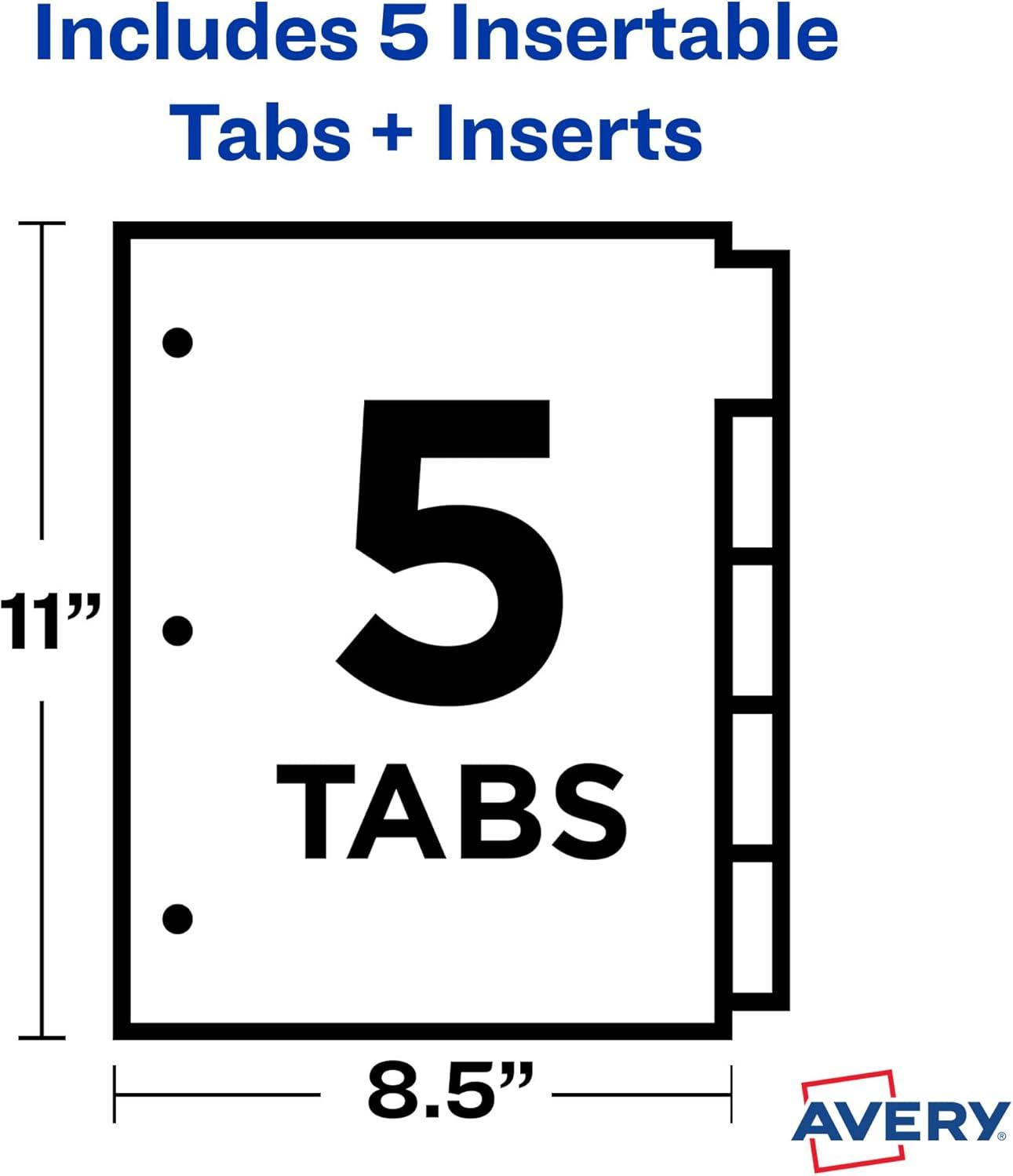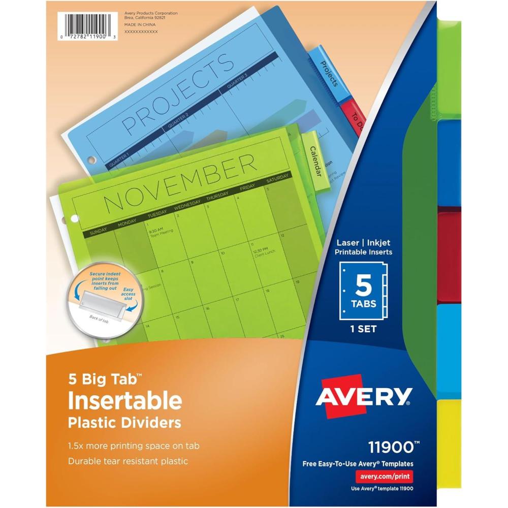 Easily organize school subject binders, recipe binders, office binders and more with Avery plastic page dividers for 3 ring binders. This pack includes 3 sets of 5-tab insertable dividers in a range of different colors for easy color coding at a glance. Each divider is made with a durable plastic material that will last longer than standard paper dividers and wipes clean with most non-abrasive household cleaners. The insertable Big Tab divider tabs are 50% larger than traditional divider tabs and provide extra space for text, logos and images. Each tab also includes an easy access slot to make it simpler to slide tab inserts in and out as well as an indented point to keep the inserts locked in place. A sheet of tab inserts are included that can be printed on with either a laser or inkjet printer and can be written on with pens, permanent markers and pencils. Visit the Avery site for free templates and tools to easily design and print custom tab inserts for any project whether it's for school, home or work.