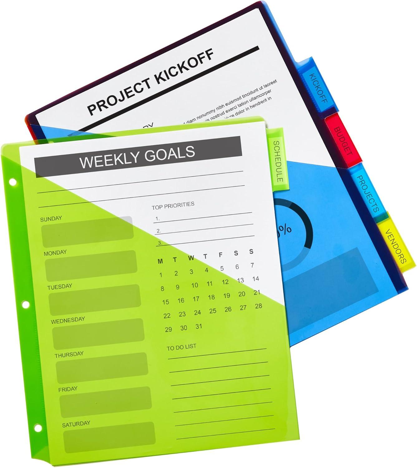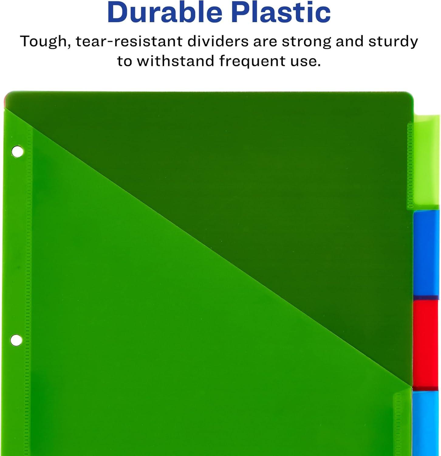 Easily organize school subject binders, recipe binders, office binders and more with Avery plastic page dividers for 3 ring binders. The wide design works perfectly with sheet protectors so that you can still view your tabs at a glance. This pack includes 1 set of 5-tab insertable dividers in a range of different colors for easy color coding at a glance. 1 pocket is attached to every divider for extra storage for loose sheets. Each divider is made with a durable plastic material that will last longer than standard paper dividers and wipes clean with most non-abrasive household cleaners. The insertable Big Tab divider tabs are 50% larger than traditional divider tabs and provide extra space for text, logos and images. Each tab also includes an easy access slot to make it simpler to slide tab inserts in and out as well as an indented point to keep the inserts locked in place. A sheet of tab inserts are included that can be printed on with either a laser or inkjet printer and can be written on with pens, permanent markers and pencils. Visit the Avery site for free templates and tools to easily design and print custom tab inserts for any project whether it's for school, home or work.