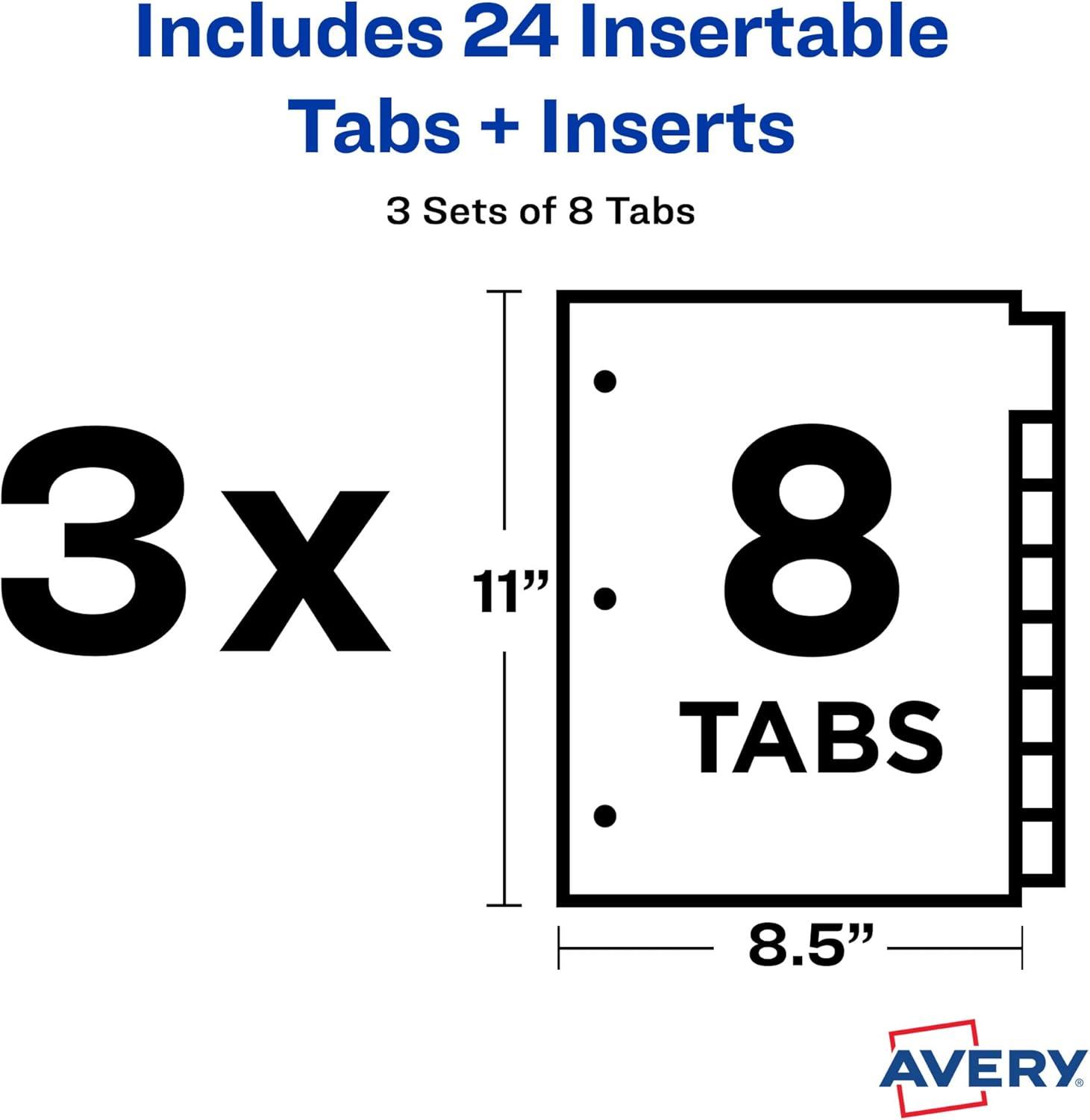 Easily organize school subject binders, recipe binders, office binders and more with Avery plastic page dividers for 3 ring binders. This pack includes 3 sets of 8-tab insertable dividers in a range of different colors for easy color coding at a glance. Each divider is made with a durable plastic material that will last longer than standard paper dividers and wipes clean with most non-abrasive household cleaners. The insertable Big Tab divider tabs are 50% larger than traditional divider tabs and provide extra space for text, logos and images. Each tab also includes an easy access slot to make it simpler to slide tab inserts in and out as well as an indented point to keep the inserts locked in place. A sheet of tab inserts are included that can be printed on with either a laser or inkjet printer and can be written on with pens, permanent markers and pencils. Visit the Avery site for free templates and tools to easily design and print custom tab inserts for any project whether it's for school, home or work.