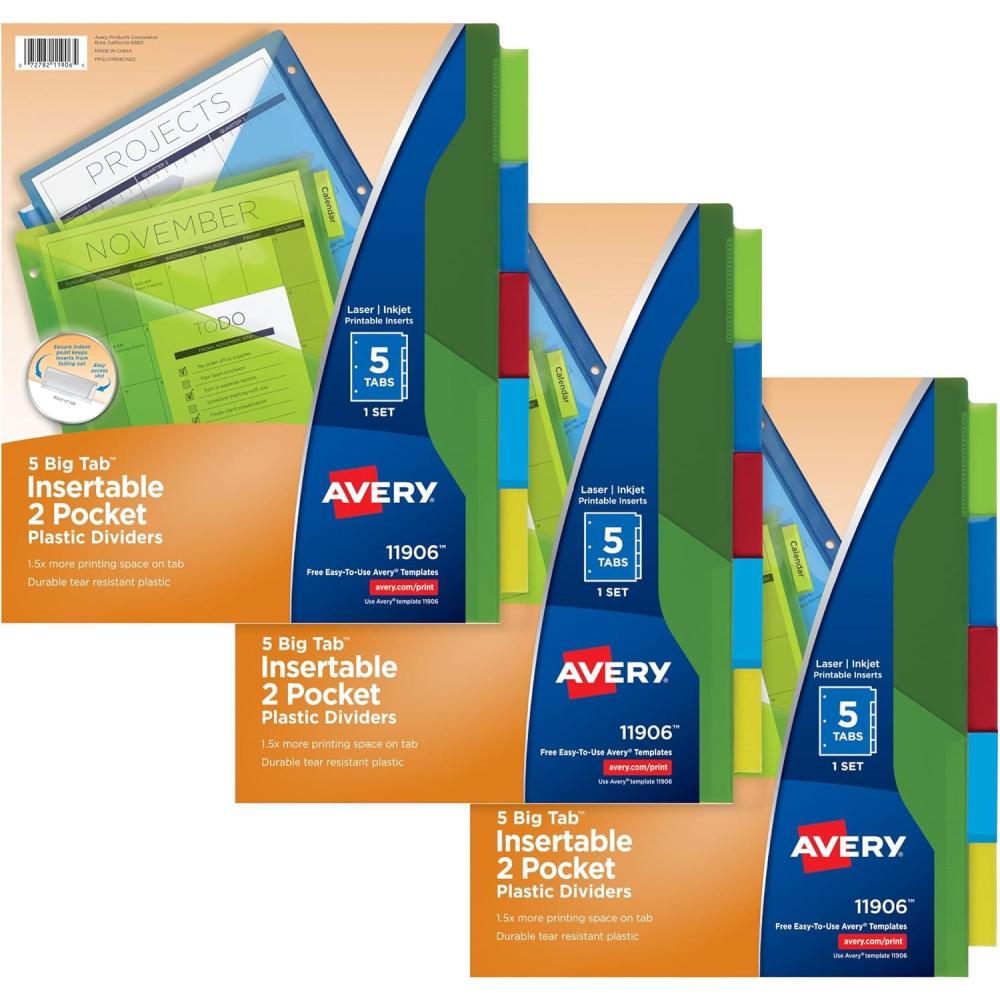 Stay organized with these Avery dividers for 3 ring binders, offering a blend of functionality and durability. Each set comprises multicolored plastic dividers for 3 ring binders with eight tab dividers, for quick classification and access to your documents. Equipped with 2 pockets per divider, these pocket dividers for 3 ring binder with tabs are ideal for storing loose sheets. The durable plastic material for longevity, resisting everyday wear and tear, while being easy to clean. Featuring the wider Big Tab insertable tab design, these binder tabs dividers allow you to display 50% more information than standard tab dividers. The secure indent point on each tab divider helps your inserts stay in place. These notebook dividers with tabs for 3 ring binders are great for creating custom recipe pages, photo albums, or school subject dividers. Available templates on the Avery Design & Print online software facilitate easy creation of personalized divider tabs for any project. This pack includes 3 sets of dividers, each with varying colors, supporting efficient color coding for seamless organization in school, home, or office binders. These pocket folders for 3 ring binders are designed to simplify your filing needs. Enhance your organization with these binder separators with tabs and all your important documents are neatly housed within these reliable 3 ring dividers with tabs.