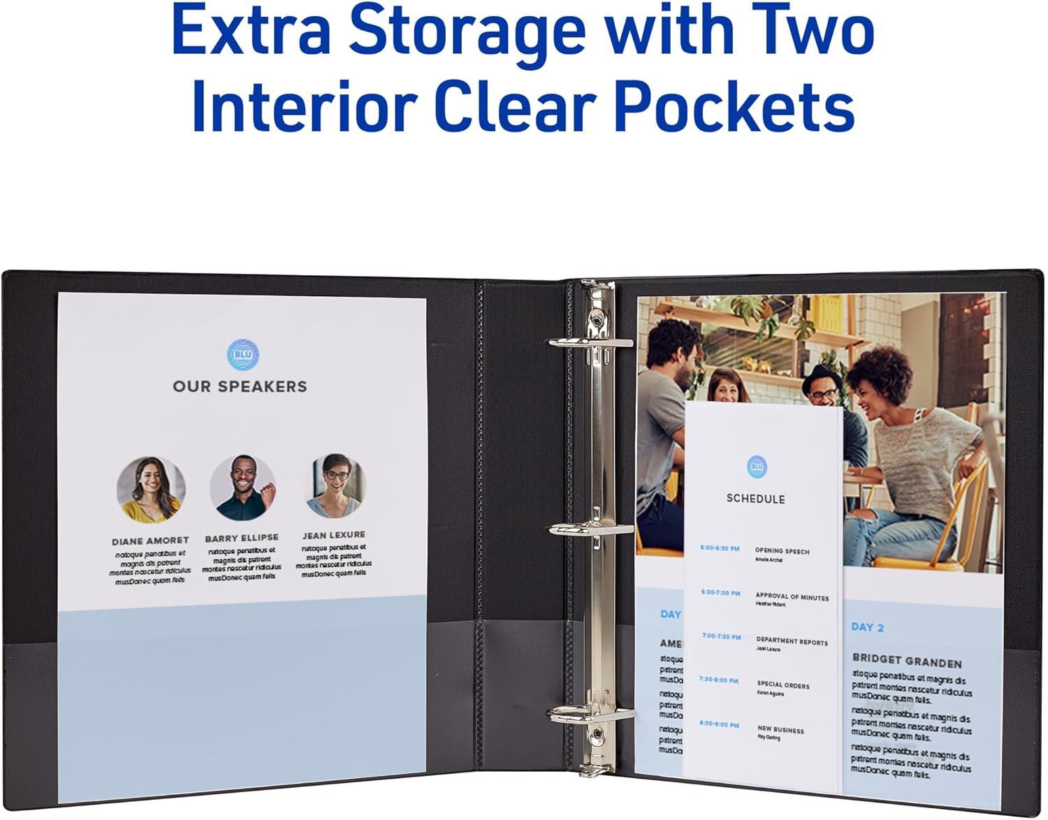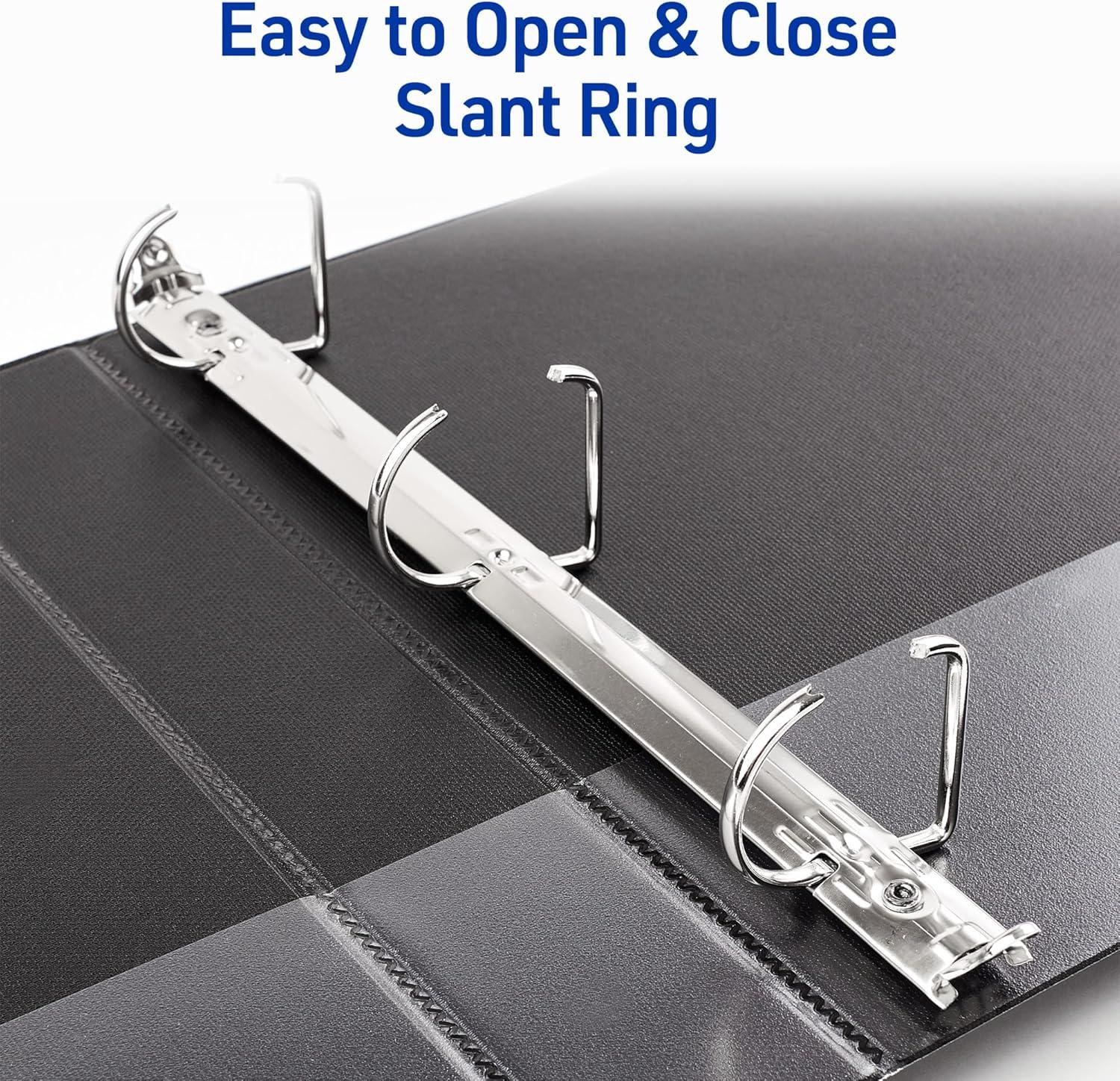 Make sure important paperwork stays with you for the long haul by storing it in this Avery 17024 Durable View Binder in blue. Each 1.5 inch 3 ring binder offers more protection than basic binders with its tear-resistant DuraHinge spine and flexible DuraEdge split-resistant edges. Plus, the deep-weave polypropylene cover makes it resistant to tears, bubbling, and surface wrinkles. Inside, back-mounted rings ensure pages lay flat and turn easily. There’s even extra storage with two interior pockets made of nonstick material that won't lift or transfer ink, keeping documents neat and clean. The ring binder features a 2.1-inch spine and 1.5-inch slant rings that hold up to 375 sheets of 8.5″ x 11″ paper, dividers, or sheet protectors. Perfect for use as a report binder, recipe binder, school binder, presentation binder, photo album, and more. For those who collect trading cards, pair this card binder with Avery's Trading Card Storage Sheets for effortless organization. No matter what you use it for, you can easily personalize your own custom binder using Avery Design & Print and the available cover binder templates, fonts, and designs.