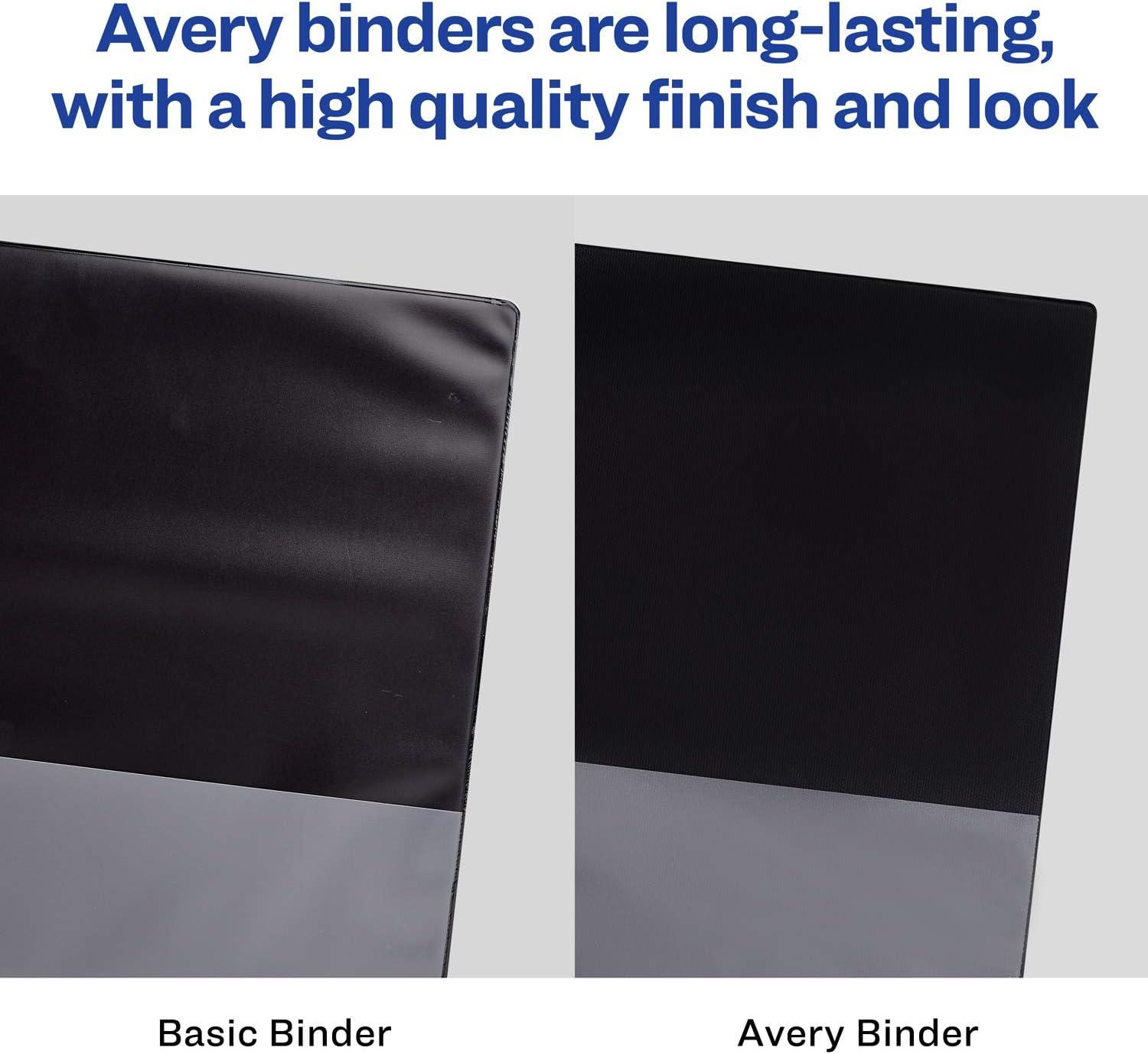 Make sure important paperwork stays with you for the long haul by storing it in this 4-pack of Avery 17034 Durable View Binder in dark blue. These 2 inch 3 ring binders offer more protection than basic binders with their tear-resistant DuraHinge spines and flexible DuraEdge split-resistant edges. Plus, the deep-weave polypropylene cover makes it resistant to tears, bubbling, and surface wrinkles. Inside, back-mounted rings ensure pages lay flat and turn easily. There’s even extra storage with two interior pockets made of nonstick material that won't lift or transfer ink, keeping documents neat and clean. Each ring binder features a 2.8-inch spine and 2-inch slant rings that hold up to 530 sheets of 8.5″ x 11″ paper, dividers, or sheet protectors. Perfect for use as a report binders, recipe binders, school binders, presentation binders, photo albums, and more. For those who collect trading cards, pair this card binder with Avery's Trading Card Storage Sheets for effortless organization. No matter what you use them for, you can easily personalize your own custom binders using Avery Design & Print Online and the available cover binder templates, fonts, and designs.