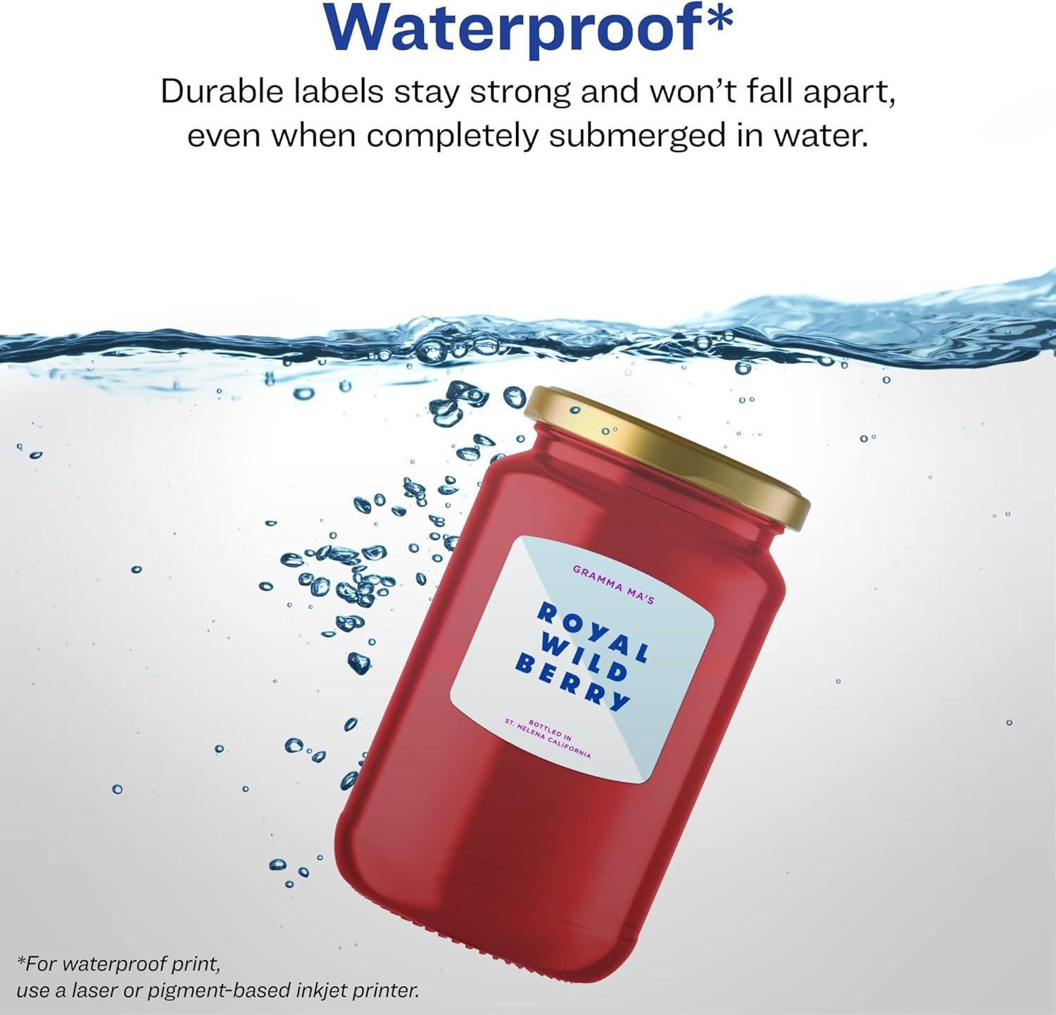 Avery durable waterproof film labels can be completely submerged in water without falling apart and are heat/cold-resistant, oil-resistant, tear-resistant and safe to wipe with household cleaners