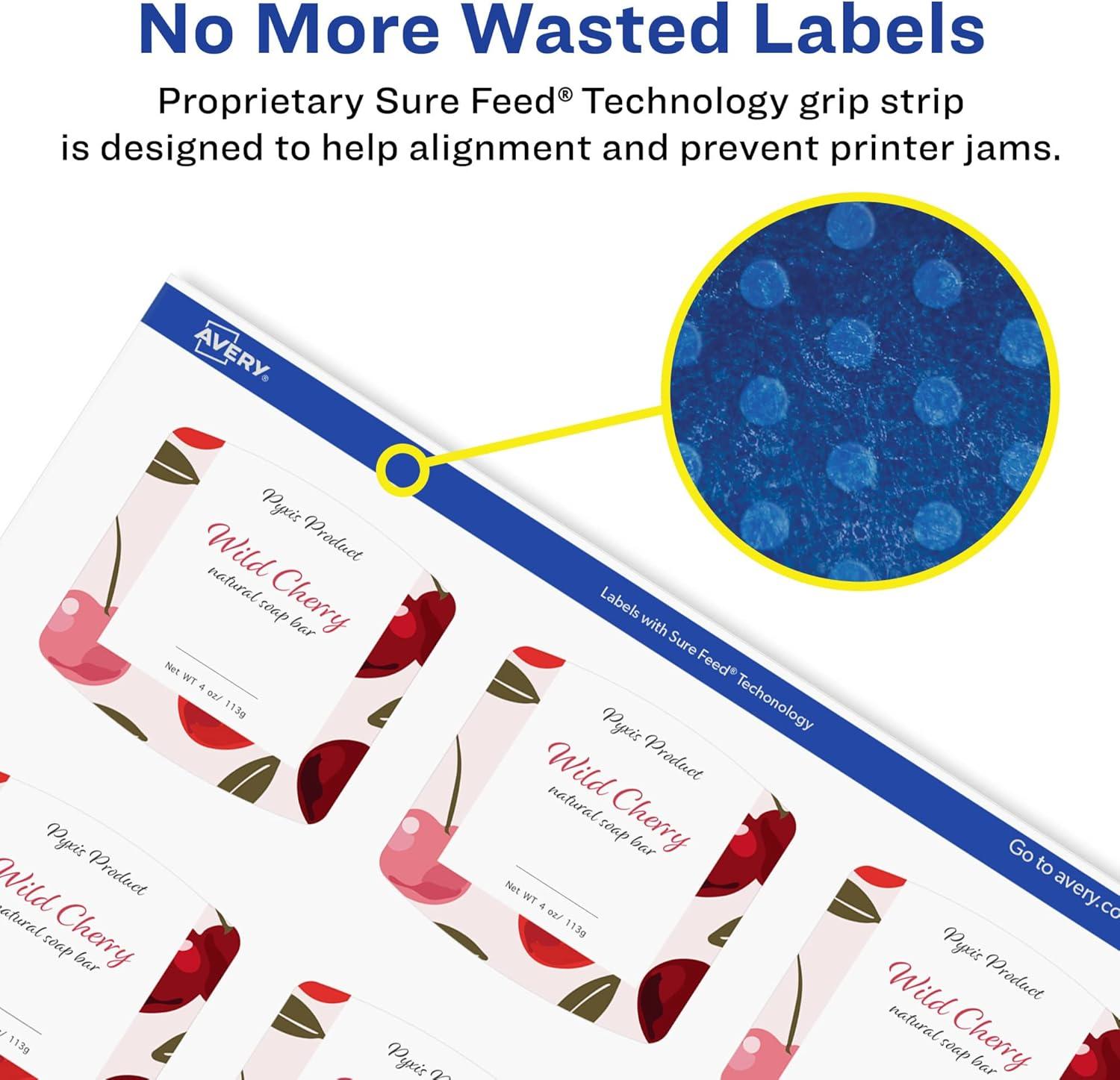 Avery labels with proprietary Sure Feed technology provide a more reliable feed through your printer, preventing misalignments and jams