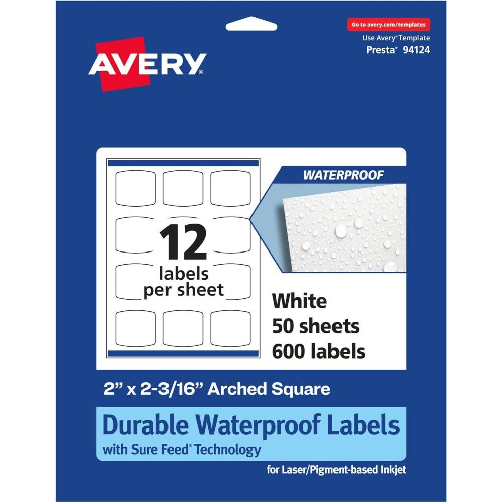 Avery Durable Waterproof Arched Square Labels, Sure Feed Technology, 2" x 2-3/16", 120 Total, Oil and Tear-Resistant Waterproof Labels, Print-to-The-Edge, Laser/Pigment-Based Inkjet Printable(600 labels)