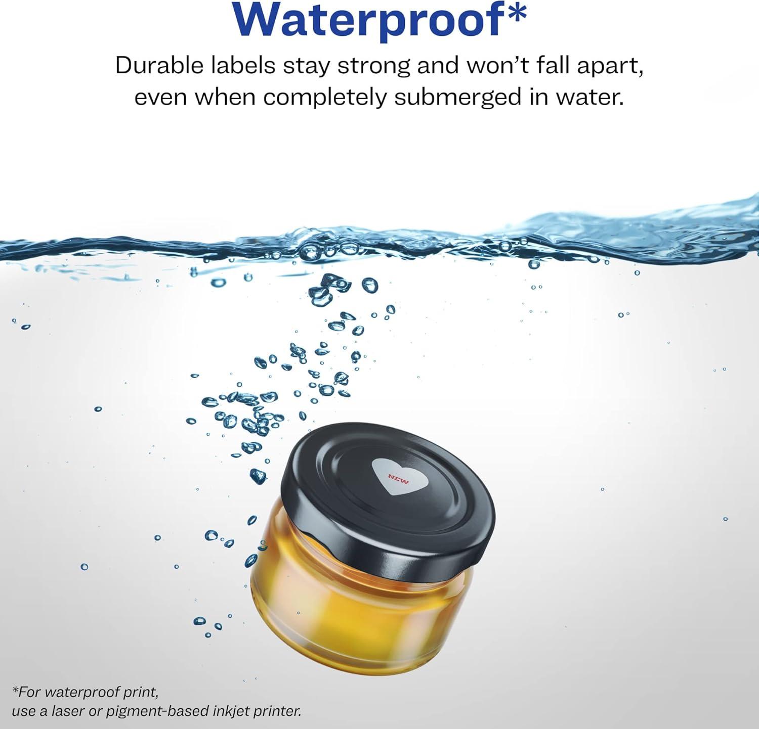 Personalize durable and waterproof reward stickers, decorative labels, mailing seals, product labels, planner stickers and more with Avery 2-9/32″ x 1-27/32″ Durable Waterproof Heart Film Labels. Designed to withstand harsh conditions, Avery durable waterproof labels can be completely submerged in water without falling apart. They are also resistant to damage from heat, cold, oil and tearing and are also safe to wipe with household cleaners. Avery heart labels are carefully constructed with patented features to provide the best results Sure Feed technology prevents jams or smudges by creating a more reliable feed through your printer. The print-to-the-edge layout lets you print beautiful full-bleed designs that fill each blank sticker to the edge. These waterproof heart labels are compatible with both laser and pigment-based inkjet printers* so that you can effortlessly print bold, bright colors and clear, sharp text. The sturdy permanent label adhesive makes sure that your labels stick and stay to a variety of surfaces without peeling, curling or falling off. Easily customize labels with your own designs, art, symbols and messaging by using the label templates and designs on the Avery website. *Please Note: Avery durable waterproof labels are compatible with laser printers and pigment-based inkjet printers but are not compatible with traditional dye-based inkjet printers. Ink from dye-based inkjet printers will smear when exposed to water. Please check your printer's manual to confirm if you are using pigment-based ink.