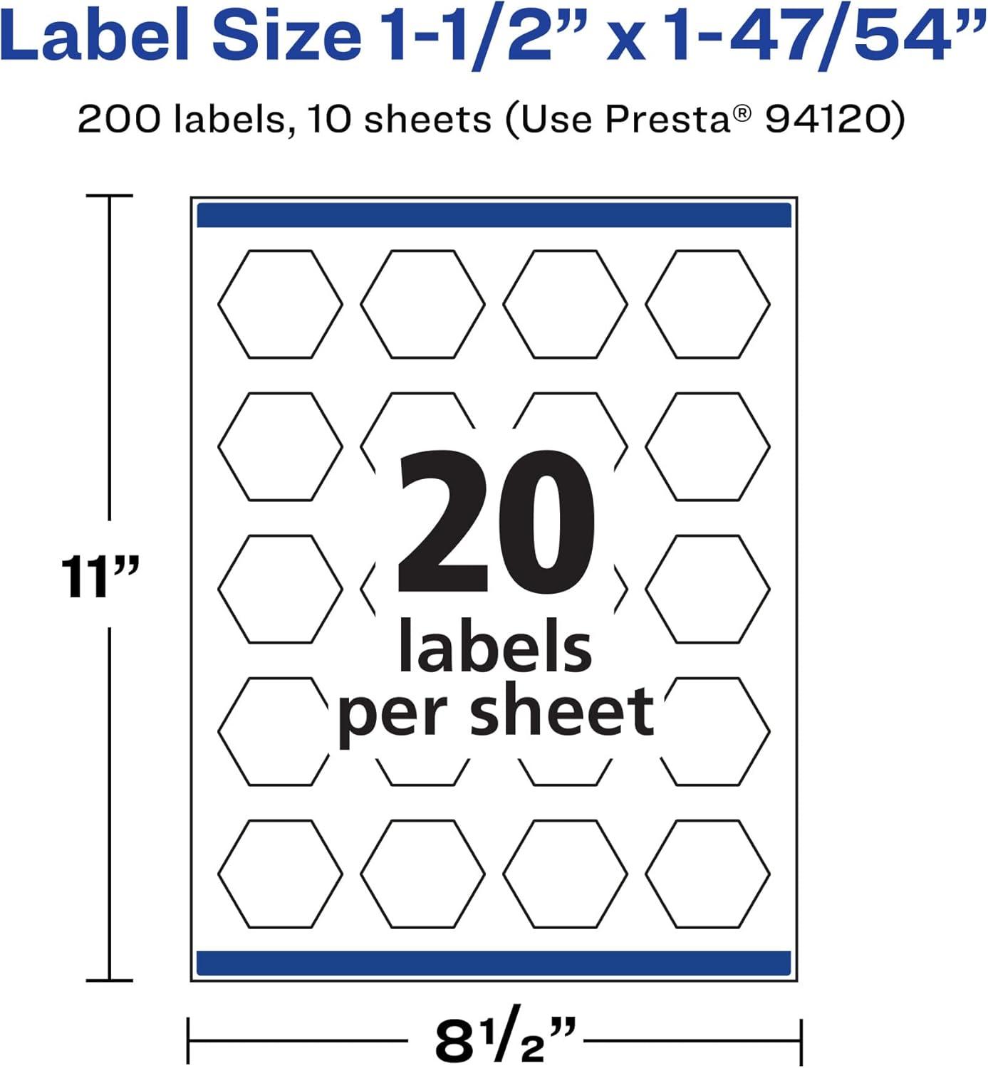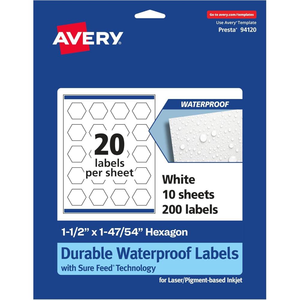 Avery Durable Waterproof Hexagon Labels, Sure Feed Technology, 1-1/2" x 1-47/54", 200 Total, Oil and Tear-Resistant Waterproof Labels, Print-to-The-Edge, Laser/Pigment-Based Inkjet Printable(200 labels)