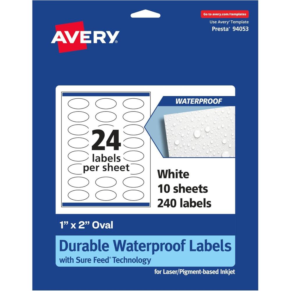 Personalize durable and waterproof labels for food containers, mason jar labels, canning labels, ingredient labels, soap jar labels and more with Avery 1″ x 2″ Durable Waterproof Oval Film Labels. Designed to withstand harsh conditions, Avery durable waterproof labels can be completely submerged in water without falling apart. They are also resistant to damage from heat, cold, oil and tearing and are also safe to wipe with household cleaners. Avery oval labels are carefully constructed with patented features to provide the best results Sure Feed technology prevents jams or smudges by creating a more reliable feed through your printer. The print-to-the-edge layout lets you print beautiful full-bleed designs that fill each blank sticker to the edge. The patented Easy Peel label design makes these labels easy to peel and quick to apply. Just bend the label sheet, peel off your labels and fold the sheet back flat. These waterproof oval labels are compatible with both laser and pigment-based inkjet printers* so that you can effortlessly print bold, bright colors and clear, sharp text. The sturdy permanent label adhesive makes sure that your labels stick and stay to a variety of surfaces without peeling, curling or falling off. Easily customize labels with your own designs, art, symbols and messaging by using the label templates and designs on the Avery website. *Please Note: Avery durable waterproof labels are compatible with laser printers and pigment-based inkjet printers but are not compatible with traditional dye-based inkjet printers. Ink from dye-based inkjet printers will smear when exposed to water. Please check your printer's manual to confirm if you are using pigment-based ink.