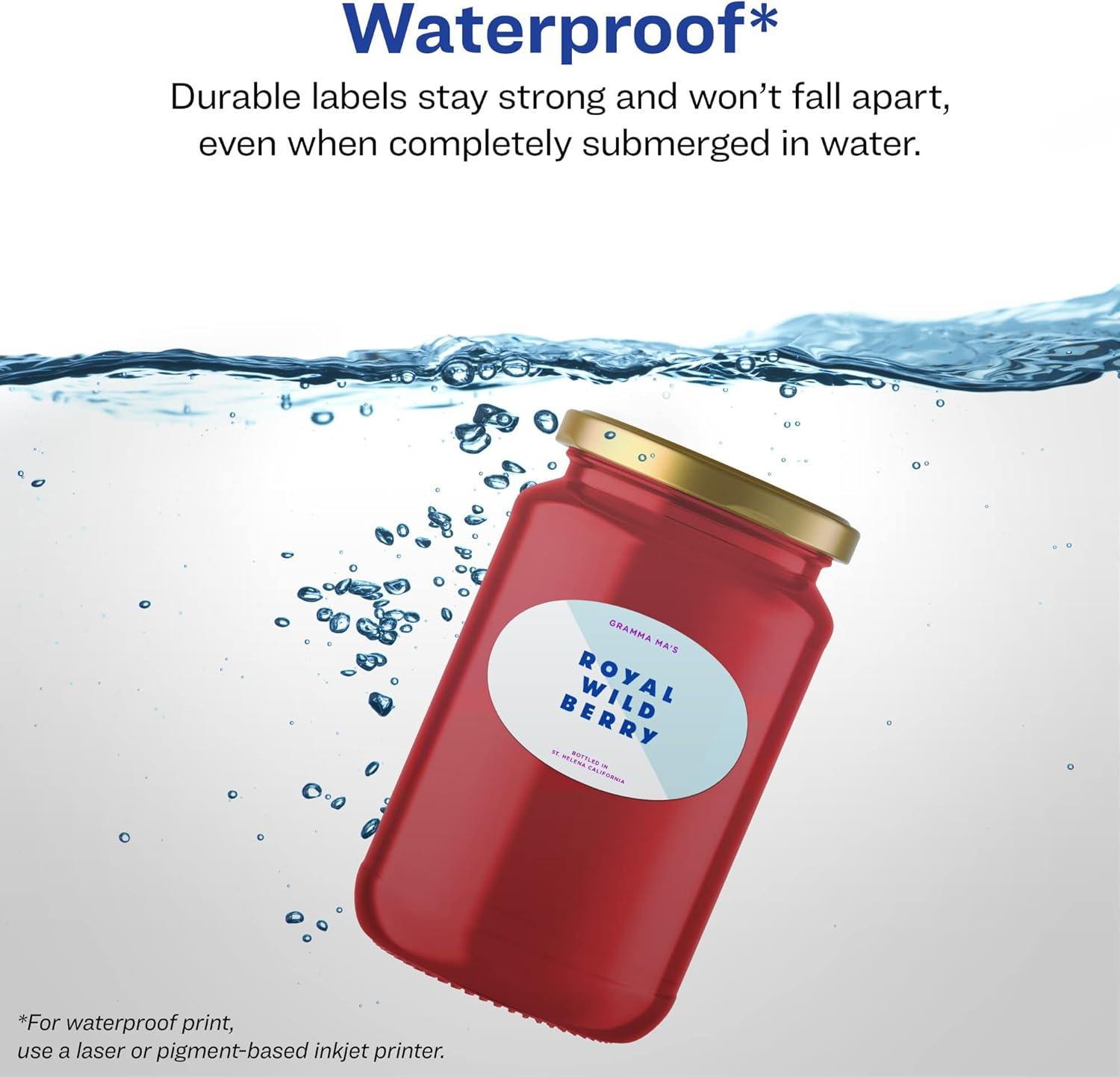 Personalize durable and waterproof labels for food containers, mason jar labels, canning labels, ingredient labels, soap jar labels and more with Avery 2″ x 3-1/3″ Durable Waterproof Oval Film Labels. Designed to withstand harsh conditions, Avery durable waterproof labels can be completely submerged in water without falling apart. They are also resistant to damage from heat, cold, oil and tearing and are also safe to wipe with household cleaners. Avery oval labels are carefully constructed with patented features to provide the best results Sure Feed technology prevents jams or smudges by creating a more reliable feed through your printer. The print-to-the-edge layout lets you print beautiful full-bleed designs that fill each blank sticker to the edge. The patented Easy Peel label design makes these labels easy to peel and quick to apply. Just bend the label sheet, peel off your labels and fold the sheet back flat. These waterproof oval labels are compatible with both laser and pigment-based inkjet printers* so that you can effortlessly print bold, bright colors and clear, sharp text. The sturdy permanent label adhesive makes sure that your labels stick and stay to a variety of surfaces without peeling, curling or falling off. Easily customize labels with your own designs, art, symbols and messaging by using the label templates and designs on the Avery website. *Please Note: Avery durable waterproof labels are compatible with laser printers and pigment-based inkjet printers but are not compatible with traditional dye-based inkjet printers. Ink from dye-based inkjet printers will smear when exposed to water. Please check your printer's manual to confirm if you are using pigment-based ink.