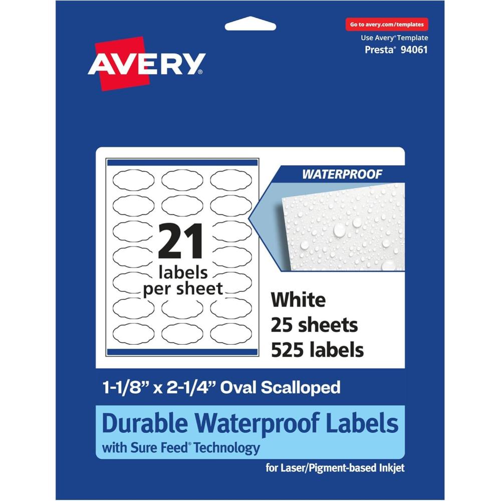 Avery Durable Waterproof Oval Scalloped Labels, Sure Feed Technology, 1-1/8" x 2-1/4", 210 Total, Oil and Tear-Resistant Waterproof Labels, Print-to-The-Edge, Laser/Pigment-Based Inkjet Printable(525 labels)