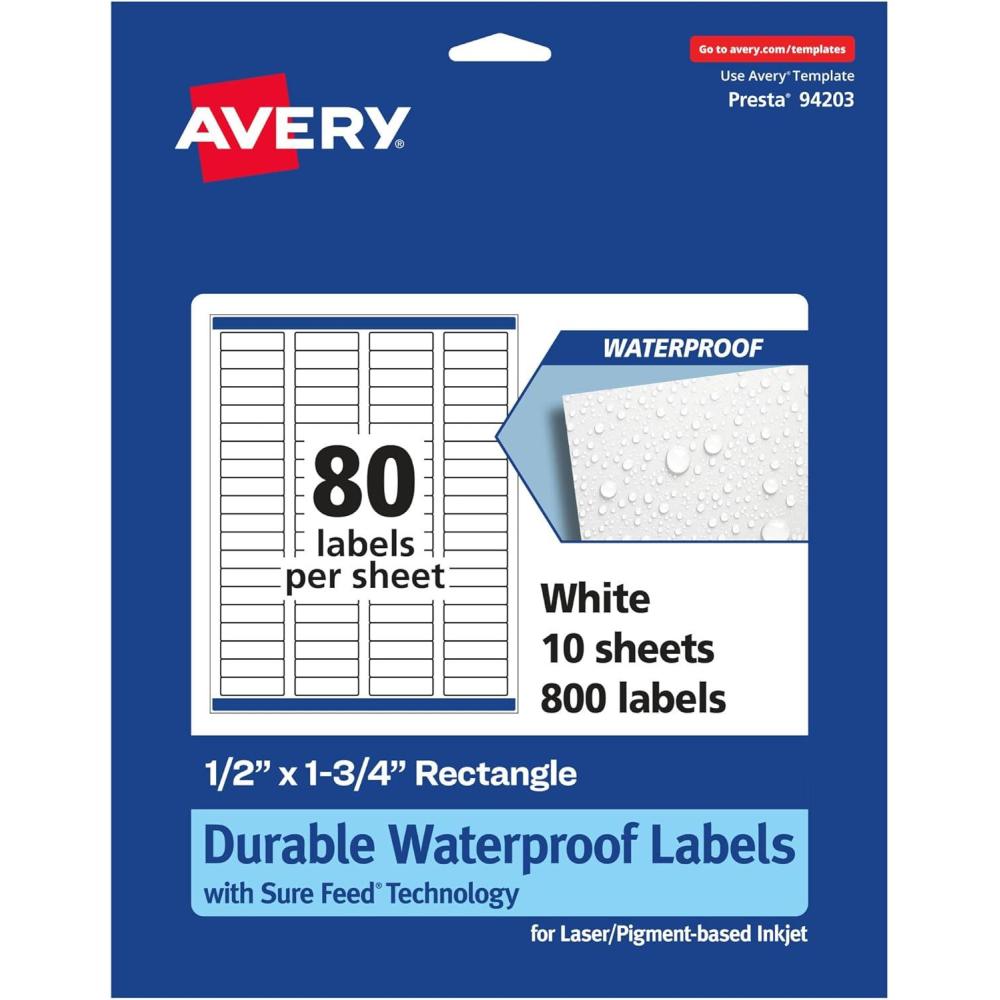 Avery Durable Waterproof Rectangle Labels, Sure Feed Technology, 0.5″ x 1.75″, 800 Total, Oil and Tear-Resistant, Waterproof, Laser/Pigment-Based Inkjet Printable(800 labels)