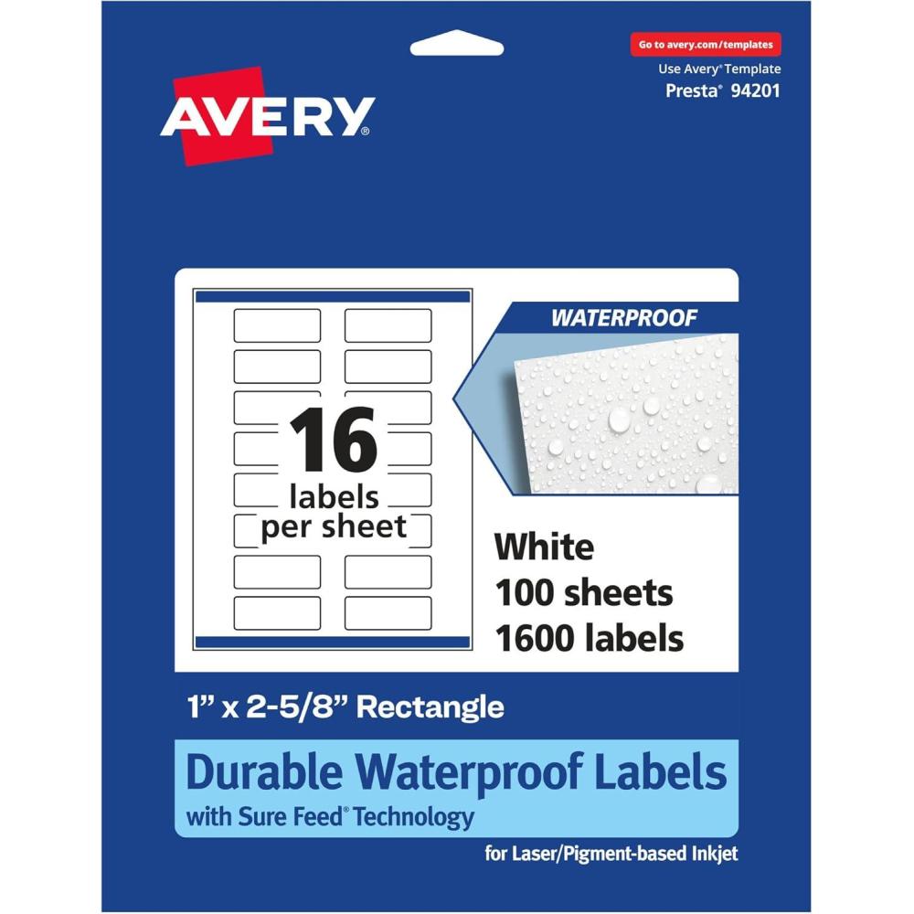 Avery Durable Waterproof Rectangle Labels, Sure Feed Technology, 1" x 2-5/8", 160 Total, Oil and Tear-Resistant Waterproof Labels, Print-to-The-Edge, Laser/Pigment-Based Inkjet Printable(1 600 labels)
