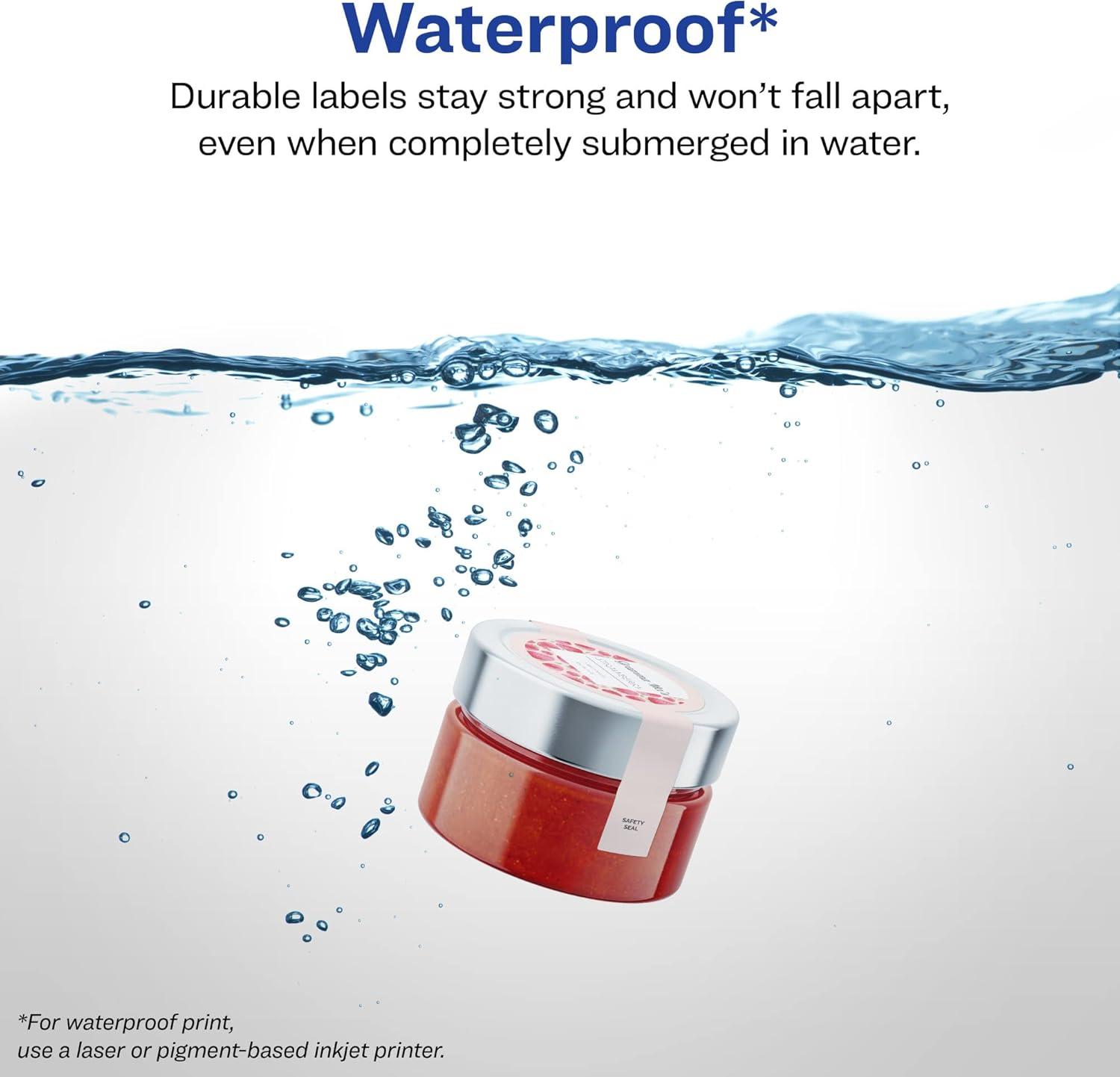 Avery durable waterproof film labels can be completely submerged in water without falling apart and are heat/cold-resistant, oil-resistant, tear-resistant and safe to wipe with household cleaners