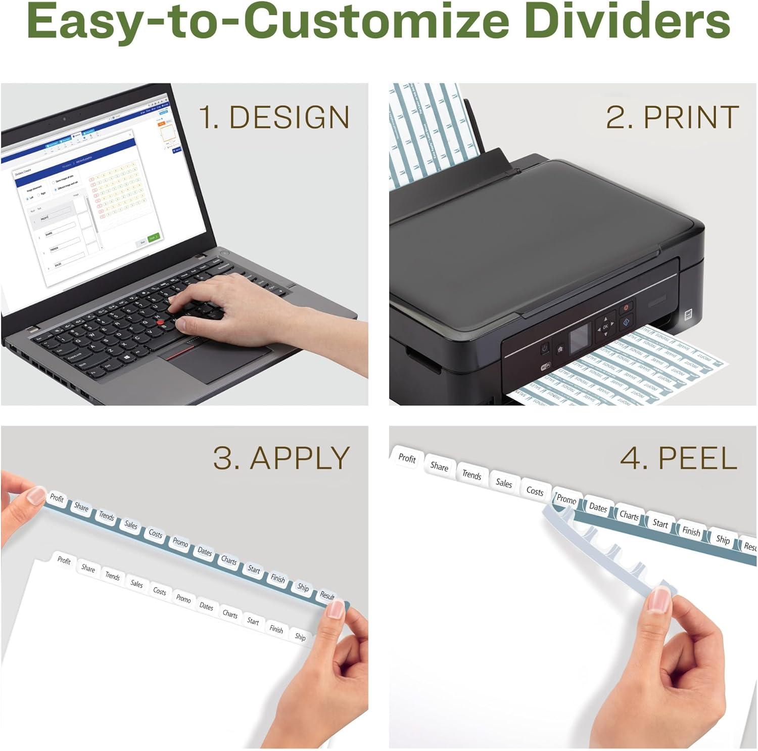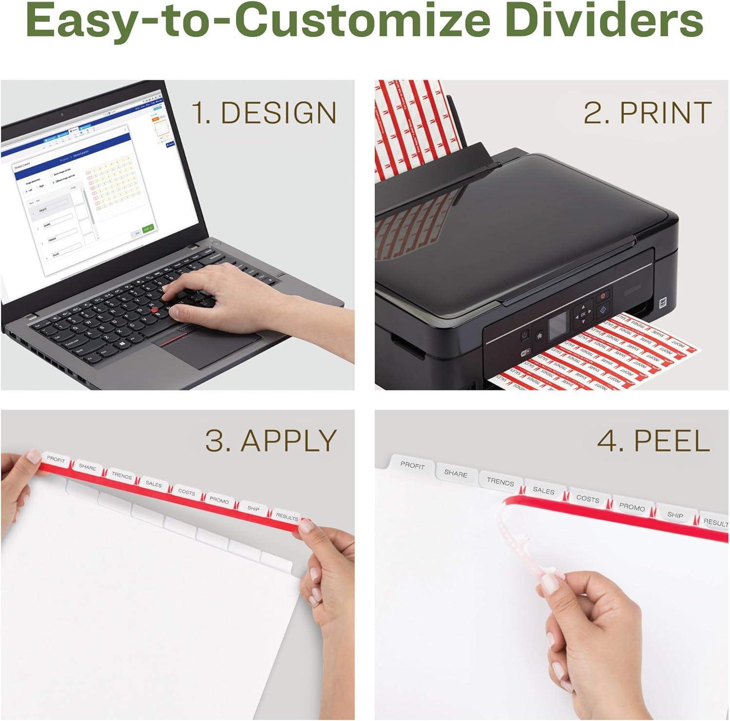 Compatible with both laser and inkjet printers, the divider tab labels are easily customizable with the templates and tools on the Avery site