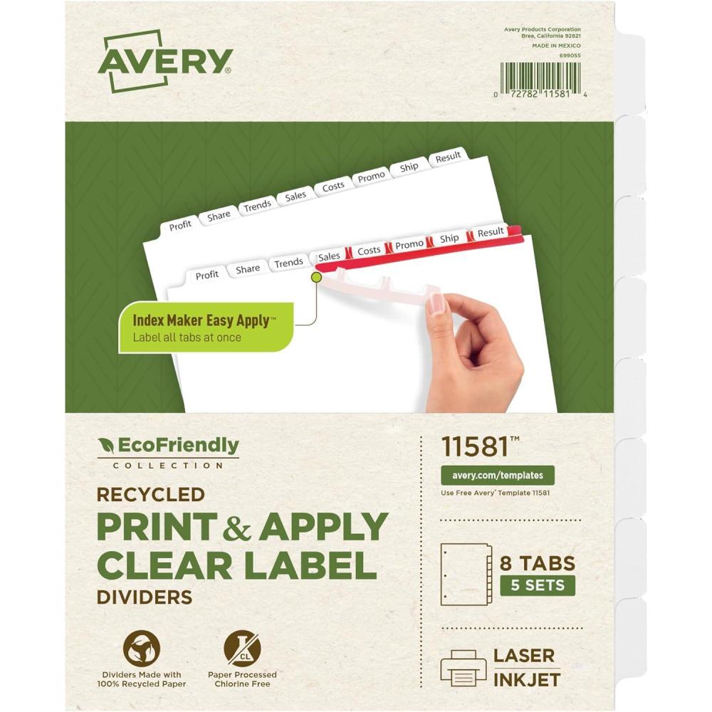 Designed for the environmentally aware, Avery 11582 EcoFriendly Recycled Print & Apply Clear Label 12-Tab Dividers are perfect for people looking to reduce their impact on the environment. These recycled products are made from 100% post-consumer recycled paper. Divider paper is also sourced responsibly to ensure the responsible use of resources from the world's forests. The divider paper is processed chlorine-free so that the number of harmful substances associated with the manufacturing process are substantially reduced. The dividers are also curbside recyclable, simply remove the plastic tabs and the reinforced strip to recycle the paper material. The Avery Index Maker design arranges the divider tab labels in strips so that you can easily apply all of the tab labels at once. The clear tab label material applies seamlessly to create a printed-on look. Personalize your own designs with the templates available on the Avery site and print with a laser or inkjet printer. Whether you're creating school subject dividers, office binder dividers, or recipe binder dividers, Avery makes it easy to bring your designs to life.