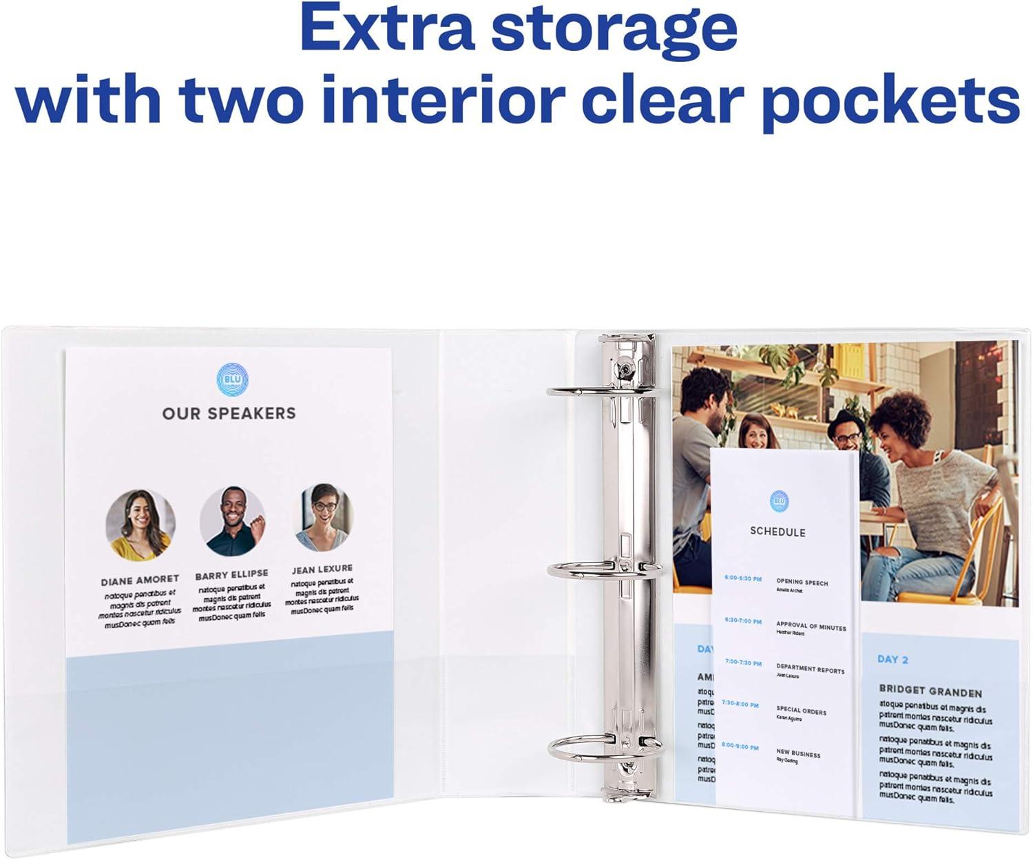 Discover sturdy simplicity in a convenient and lightweight package. This Economy View Binder offers a handy solution to your organization needs. Open and close the rings with ease to add or remove papers as needed. Metal round rings mounted on the spine hold pages securely. Tuck important handouts, pamphlets and other loose or unpunched paperwork into the two interior pockets for quick access. Each pocket holds up to 20 sheets. Put your personal stamp on the binder by designing a customized cover and slipping it into the overlays on the front, spine and back. You can find inspiration in the free, easy-to-use templates available online. Binder also features vinyl construction, a sturdy chipboard core and exposed rivets.