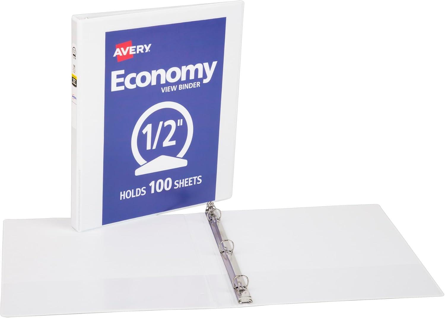 The Avery Economy View 1 inch binder is a basic binder that exceeds expectation.Unlike other basic binders, this Economy binder is fully adhered with a deep-weave polypropylene cover that is resistant to bubbling and surface wrinkles.It also has a textured pattern that is tear-resistant. The interior of this binder is just as impressive as its exterior.With back-mounted rings, your pages will never curl again.Pages lay flat and are easy to turn, while the cover opens and closes without pulling on your papers.Enjoy extra organization and storage capabilities with two interior clear pockets made of nonstick material that won't lift or transfer ink from your documents. This set of 12 white Economy binders is perfect for light usage like filing important documents or building a presentation book.Each binder holds up to 175 sheets of paper with 1 inch capacity rings.Rings are standard 3-hole spaced and accommodate 8.5″ x 11″ pages nicely.All Economy binders are made with PVC-free material.Personalize your view binder using the free templates, fonts, and designs at avery.com/templates.