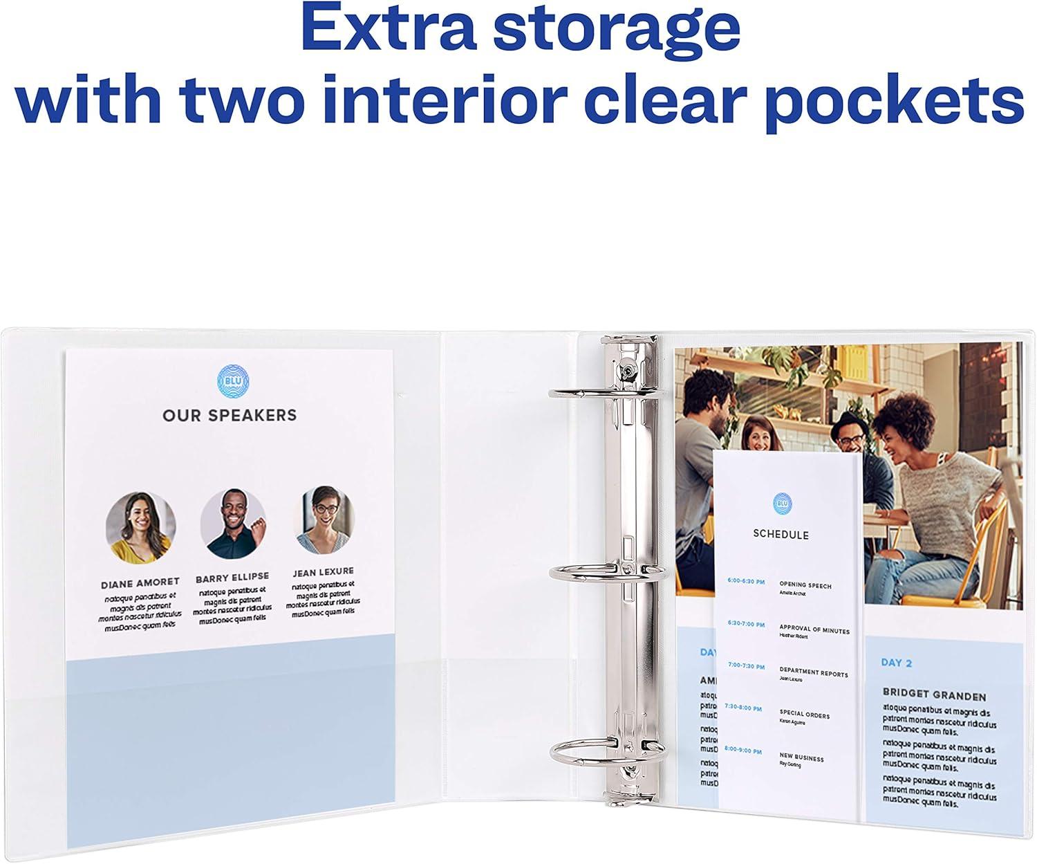 The Avery Economy View 1 inch binder is a basic binder that exceeds expectation.Unlike other basic binders, this Economy binder is fully adhered with a deep-weave polypropylene cover that is resistant to bubbling and surface wrinkles.It also has a textured pattern that is tear-resistant. The interior of this binder is just as impressive as its exterior.With back-mounted rings, your pages will never curl again.Pages lay flat and are easy to turn, while the cover opens and closes without pulling on your papers.Enjoy extra organization and storage capabilities with two interior clear pockets made of nonstick material that won't lift or transfer ink from your documents. This set of 12 white Economy binders is perfect for light usage like filing important documents or building a presentation book.Each binder holds up to 175 sheets of paper with 1 inch capacity rings.Rings are standard 3-hole spaced and accommodate 8.5″ x 11″ pages nicely.All Economy binders are made with PVC-free material.Personalize your view binder using the free templates, fonts, and designs at avery.com/templates.