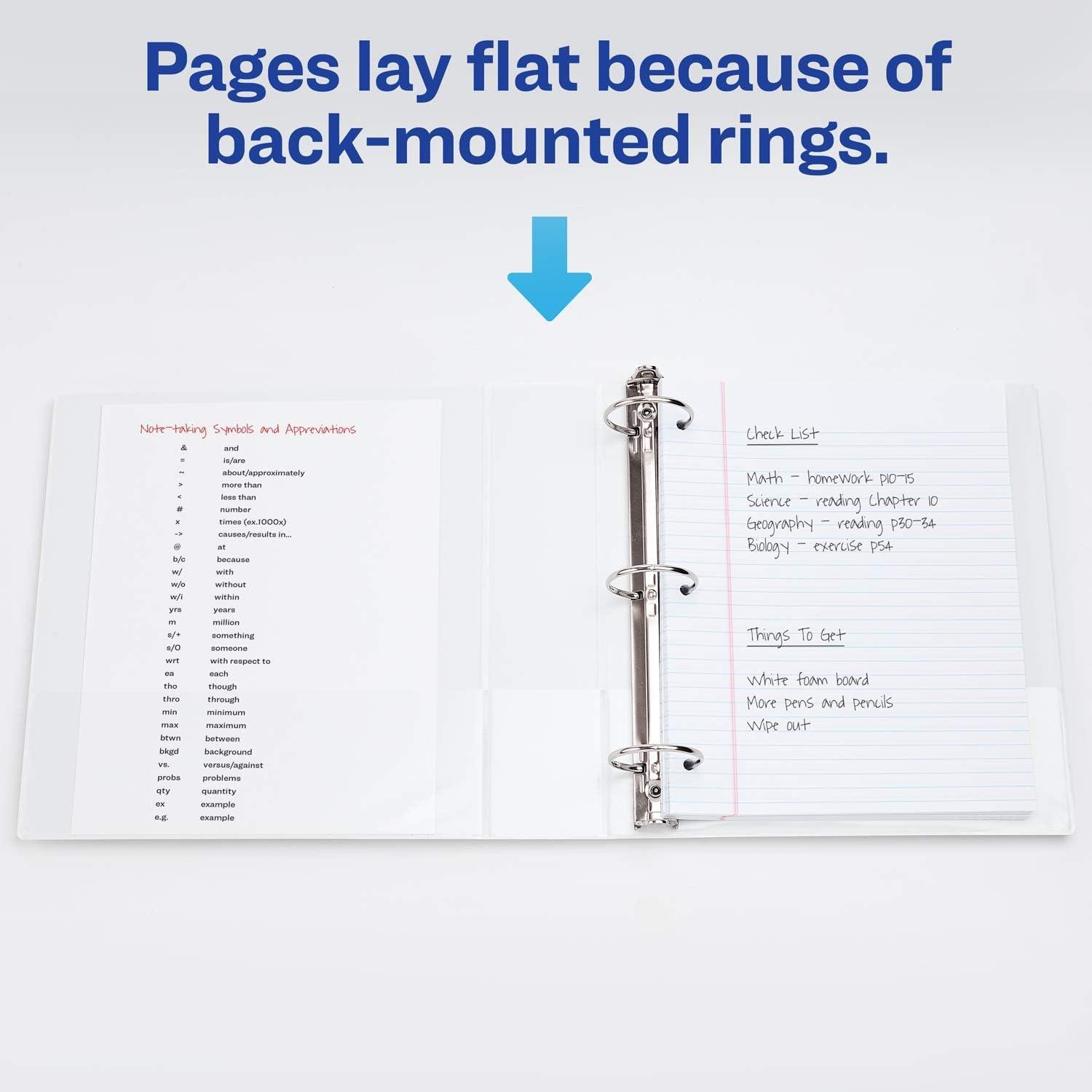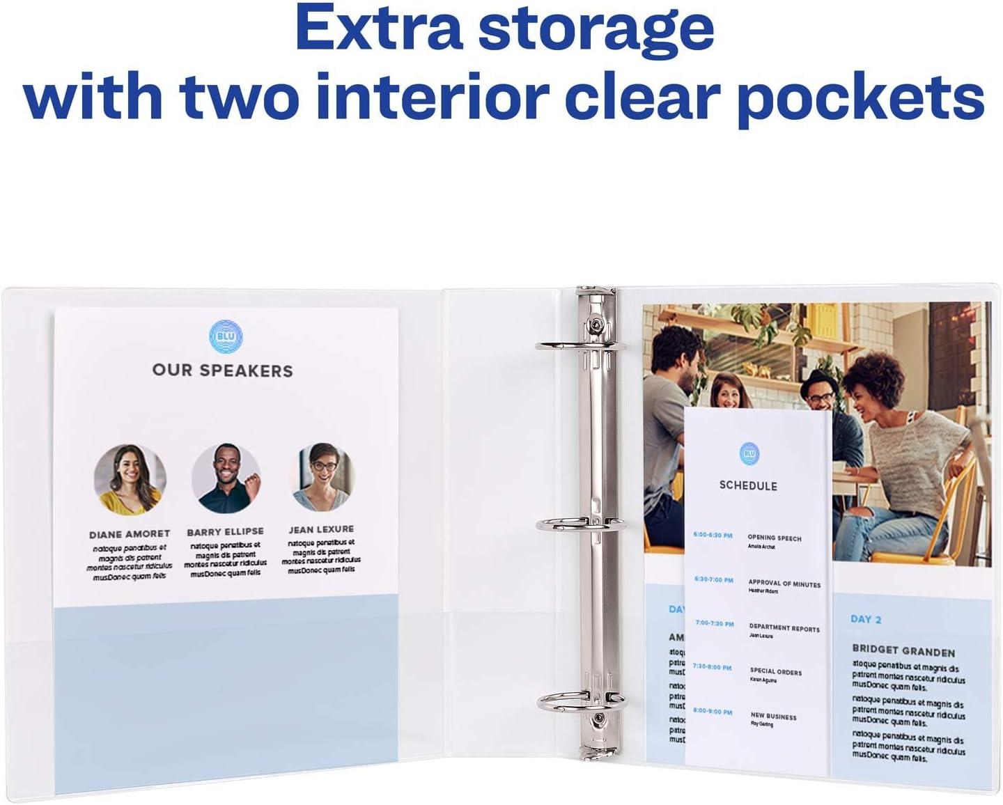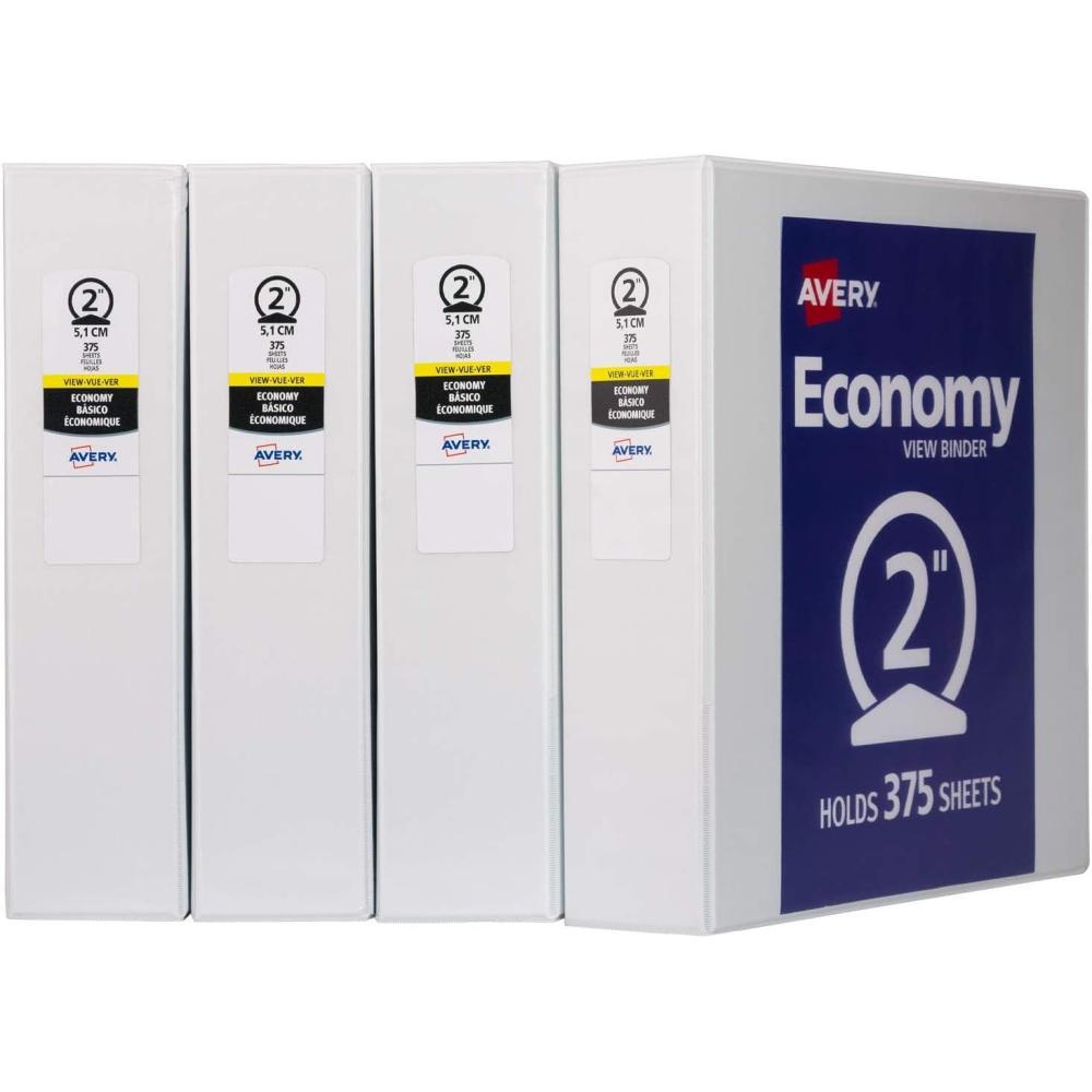 The Avery Economy View 3 inch binder is a basic binder that exceeds expectation.Unlike other basic binders, this Economy binder is fully adhered with a deep-weave polypropylene cover that is resistant to bubbling and surface wrinkles.It also has a textured pattern that is tear-resistant. The interior of this binder is just as impressive as its exterior.With back-mounted rings, your pages will never curl again.Pages lay flat and are easy to turn, while the cover opens and closes without pulling on your papers.Enjoy extra organization and storage capabilities with two interior clear pockets made of nonstick material that won't lift or transfer ink from your documents. This set of 4 white Economy binders is perfect for light usage like filing important documents or building a presentation book.Each binder holds up to 460 sheets of paper with 3 inch capacity rings.Rings are standard 3-hole spaced and accommodate 8.5″ x 11″ pages nicely.All Economy binders are made with PVC-free material.Personalize your view binder using the free templates, fonts, and designs at avery.com/templates.