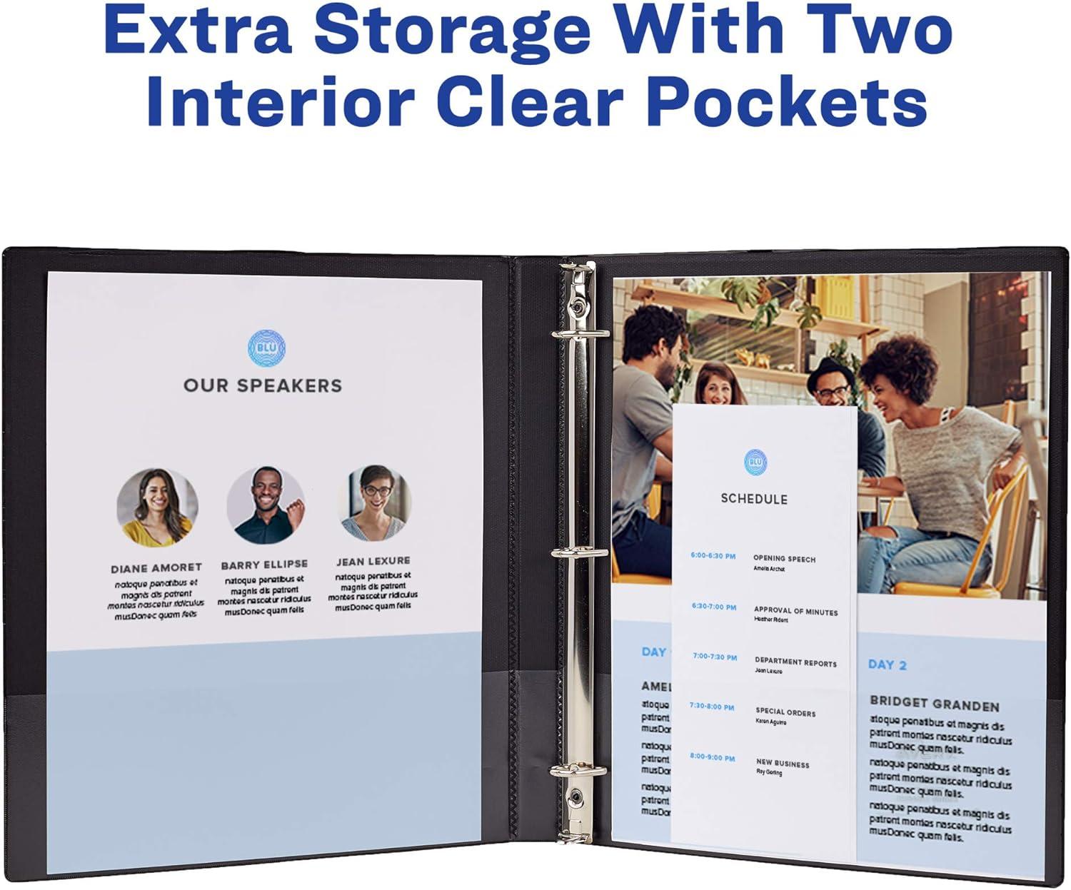 The Avery Economy View 1 inch binder is a basic binder that exceeds expectation. Unlike other basic binders, this Economy binder is fully adhered with a deep-weave polypropylene cover that is resistant to bubbling and surface wrinkles. It also has a textured pattern that is tear-resistant. The interior of this binder is just as impressive as its exterior. With back-mounted rings, your pages will never curl again. Pages lay flat and are easy to turn, while the cover opens and closes without pulling on your papers. Enjoy extra organization and storage capabilities with two interior clear pockets made of nonstick material that won't lift or transfer ink from your documents. This set of 4 black Economy binders is perfect for light usage like filing important documents or building a presentation book. Each binder holds up to 175 sheets of paper with 1 inch capacity rings. Rings are standard 3-hole spaced and accommodate 8.5″ x 11″ pages nicely. All Economy binders are made with PVC-free material. Personalize your view binder using the free templates, fonts, and designs at avery.com/templates.