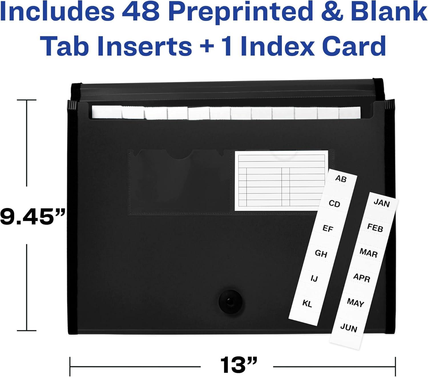Stay organized on the go or at home with the Avery 73553 Black 13-Pocket Expanding File Folder Organizer. Whether you need a document holder to store bills or school folders to organize your class assignments, these expanding accordion-style pocket organizers make it easy to sort and carry your work with you. Carry up to 425 sheets of letter and A4-size paper in the 13 expanding pockets. Made with a durable polypropylene plastic, the organizers are lined along the outside with a fabric trim for extra reinforcement and a softer edge. The elastic cord closure makes sure the pocket folders stay shut so that your contents stay safe. 2 clear card-holder pockets are attached to the inside to store extra business cards or to list contents and other important information. 1 index card is included along with a preprinted set of A-Z and monthly tab inserts. A set of blank, handwritable tab inserts are also included (not printer-compatible). Designed to be durable yet lightweight and portable, the Avery Expanding File Folder lets you easily take your work with you from the office or your classes to your home and back.