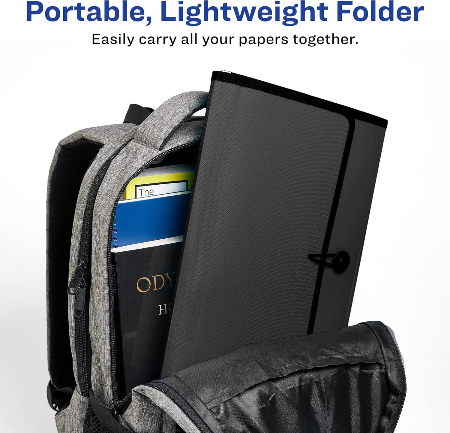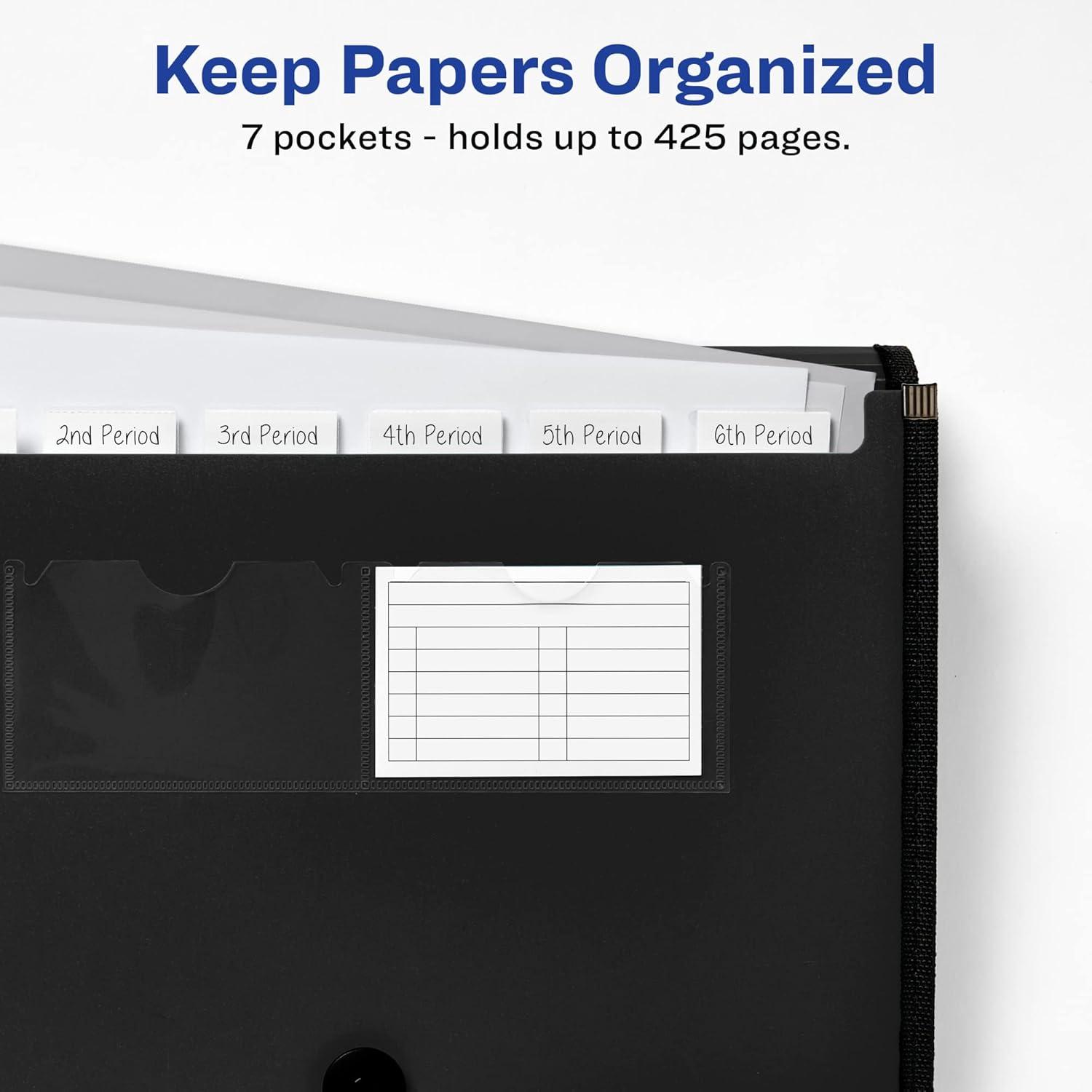 Stay organized on the go or at home with the Avery 73550 Black 7-Pocket Expanding File Folder Organizer. Whether you need a document holder to store bills or school folders to organize your class assignments, these expanding accordion-style pocket organizers make it easy to sort and carry your work with you. Carry up to 425 sheets of letter and A4-size paper in the 7 expanding pockets. Made with a durable polypropylene plastic, the organizers are lined along the outside with a fabric trim for extra reinforcement and a softer edge. The elastic cord closure makes sure the pocket folders stay shut so that your contents stay safe. 2 clear card-holder pockets are attached to the inside to store extra business cards or to list contents and other important information. 1 index card is included along with a preprinted set of A-Z and monthly tab inserts. A set of blank, handwritable tab inserts are also included (not printer-compatible). Designed to be durable yet lightweight and portable, the Avery Expanding File Folder lets you easily take your work with you from the office or your classes to your home and back.