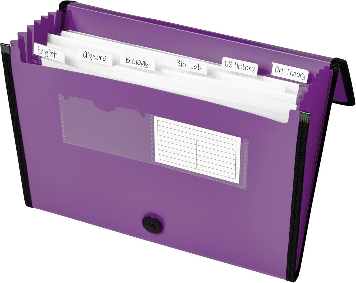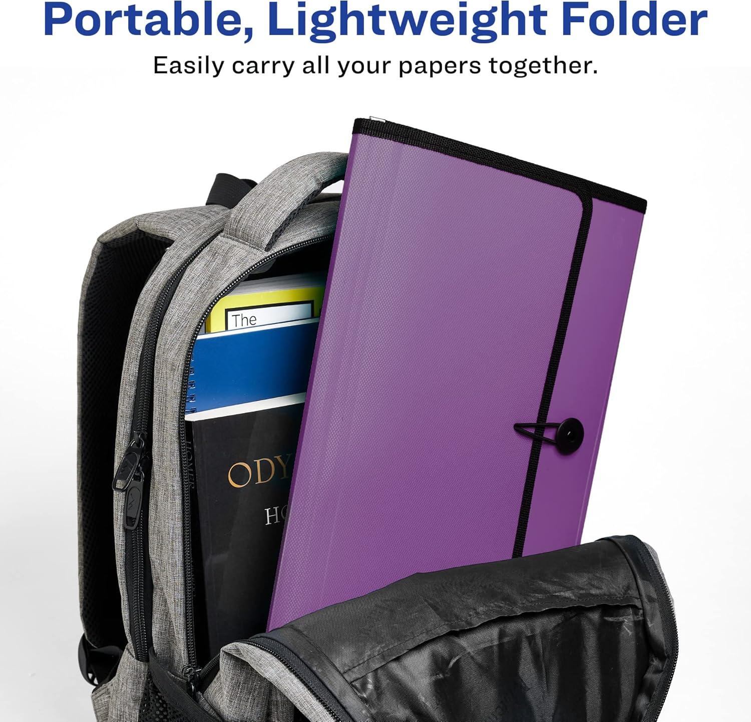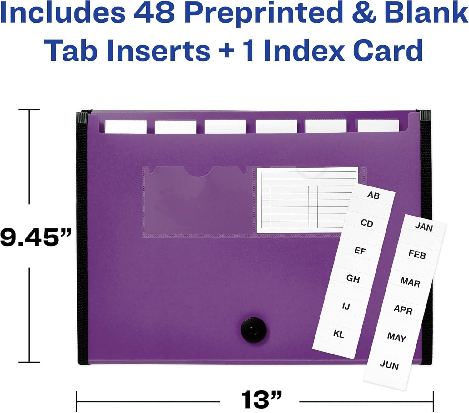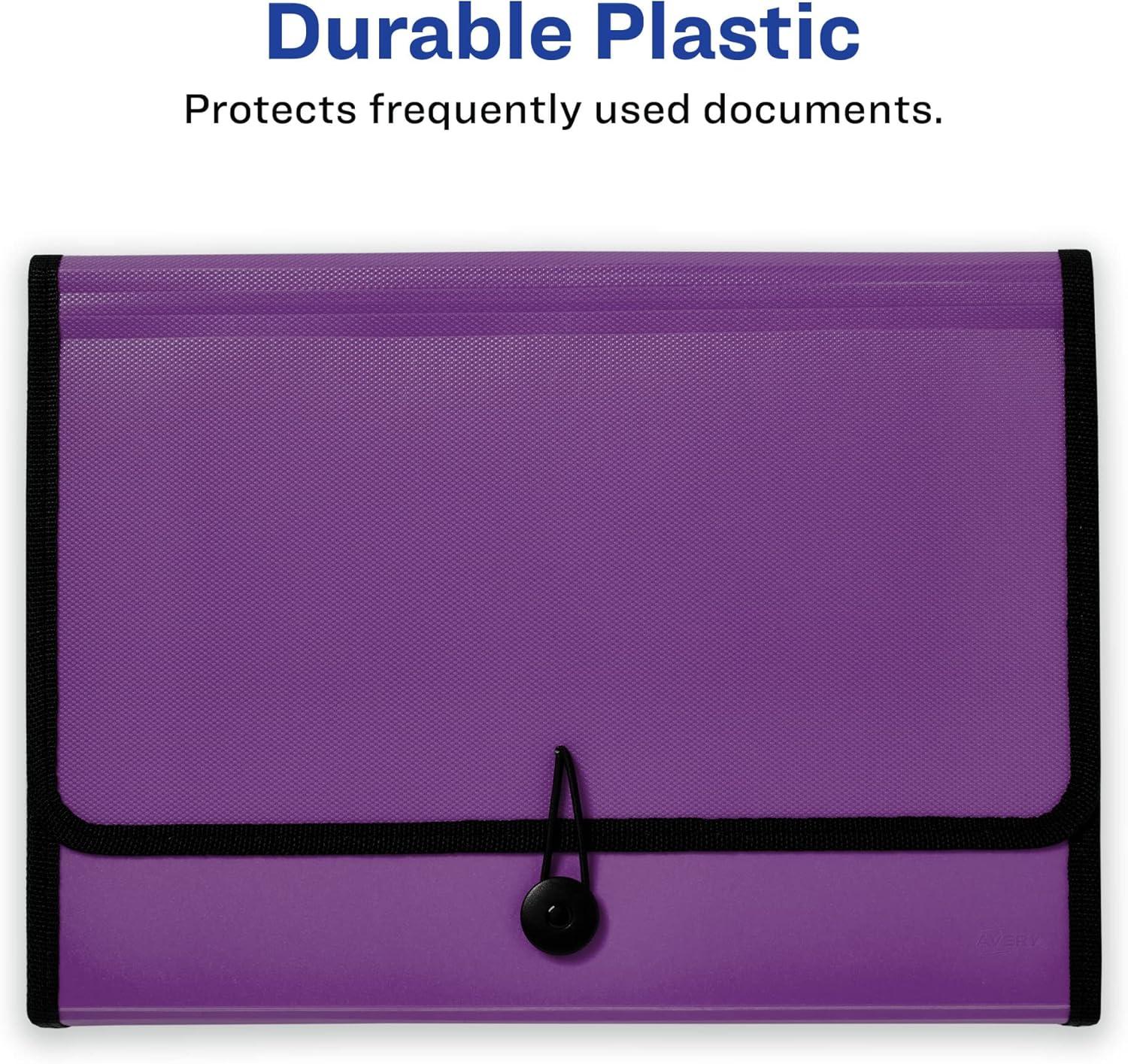 Stay organized on the go or at home with the Avery 73550 Black 7-Pocket Expanding File Folder Organizer. Whether you need a document holder to store bills or school folders to organize your class assignments, these expanding accordion-style pocket organizers make it easy to sort and carry your work with you. Carry up to 425 sheets of letter and A4-size paper in the 7 expanding pockets. Made with a durable polypropylene plastic, the organizers are lined along the outside with a fabric trim for extra reinforcement and a softer edge. The elastic cord closure makes sure the pocket folders stay shut so that your contents stay safe. 2 clear card-holder pockets are attached to the inside to store extra business cards or to list contents and other important information. 1 index card is included along with a preprinted set of A-Z and monthly tab inserts. A set of blank, handwritable tab inserts are also included (not printer-compatible). Designed to be durable yet lightweight and portable, the Avery Expanding File Folder lets you easily take your work with you from the office or your classes to your home and back.