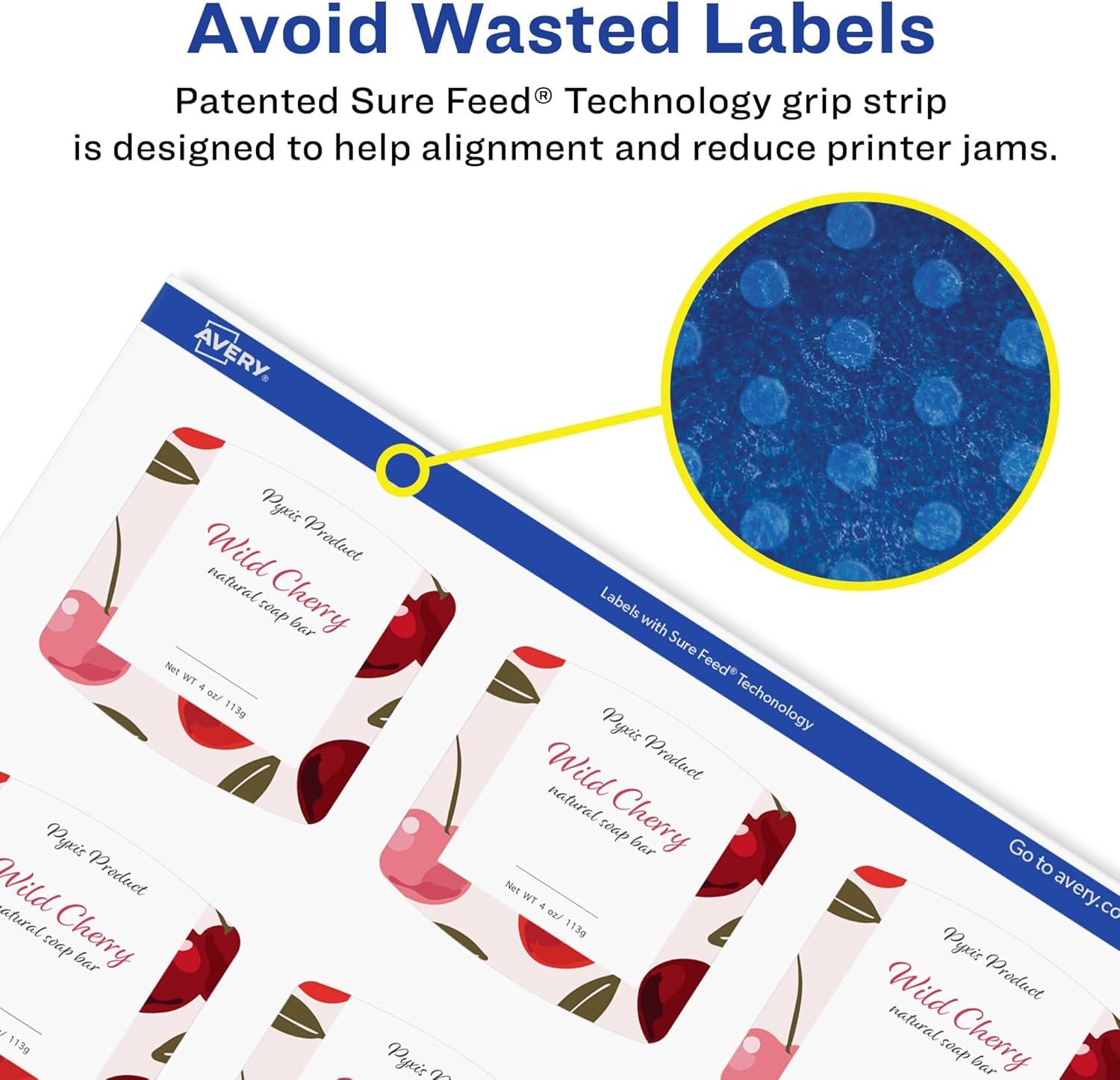 Avery labels with proprietary Sure Feed technology provide a more reliable feed through your printer, preventing misalignments and jams